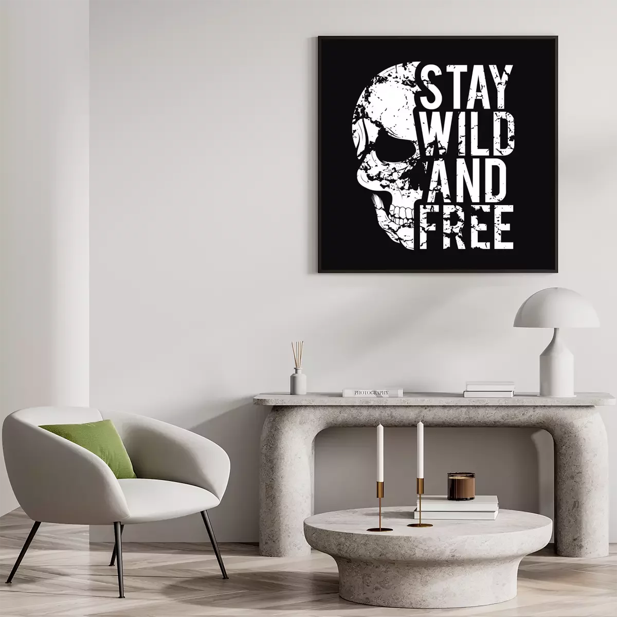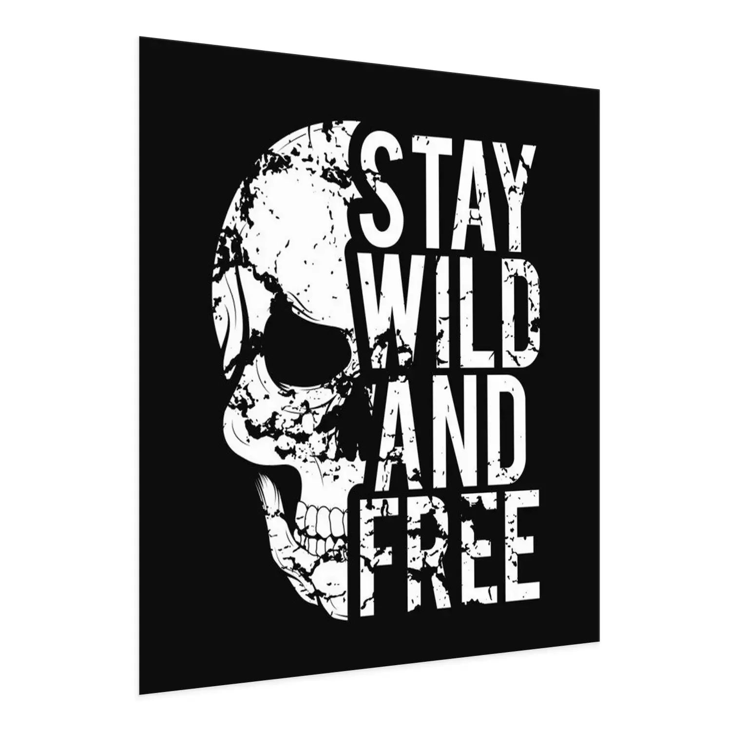 Poster: T-shirtontwerp met schedel en grunge textuur. Vintage typografie voor tee-print met slogan blijft wild en gratis. T-shirt grafisch