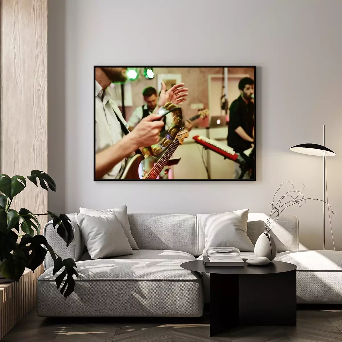 Poster tape spelen op een feest, elektrische gitaar,