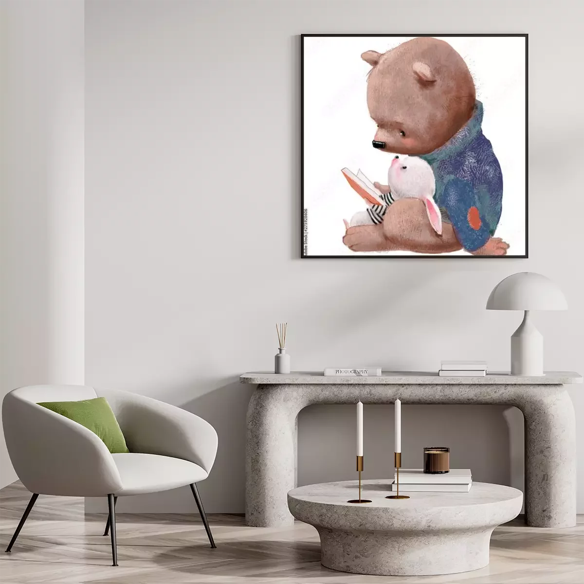 Poster: Teddybeer en konijntje die een boek lezen