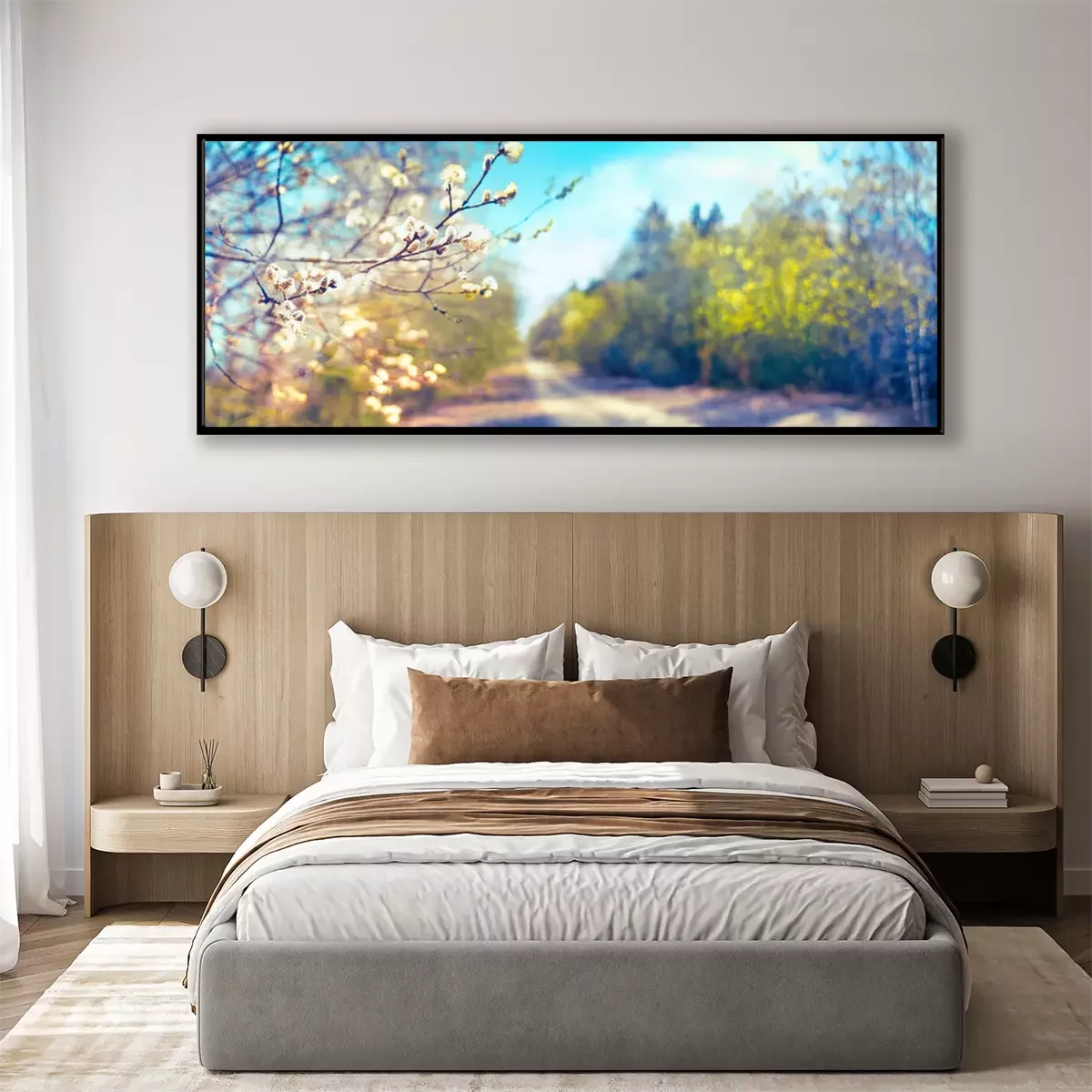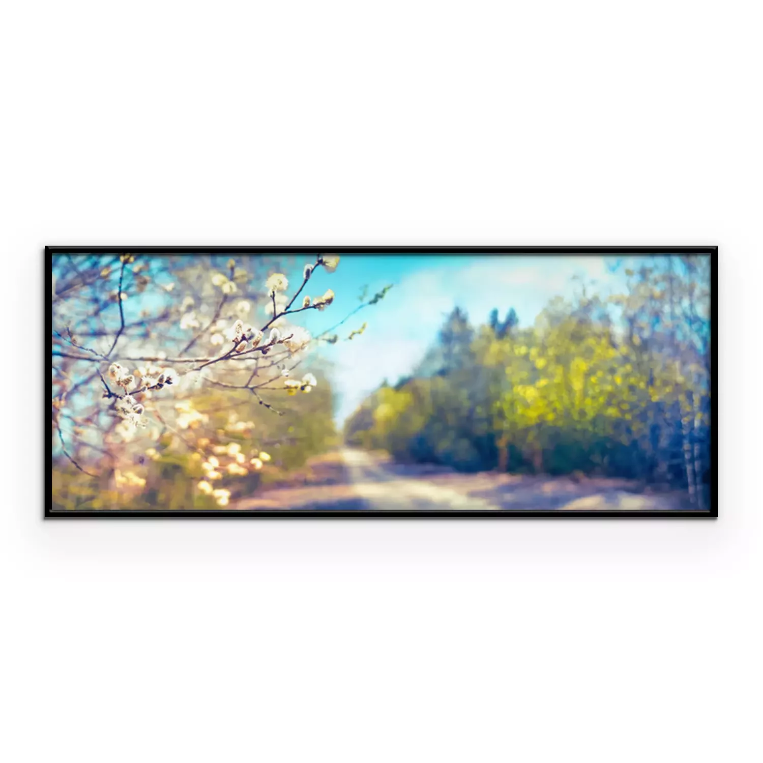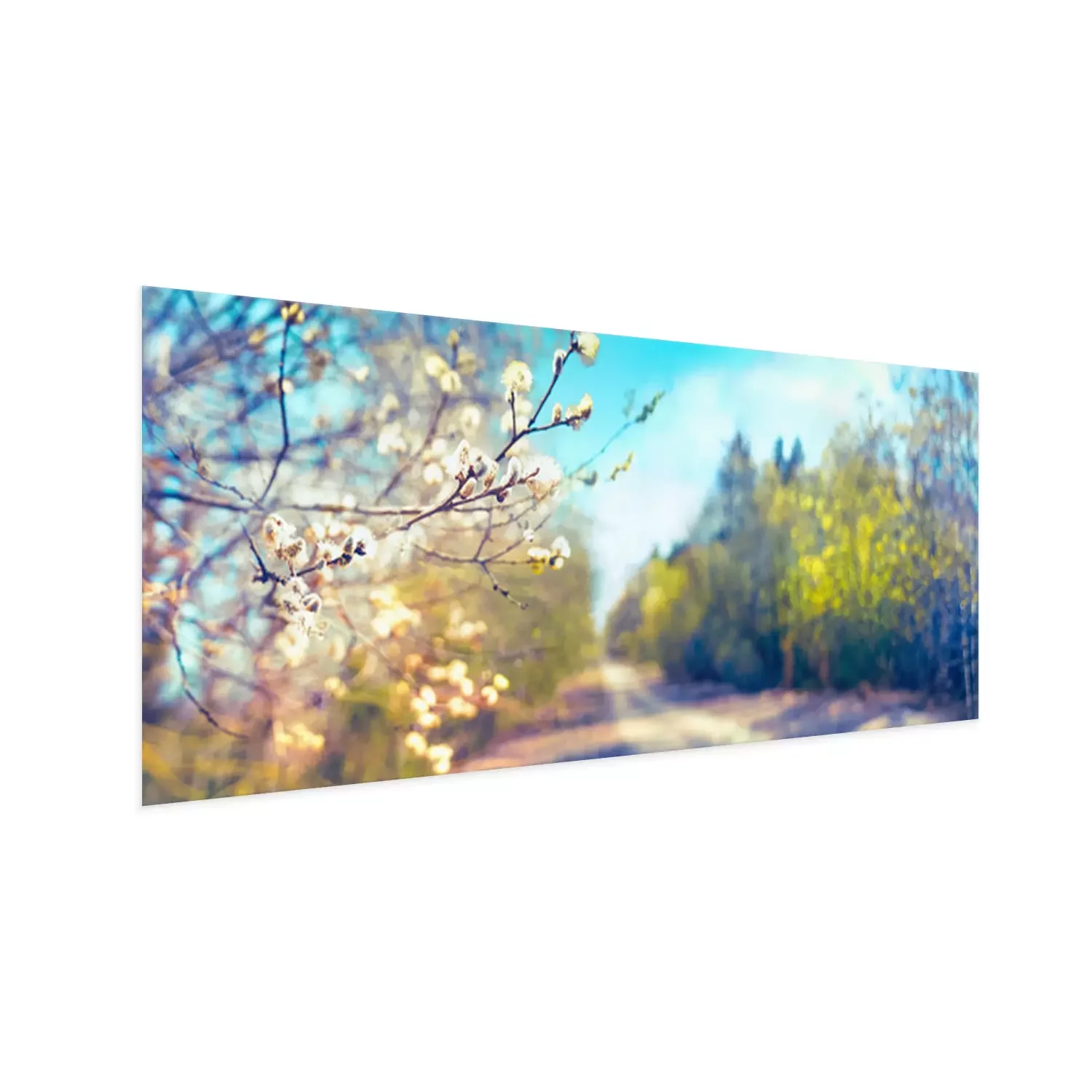 Defocused spring landscape. Beautiful nature with flowering willow branches and  rural road against blue sky and bright sunlight, soft focus. Ultra wide format.