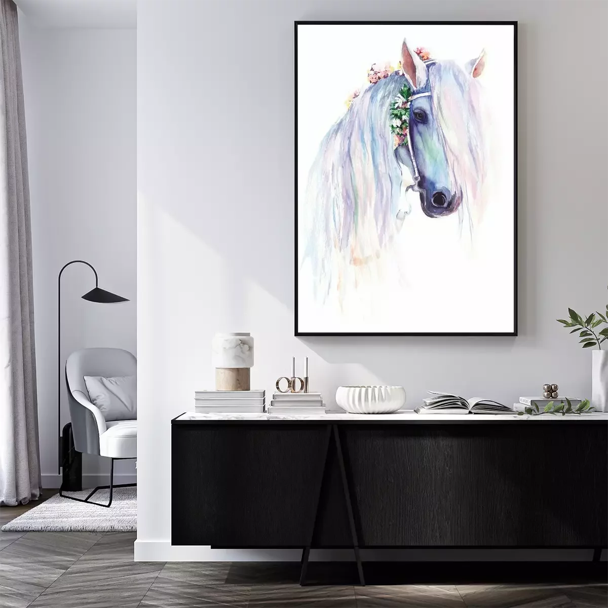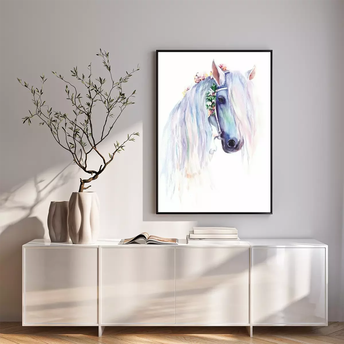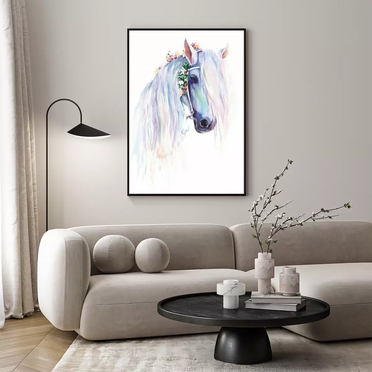 Posters met paarden zijn een van de meest populaire patronen voor interieurdecoratie. Dit motief sluit aan bij de lange traditie van afbeeldingen van deze dieren, gecreëerd door bekende schilders en tekenaars. Portretten zijn in verschillende tijdperken en stijlen gemaakt, en wij hebben gekozen voor een meisjesachtige, stemmige poster. Paard met een witte vacht wordt getoond in een delicate aquarelschildering in pasteltinten, wat het geheel een uiterst subtiele uitstraling geeft. Op het hoofd, verweven in de manen, heeft het veldbloemen, wat zorgt voor een romantische sfeer. Dit is precies de reden waarom dergelijke posters met paarden perfect zullen passen in stemmige en meisjesachtige arrangementen. Het zal echter niet alleen een tienermeisje of een meisje dat van deze dieren houdt, aanspreken. Dergelijke posters met paarden zullen bijvoorbeeld prachtig staan in een slaapkamer ingericht in de shabby chic stijl, waar gebleekte meubels en textiel met plantaardige patronen te vinden zijn. Ze zullen overeenkomen met de bloemen die op de muurdecoratie te vinden zijn. Om een wat elegantere look te bereiken, is het de moeite waard om na te denken over een witte lijst waarin de poster wordt ingelijst. Het paard afgebeeld op de print, die lijkt op een aquarelschildering, zal ook passen in een boho-stijl arrangement. Zo'n patroon kan worden gecombineerd met een gevlochten macramé, die boven of onder het dierportret wordt gehangen, wat een zeer effectieve compositie oplevert. Dergelijke posters met witte paarden en bloemen verweven in de manen raden we ook aan voor de kamer van een meisje - zowel een kind als een tiener. Dit is een perfecte oplossing als ze paardrijdt. Dan zal het aquarelportret niet alleen een kamerdecoratie zijn, maar ook een uitstekende illustratie van het meisje haar passie. De lichte kleurstelling is een groot voordeel van de door ons gekozen poster. Paard met een lichte vacht op een witte achtergrond zal het interieur niet overweldigen, waardoor het patroon zelfs in een zeer kleine kamer prachtig zal staan. Omdat het geen kinderachtige posters zijn, zijn paarden aan de muur in een meisjesachtige inrichting een decoratie worden voor de komende jaren, waaruit het kleine meisje niet snel zal groeien.