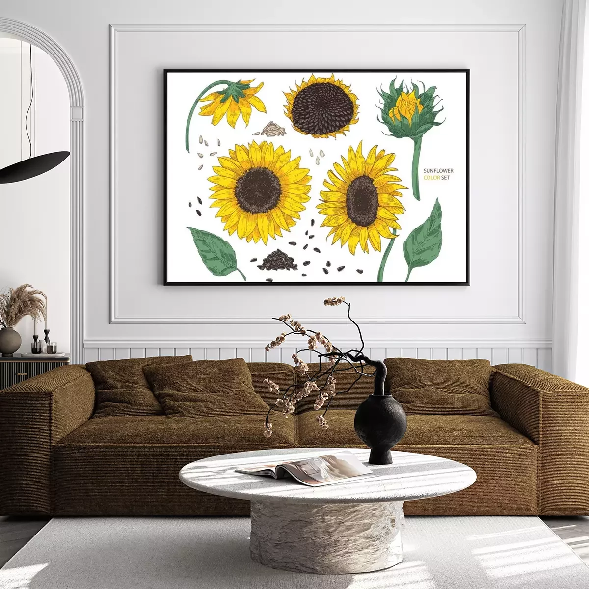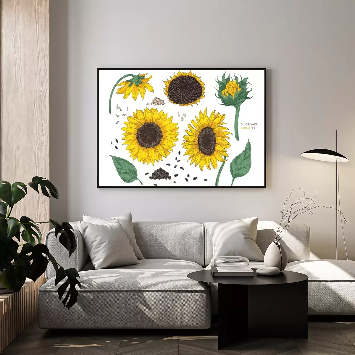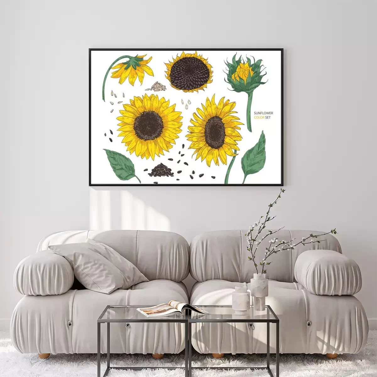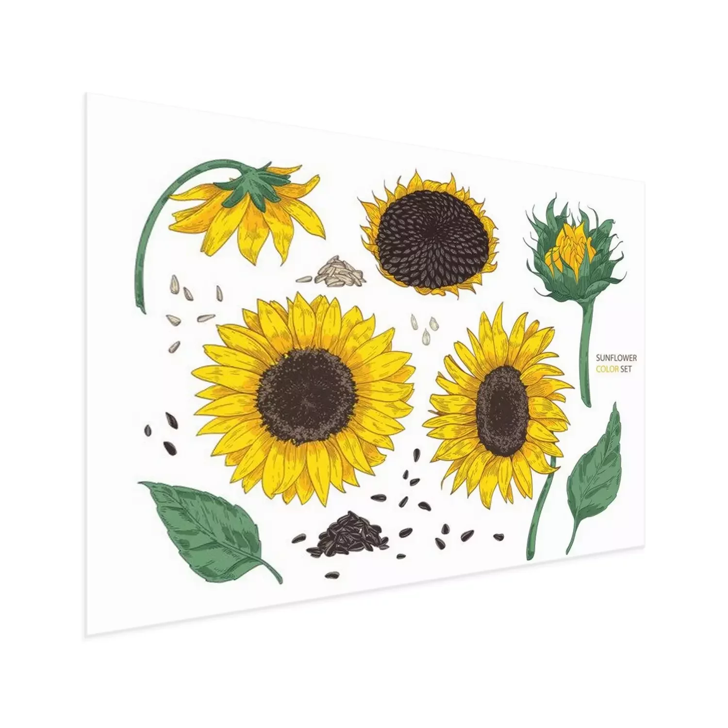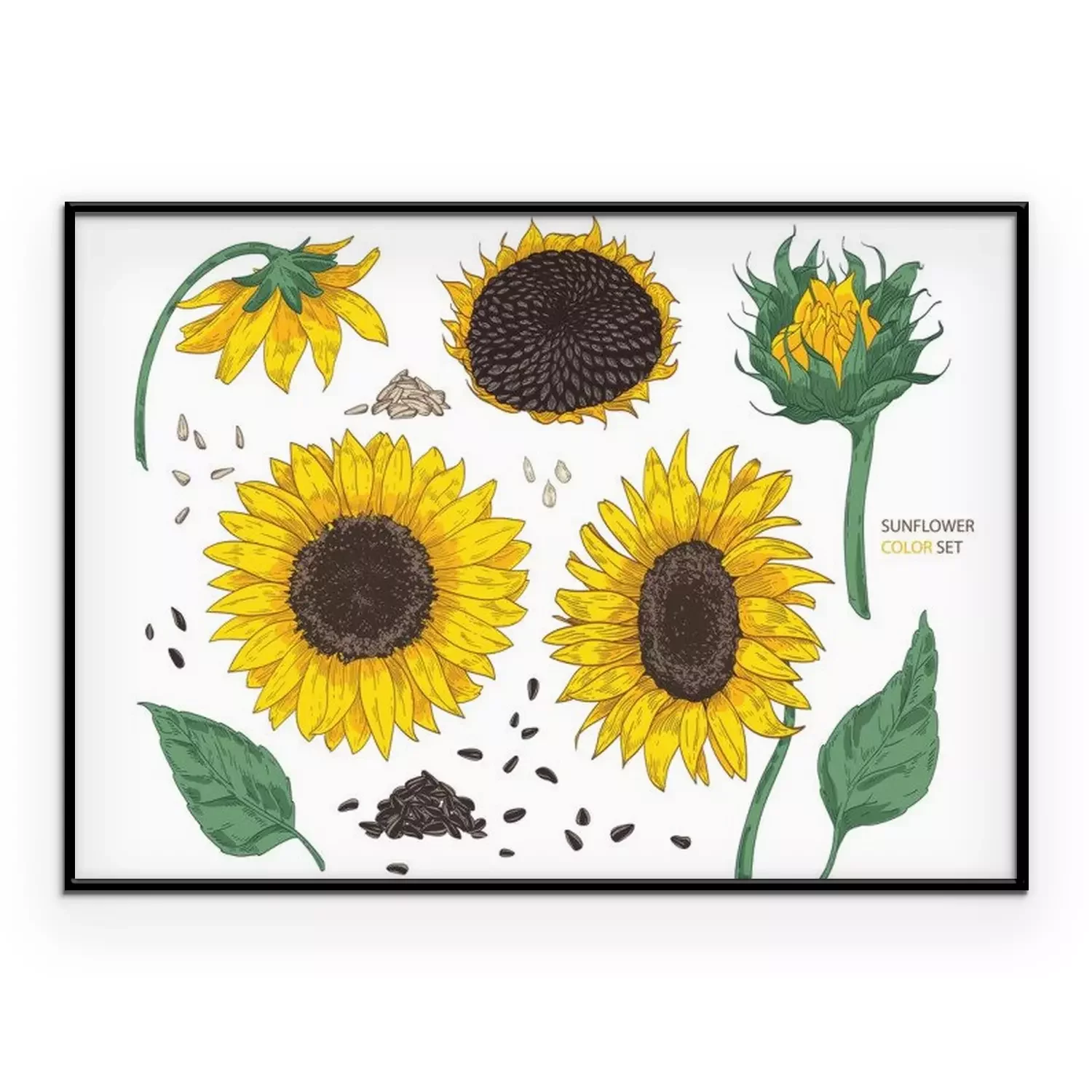 Poster: Tekening van rijpe zonnebloemen met zaden