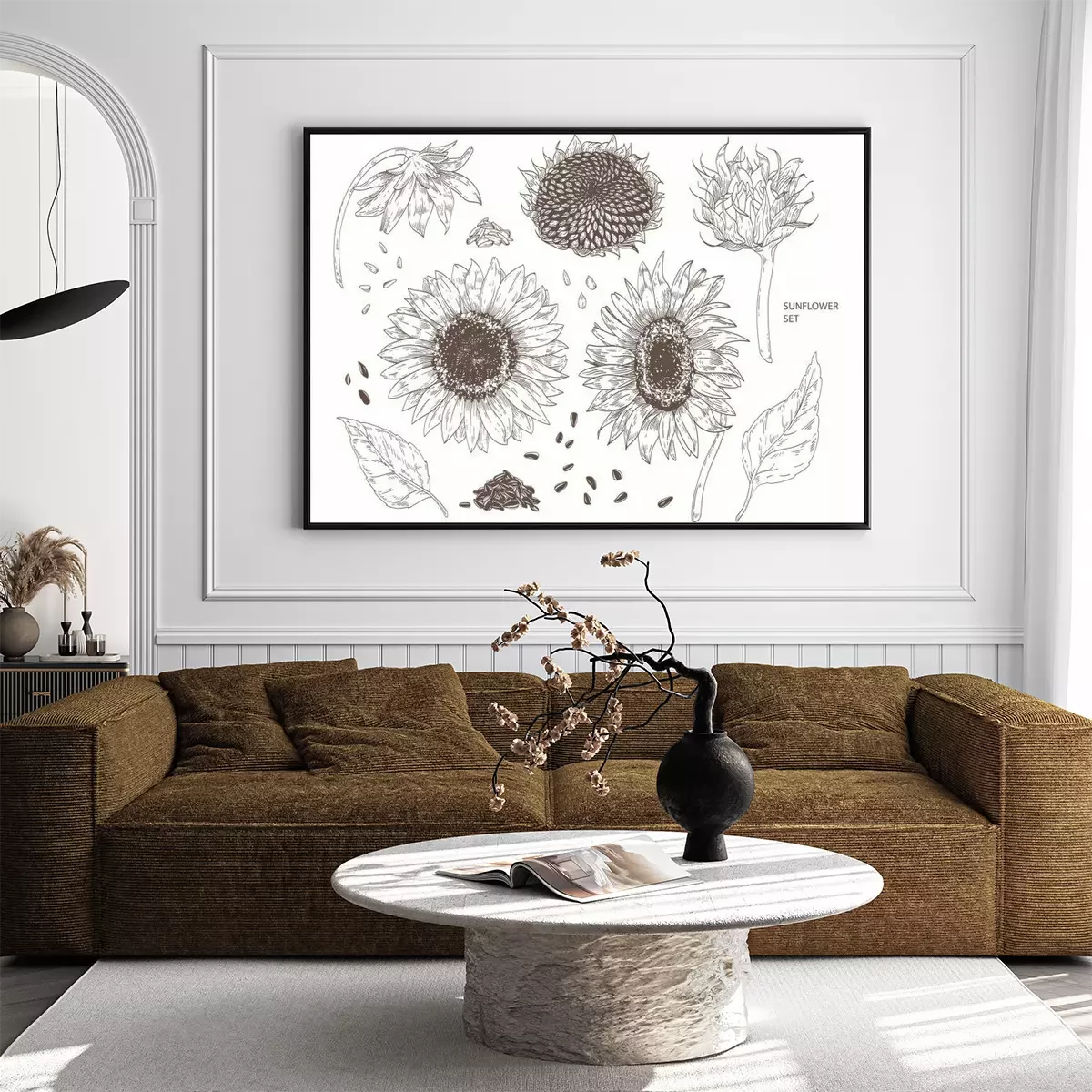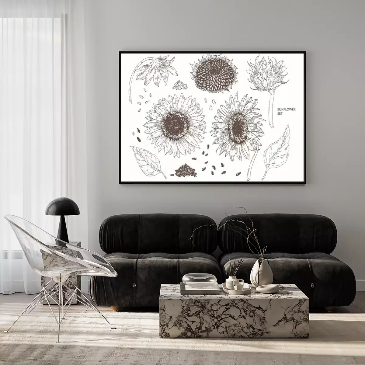 Floral seamless pattern with sunflower heads. Botanical backdrop with blooming flower or cultivated crop hand drawn on white background. Natural vector illustration in vintage style for fabric print.