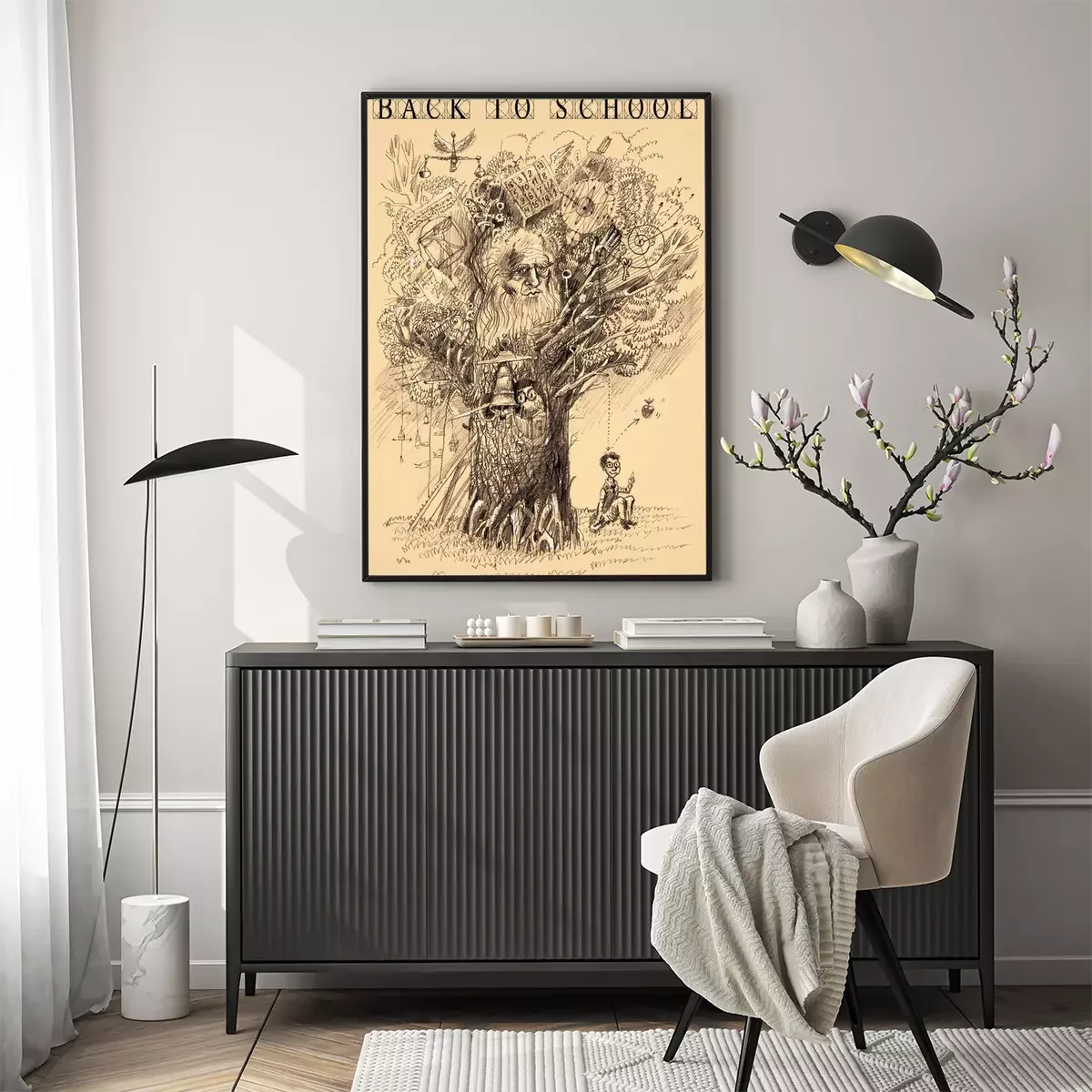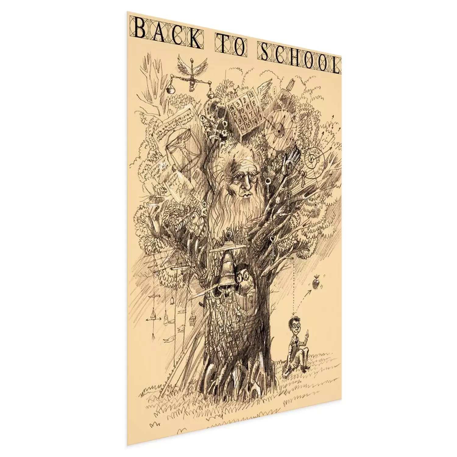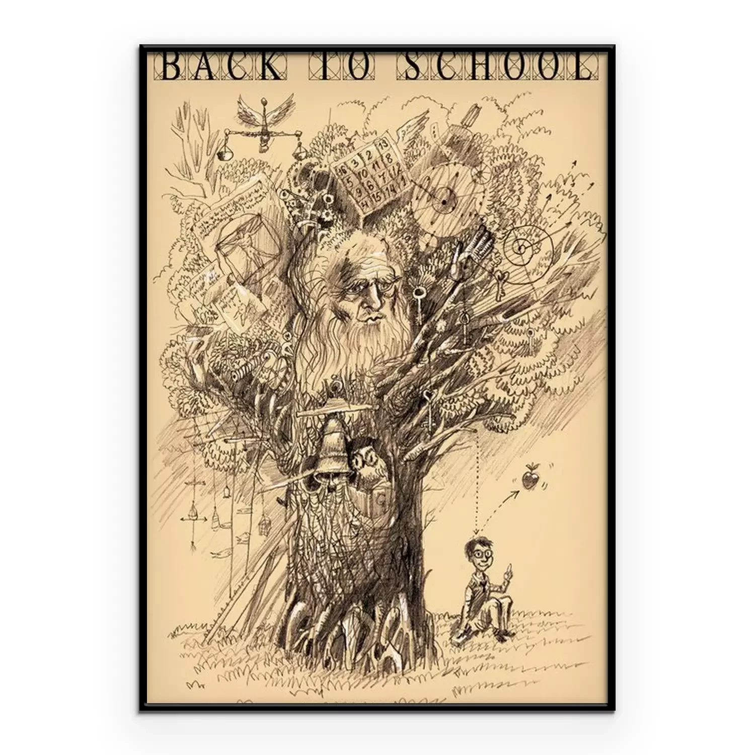 Poster: Terug naar school poster.Tree van Knowledge.The wetenschapper maakt ontdekking. Metafoor van het wetenschappelijk denken. potloodtekening