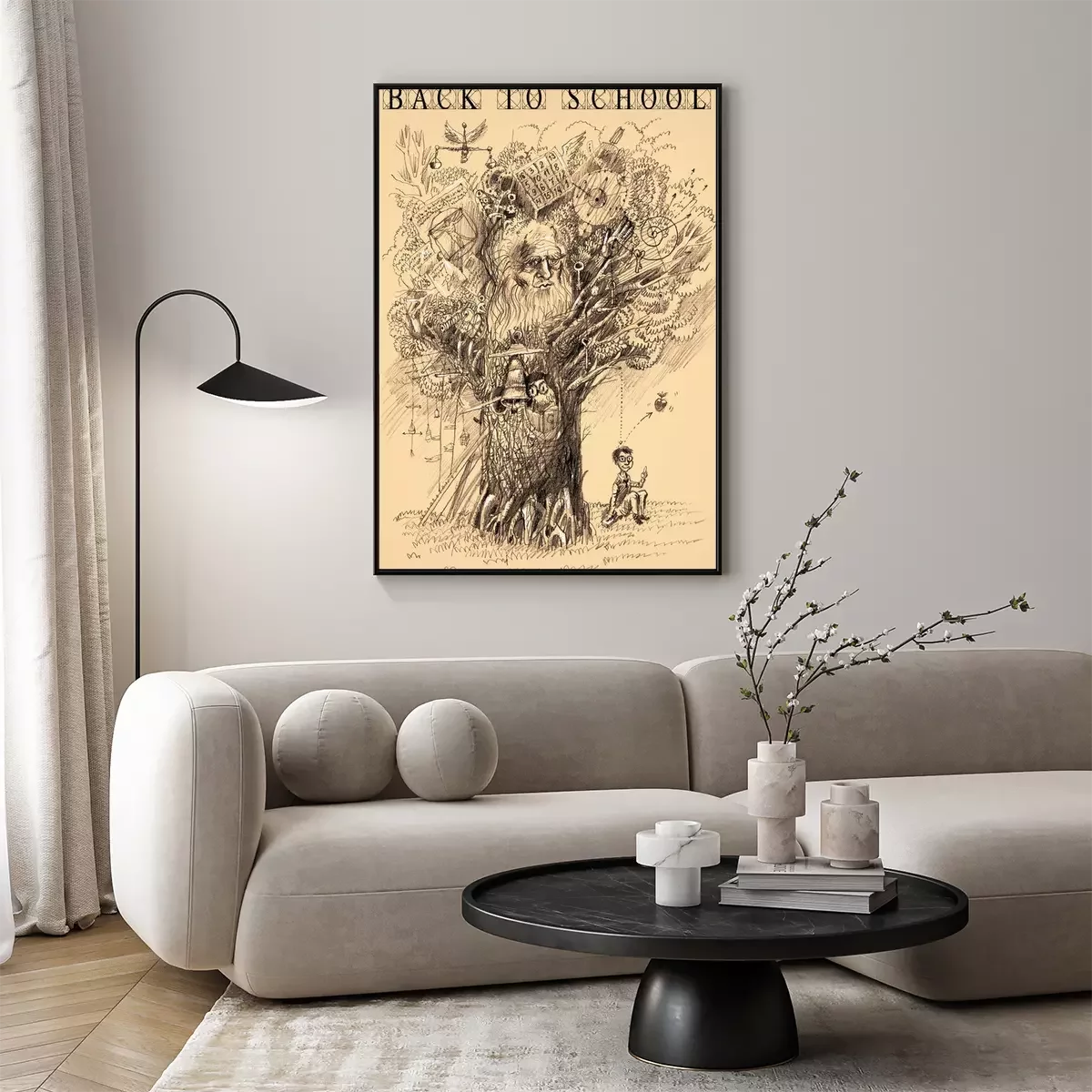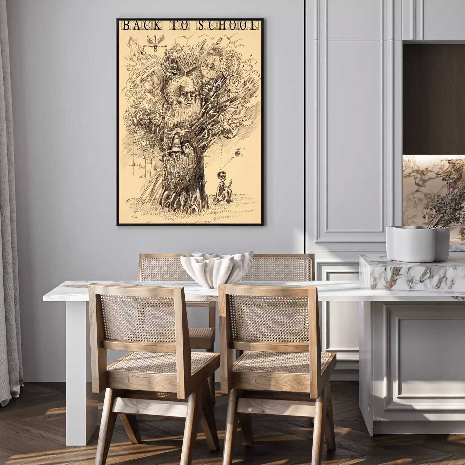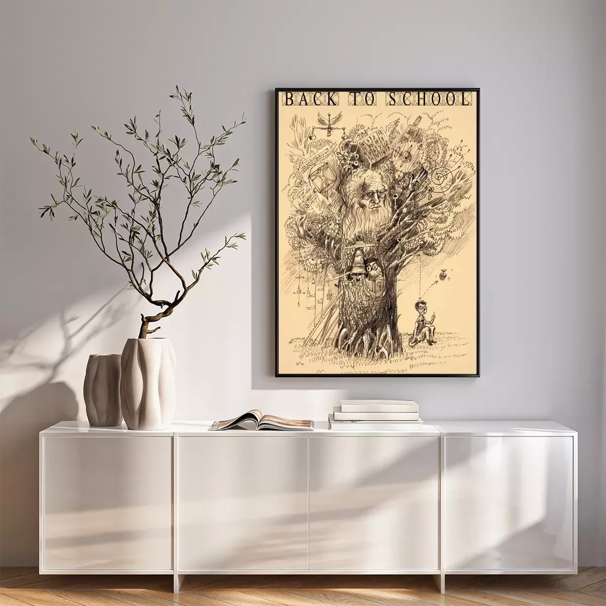 Poster: Terug naar school poster.Tree van Knowledge.The wetenschapper maakt ontdekking. Metafoor van het wetenschappelijk denken. potloodtekening