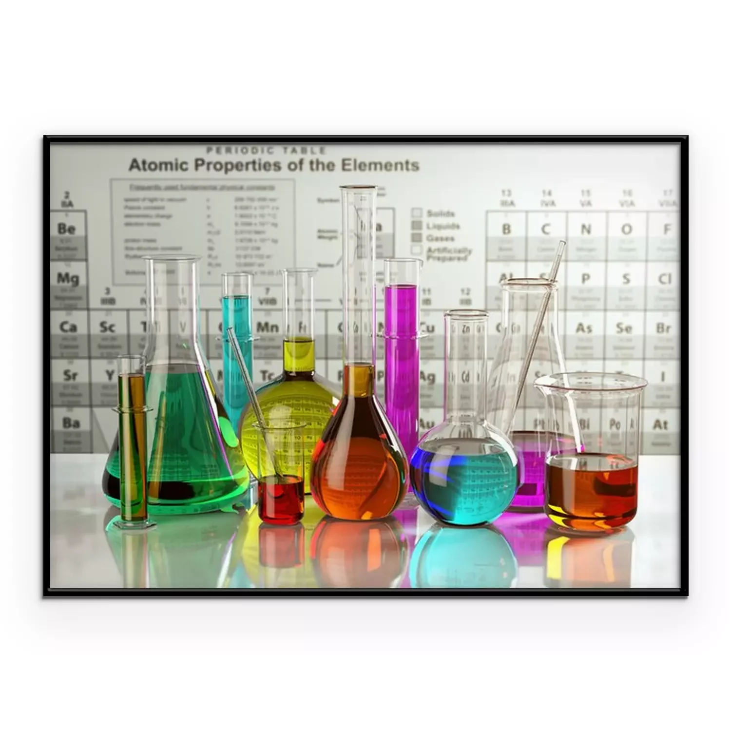 Poster Test glazen kolven en buizen met gekleurde oplossingen op het periodiek systeem der elementen. Laboratoriumglaswerk. Wetenschapschemie en onderzoekconcept.