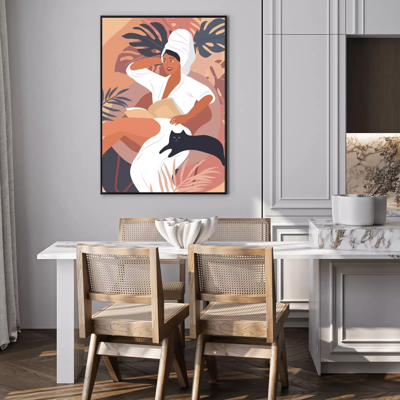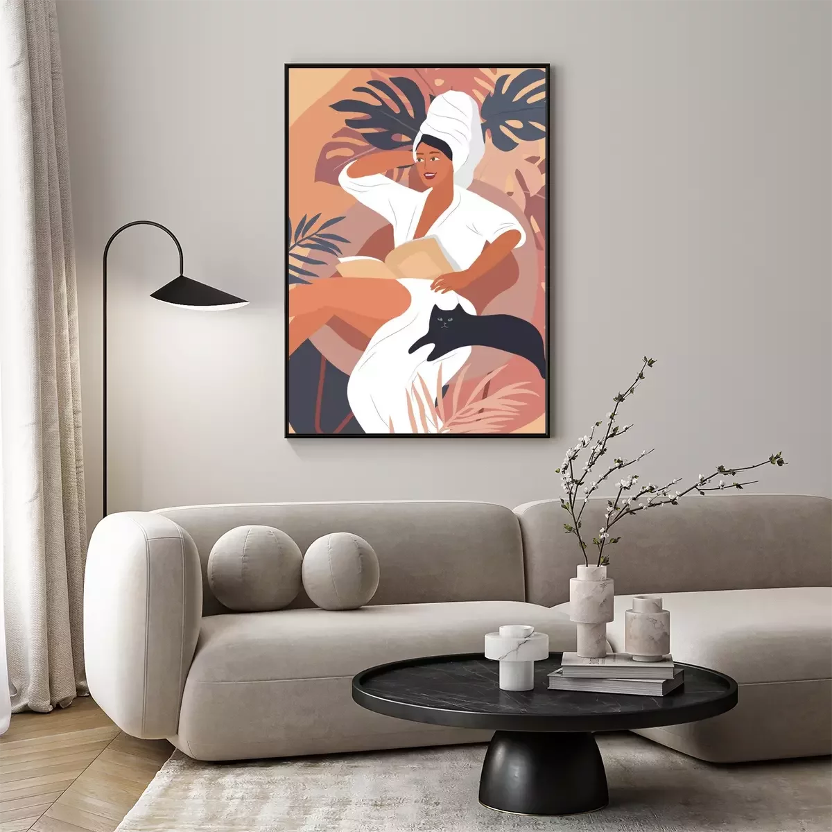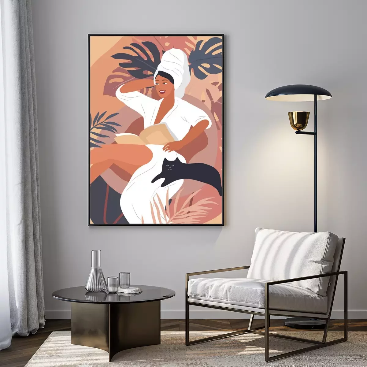Poster: Tevreden vrouw met een kat aan haar zijde