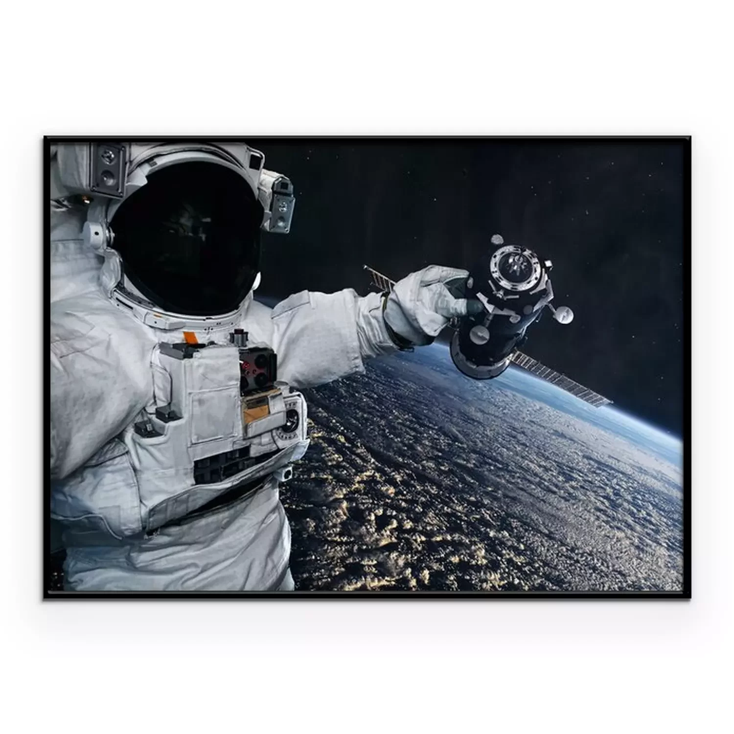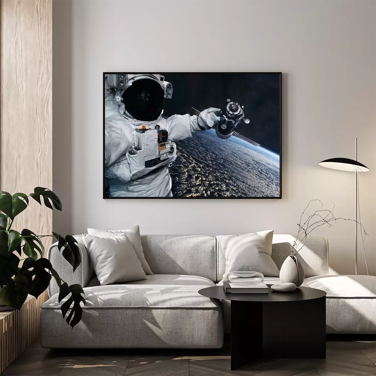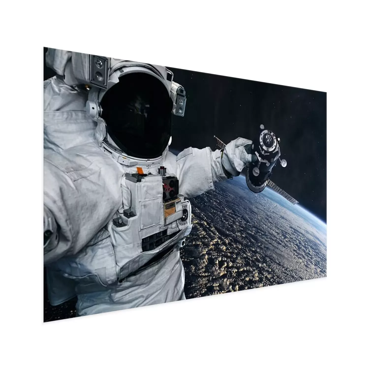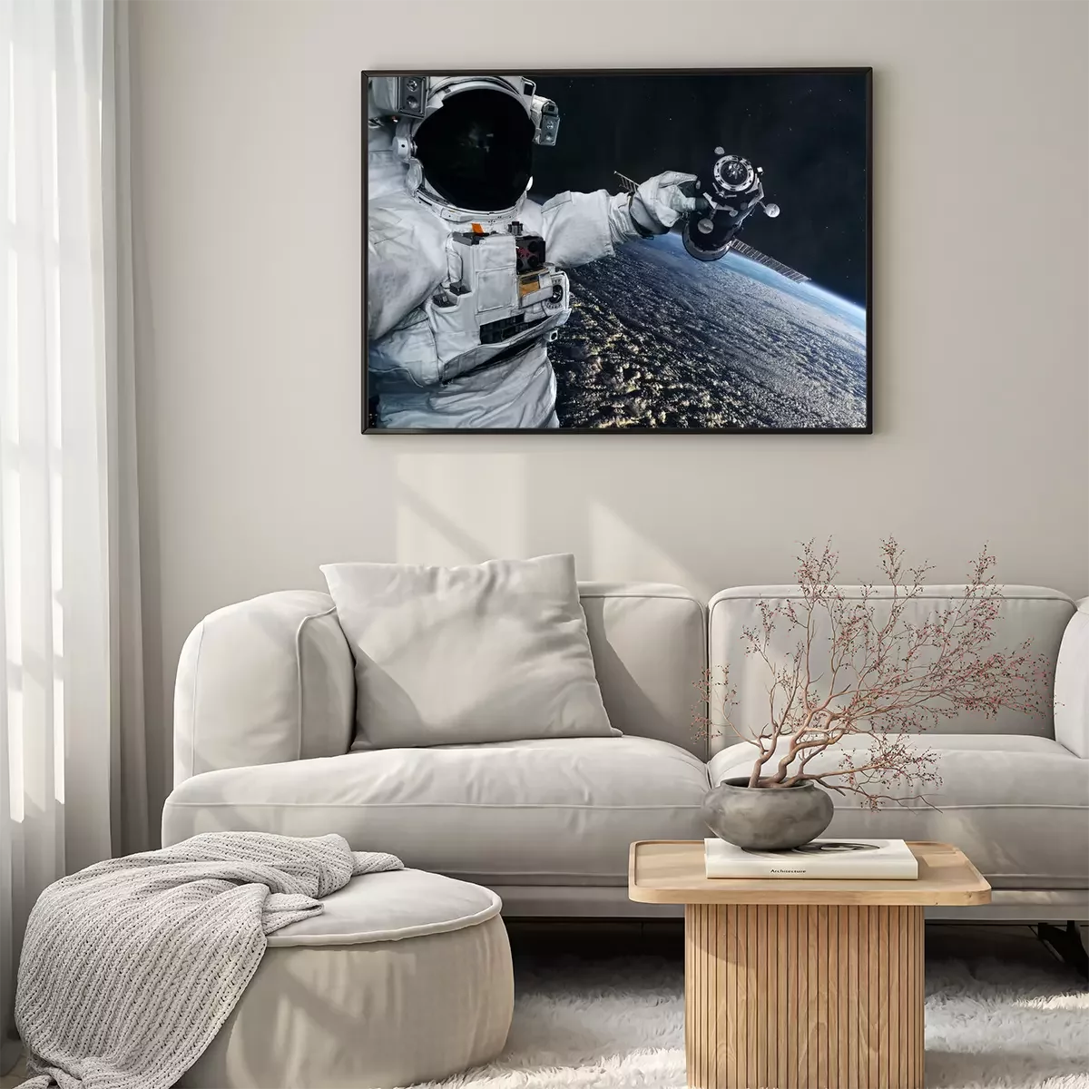 Poster: The astronaut holds in his hand a space station in orbit of the Earth. Solar system. Science fiction. Elements of this image furnished by NASA