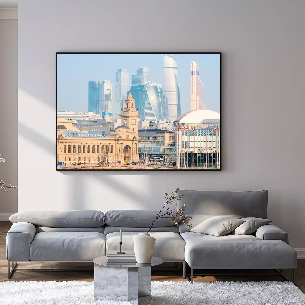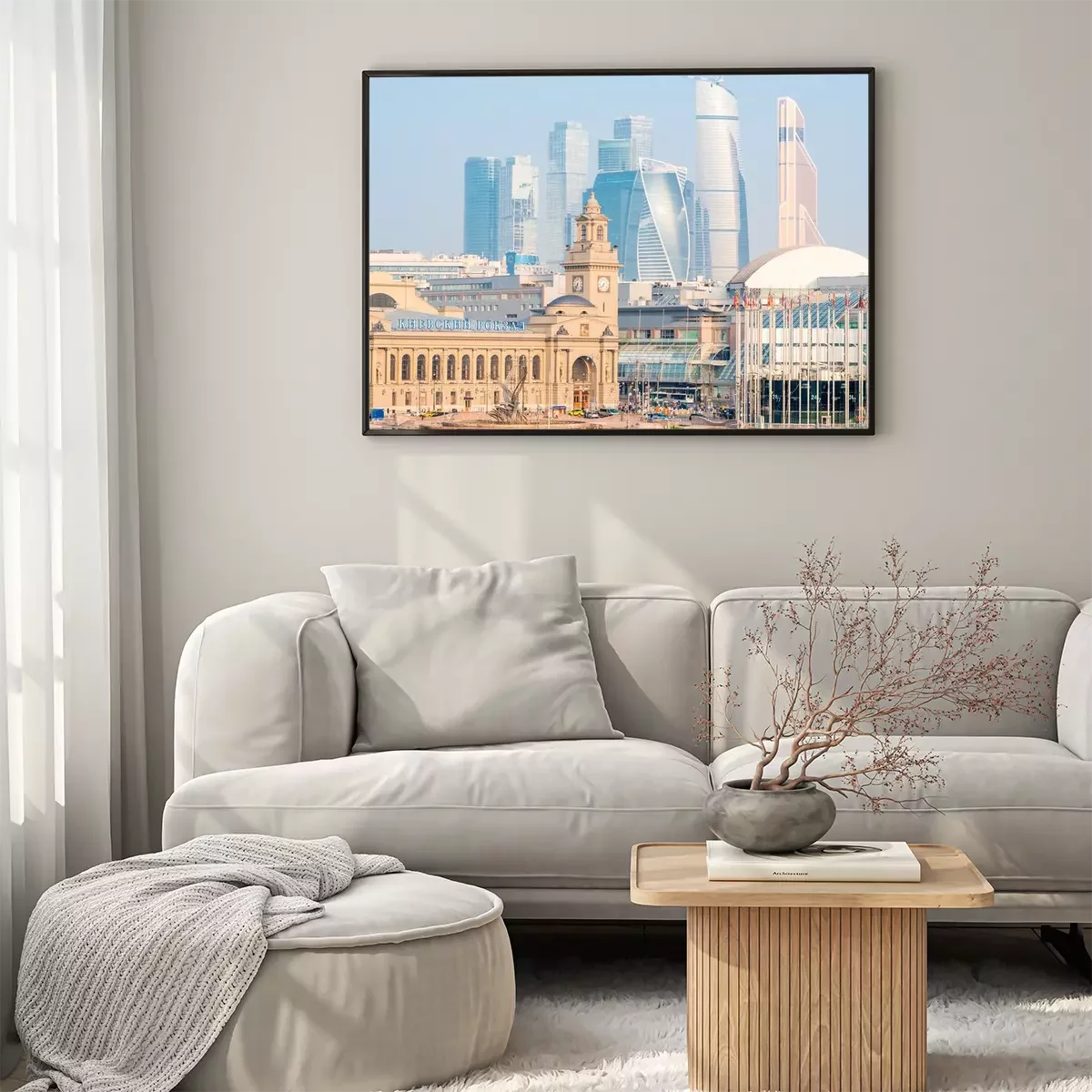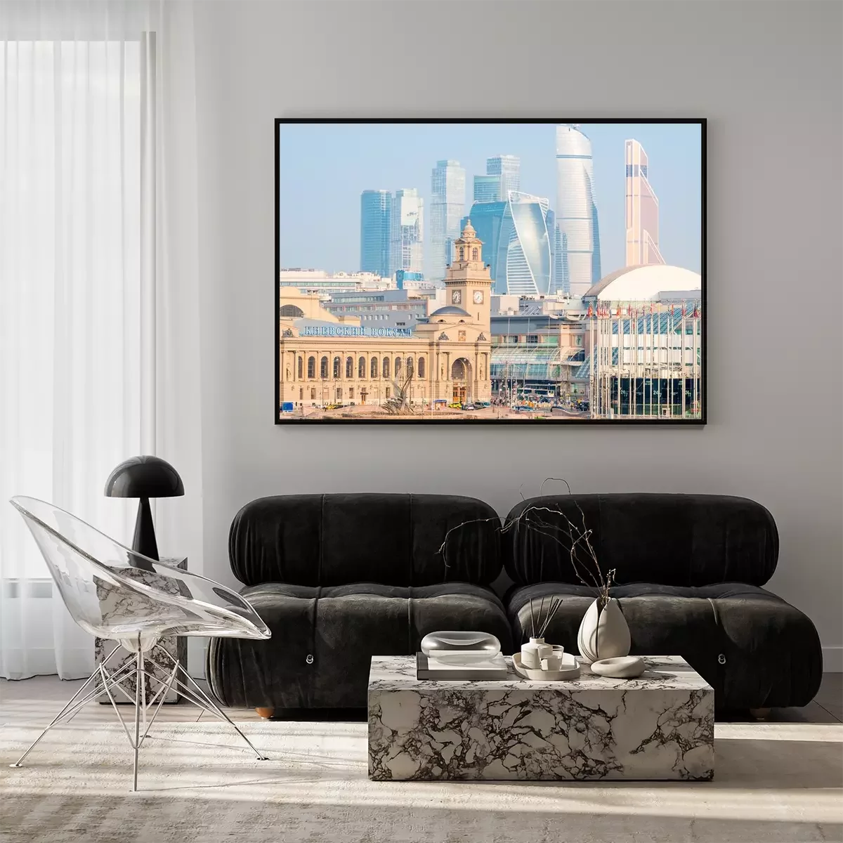 Poster: The building of the Kiev railway station of Moscow and the tall skyscrapers of Moscow City