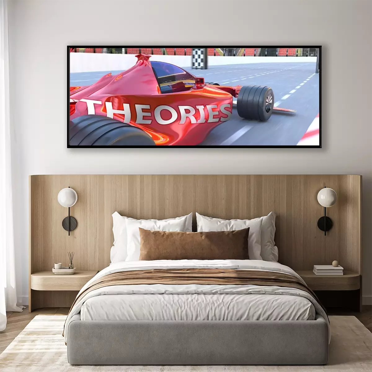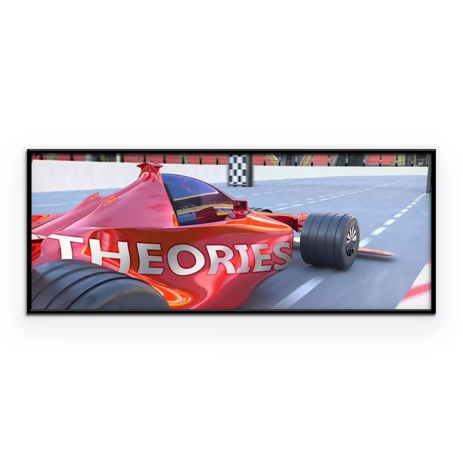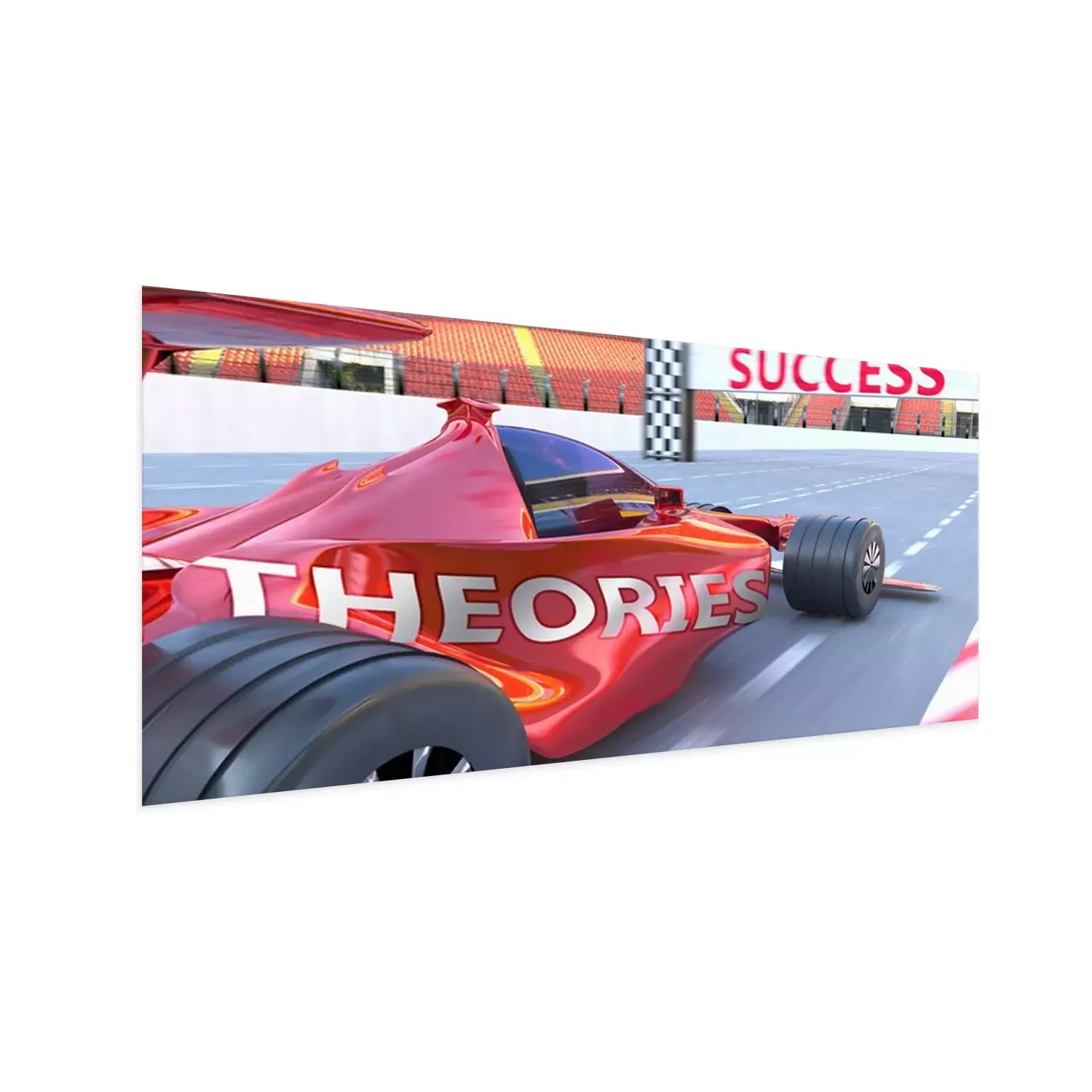 Poster: Theories and success - pictured as word Theories and a f1 car, to symbolize that Theories can help achieving success and prosperity in life and business, 3d illustration