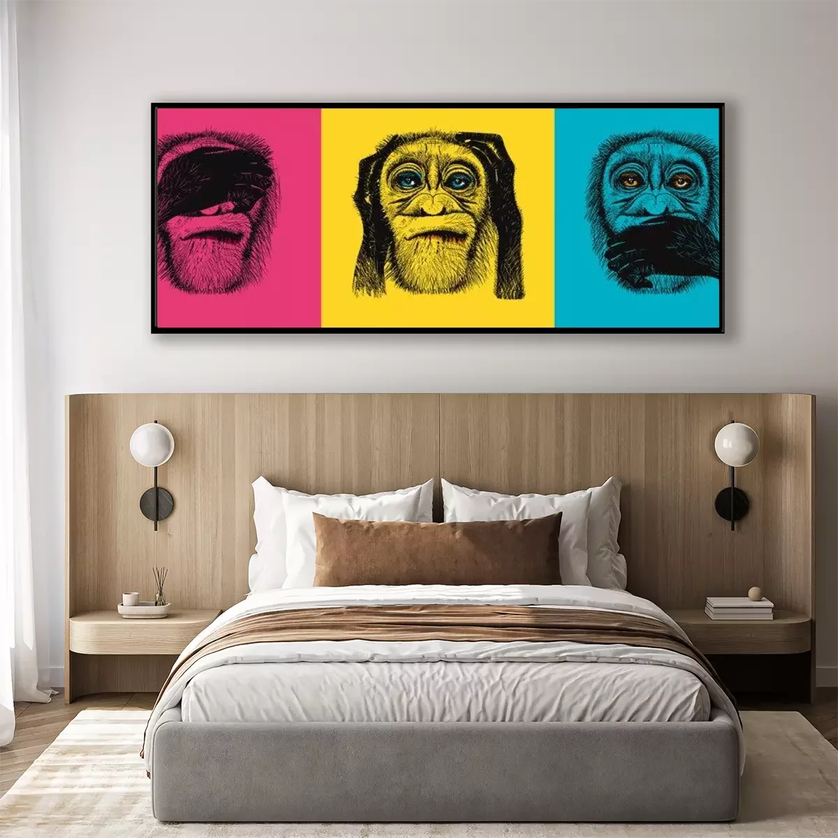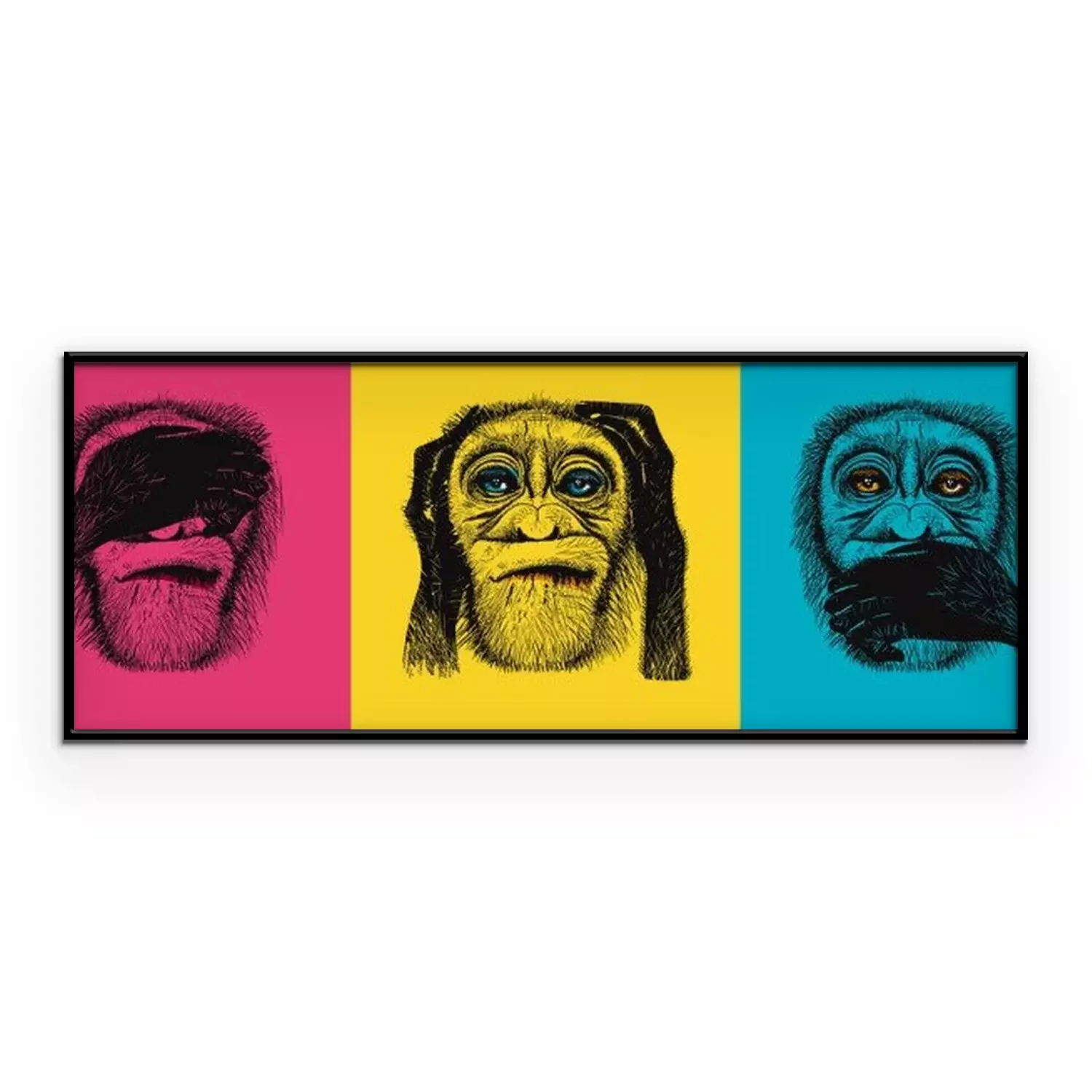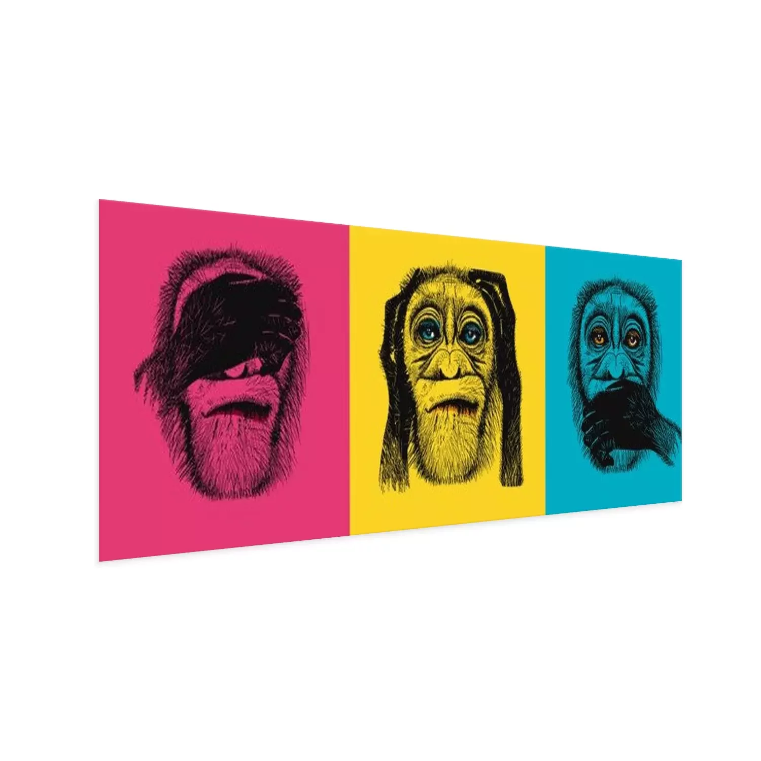 Poster: Three monkeys, I don't see anything, I don't hear anything, I won't say anything to anyone. Allegory of ignoring problems and dangers. Three monkeys on a coloured background in the style of pop art