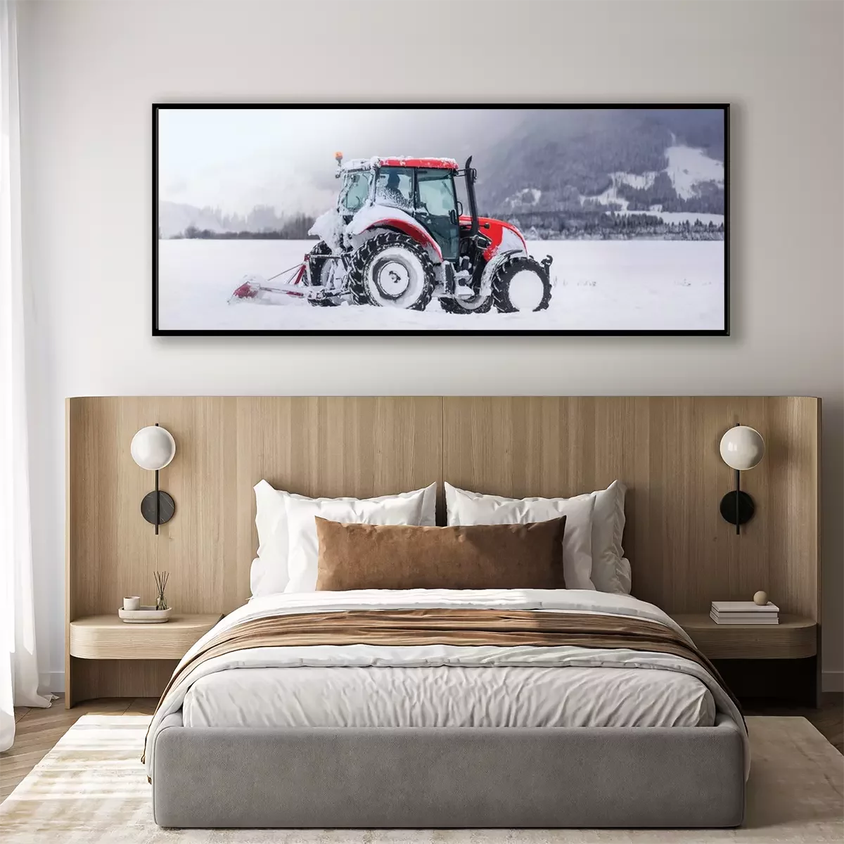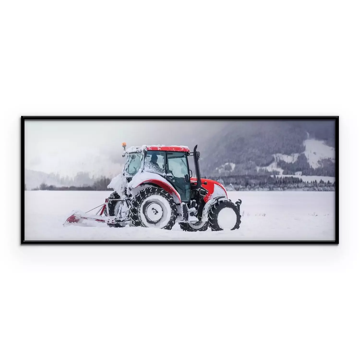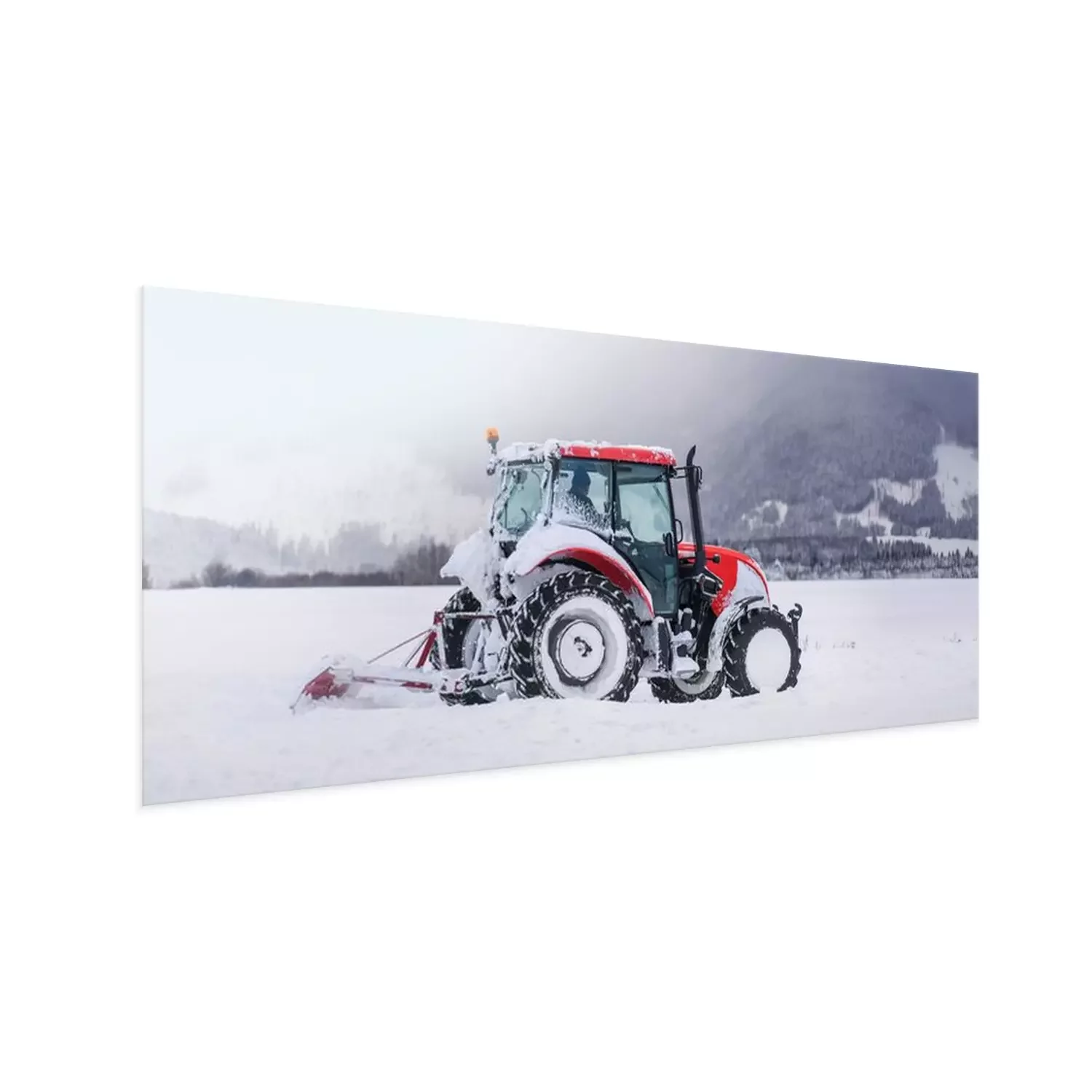 Poster: Tractor in winter plowing street or road, agricultural and snow on fields.