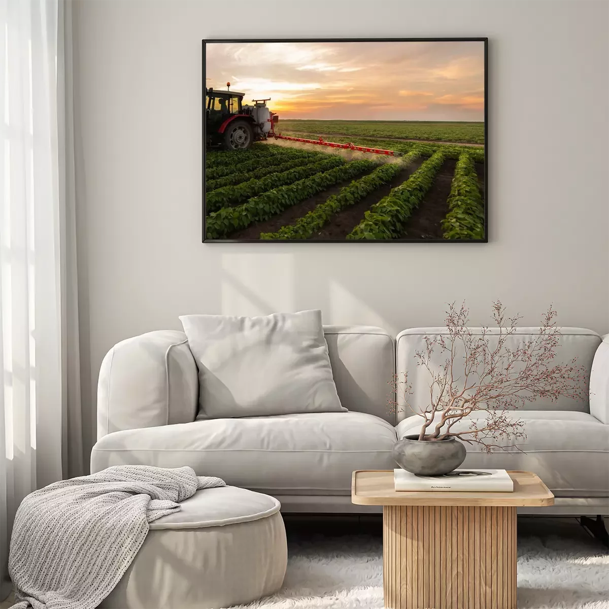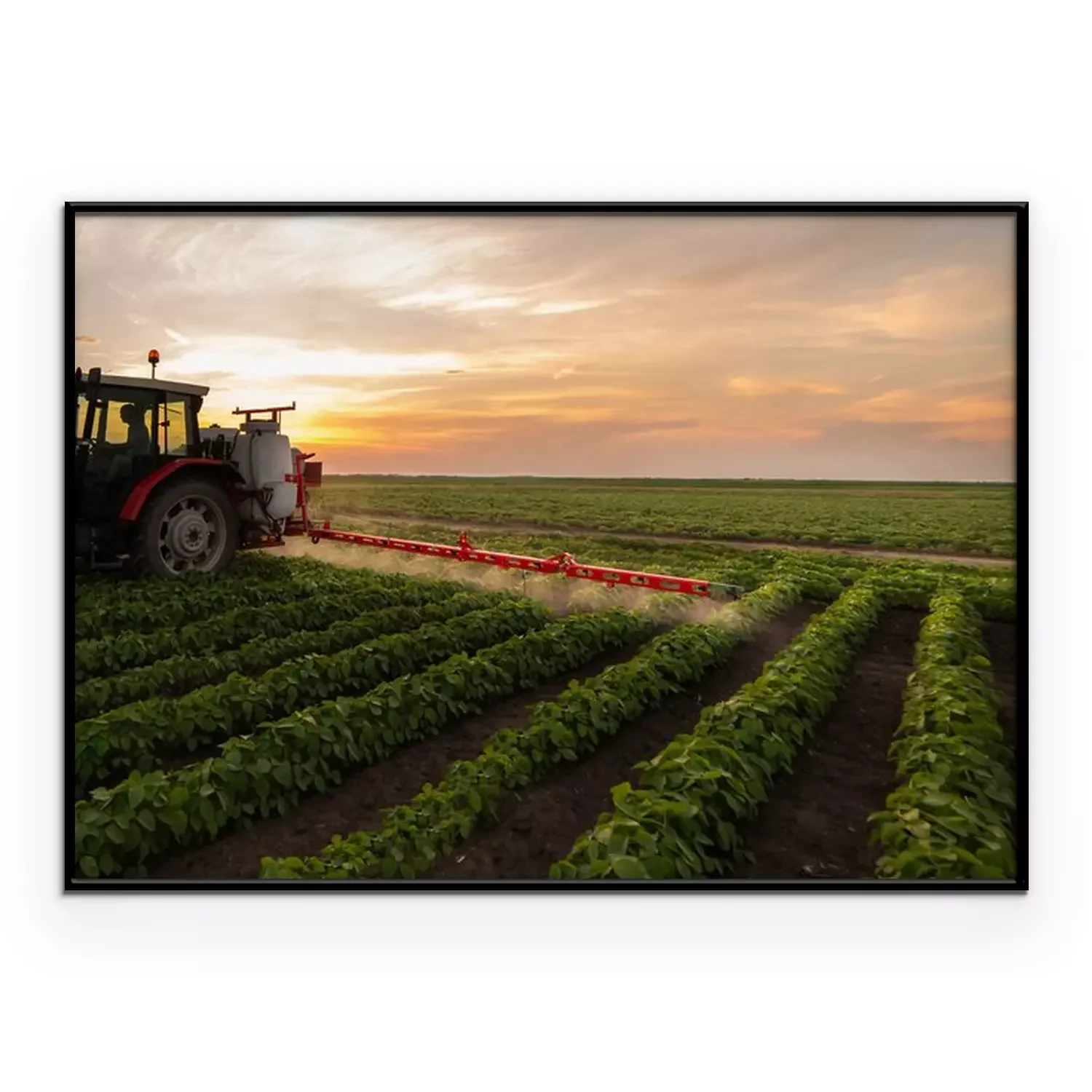 Poster: Tractor spraying soybean field in sunset