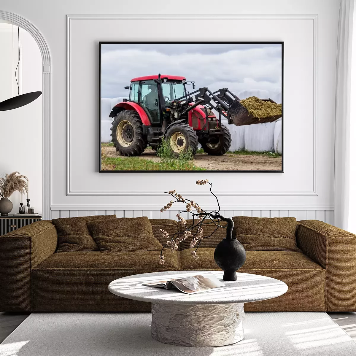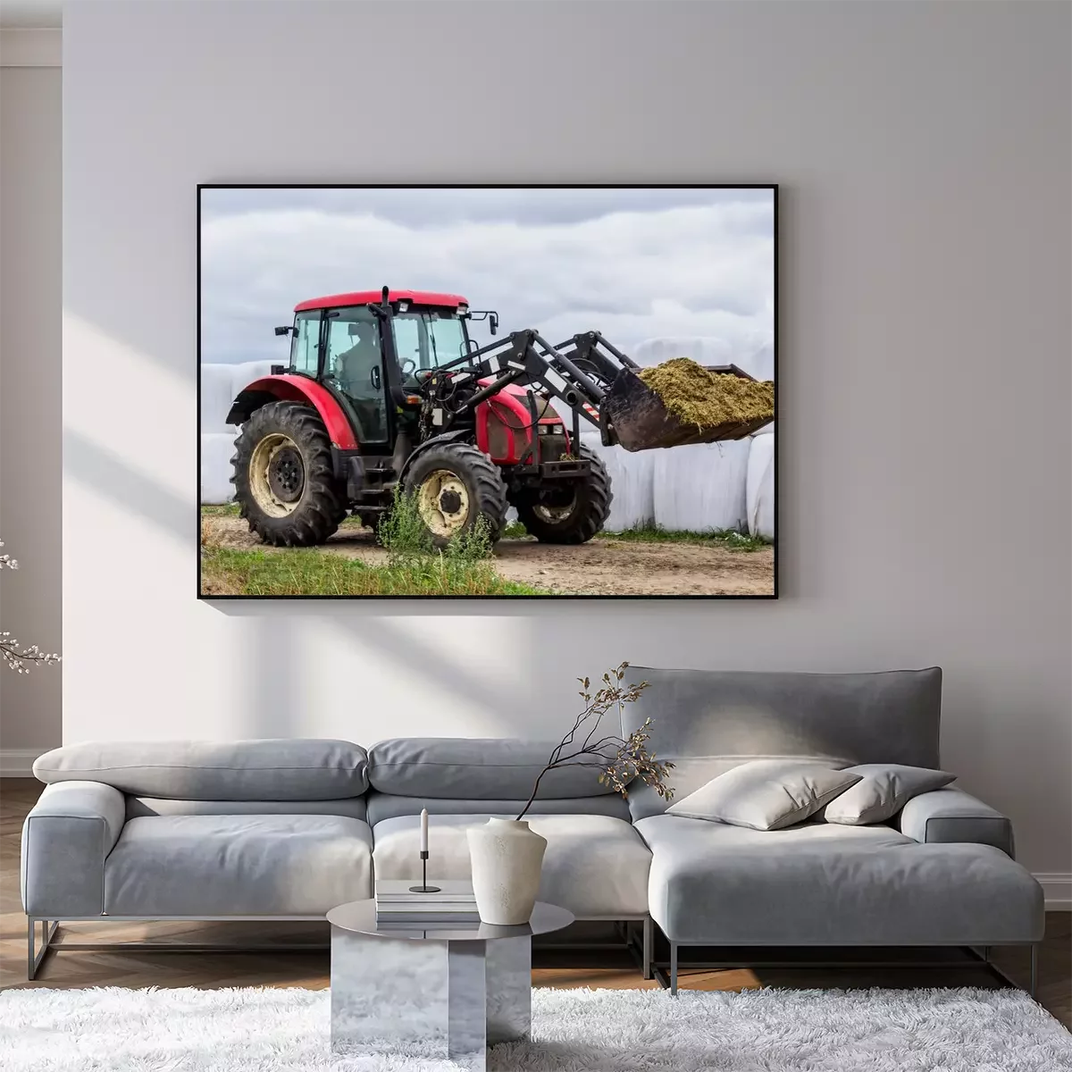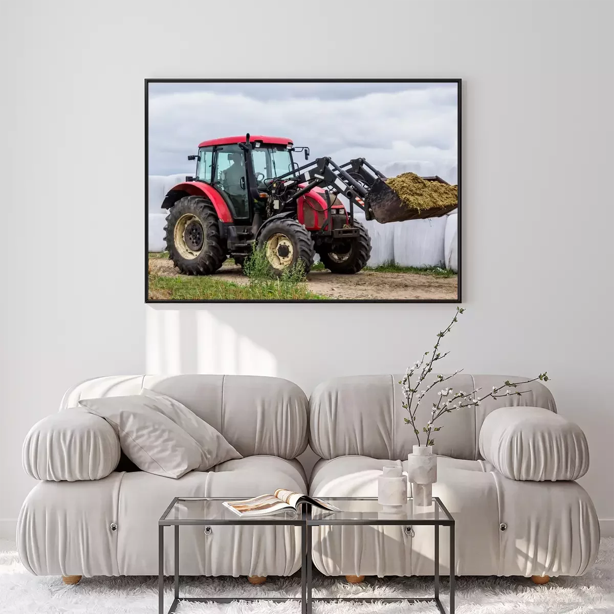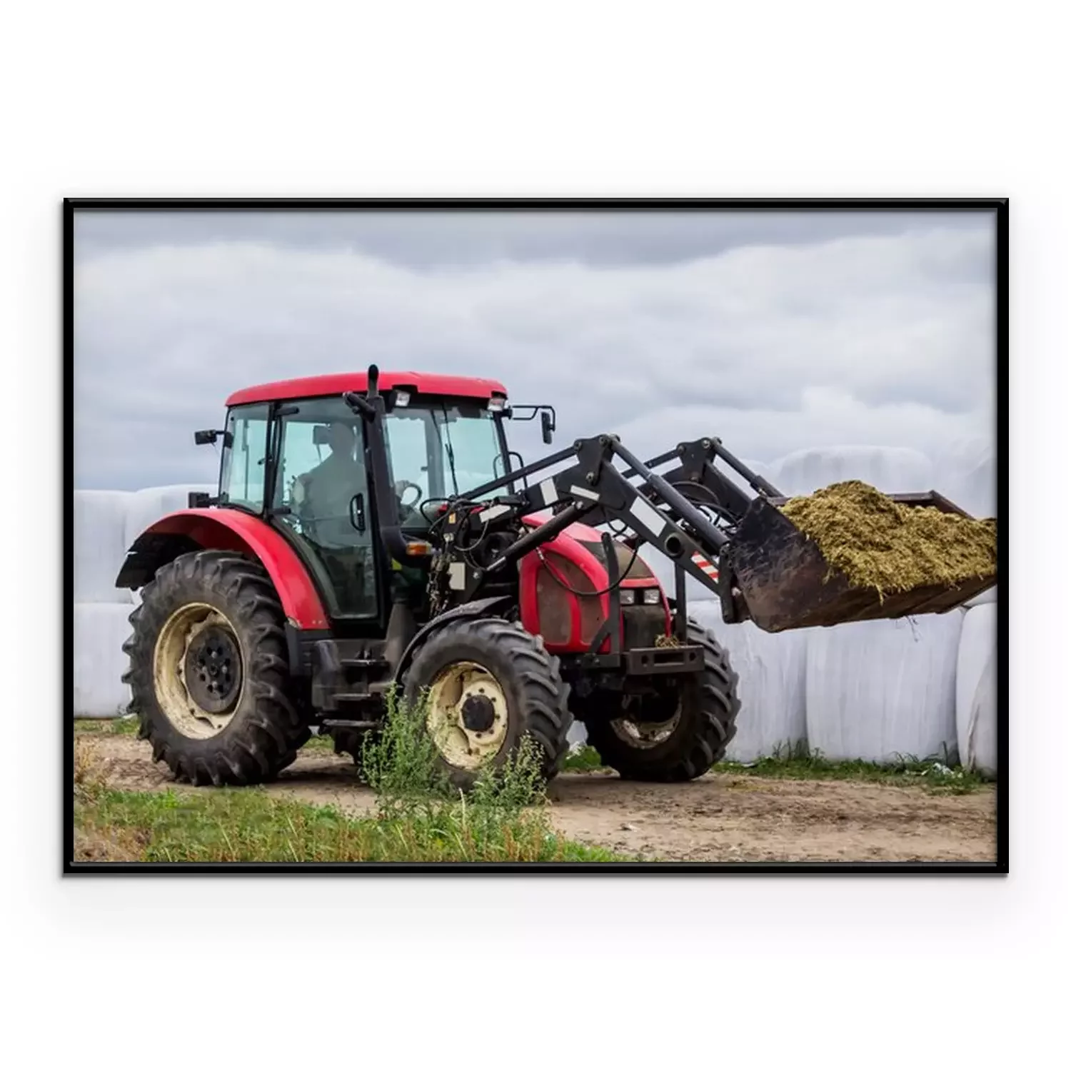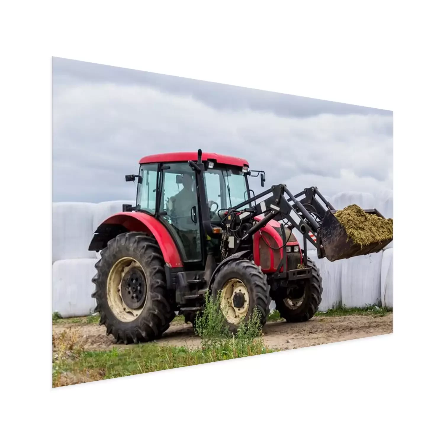 Poster: Tractor with front end loader scored feed for cows. View of the side on the background of bales with silage. Necessary equipment for a dairy farm.