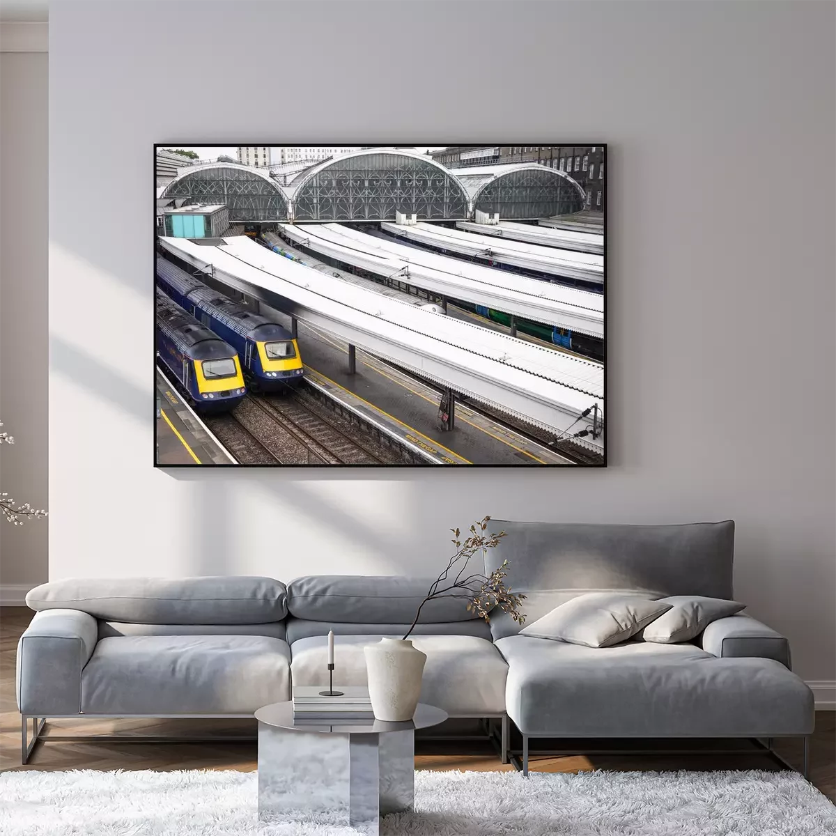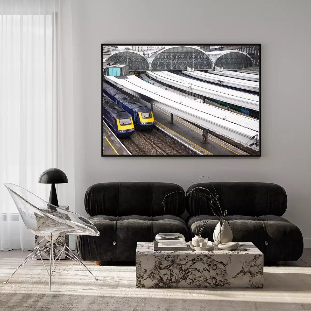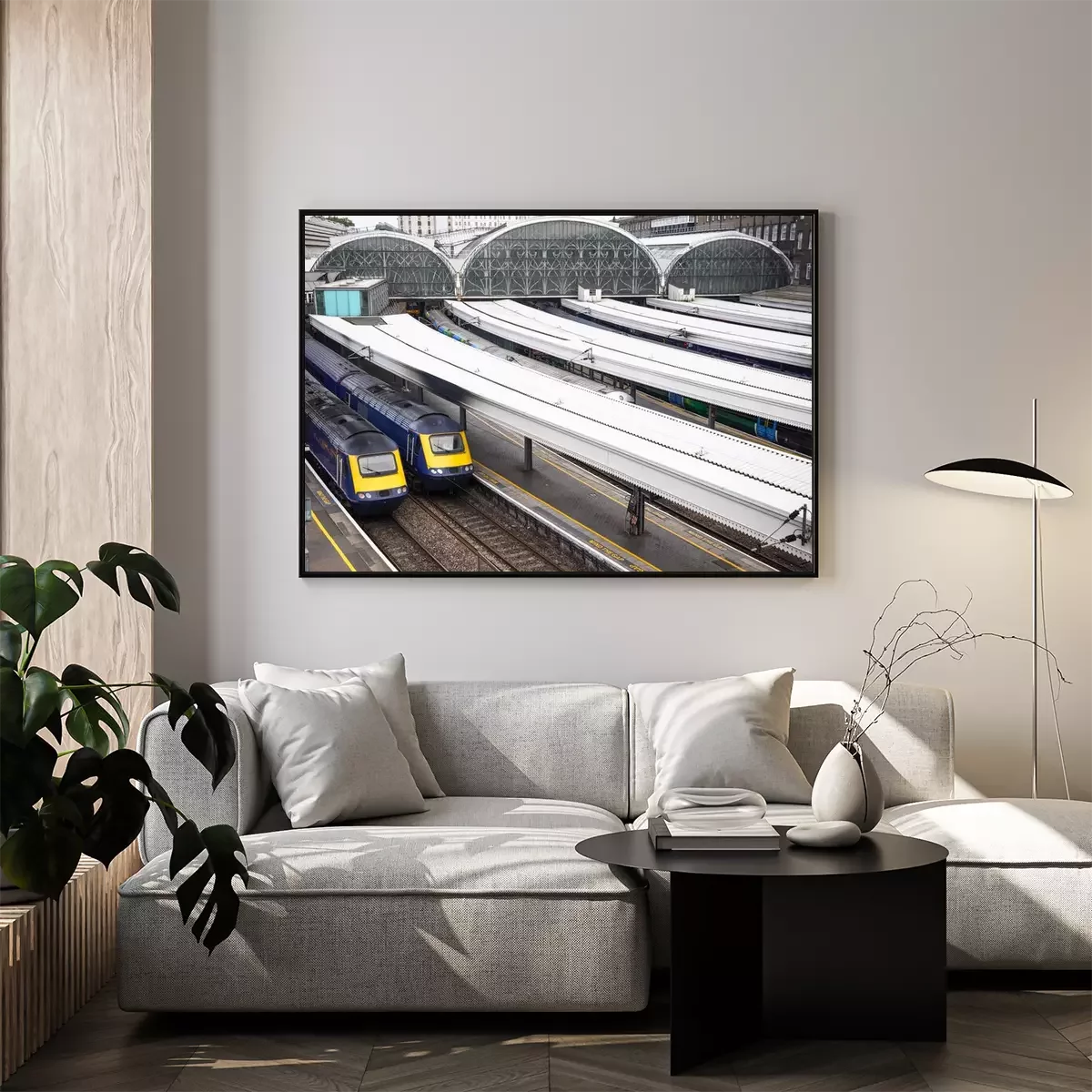 Poster: Treinen die bij Paddington-station in Londen weggaan