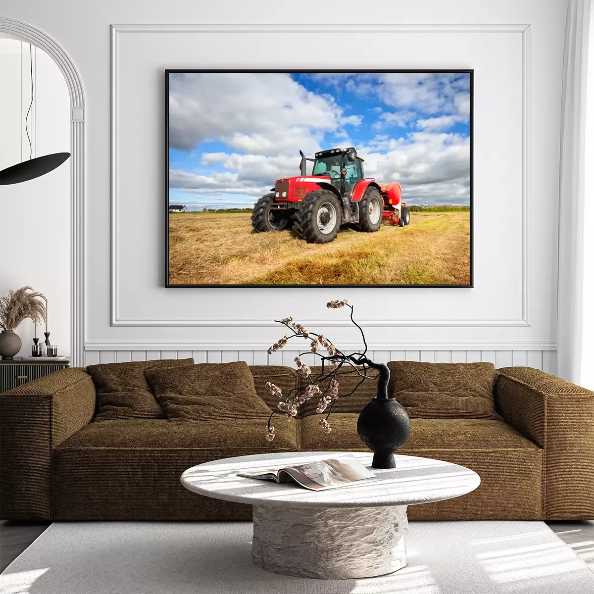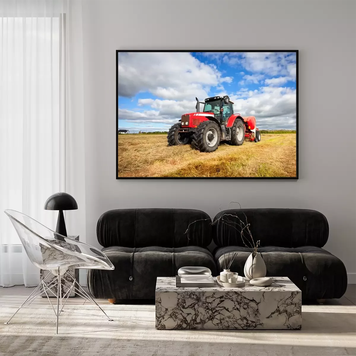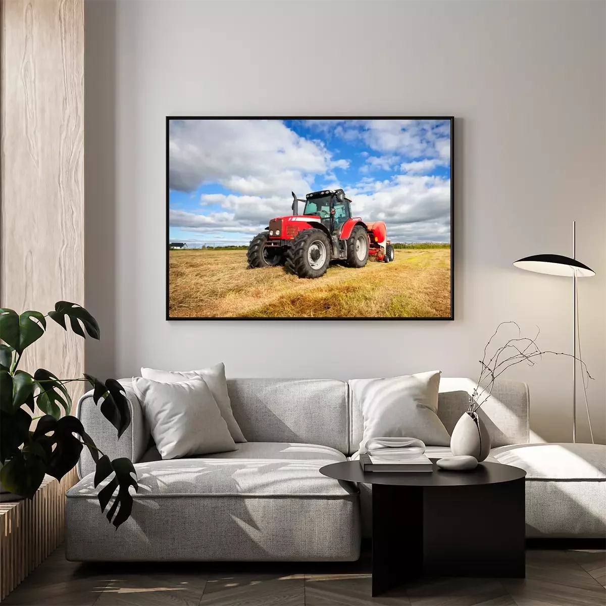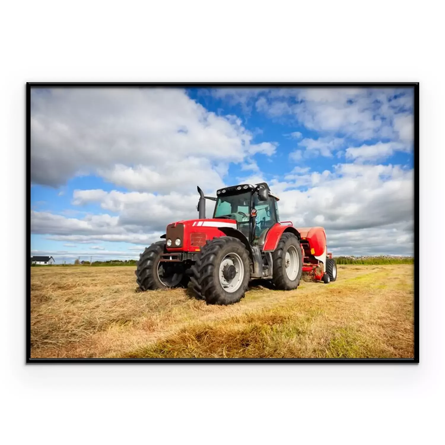 Poster: trekker verzamelen hooiberg in het veld, panning techniek