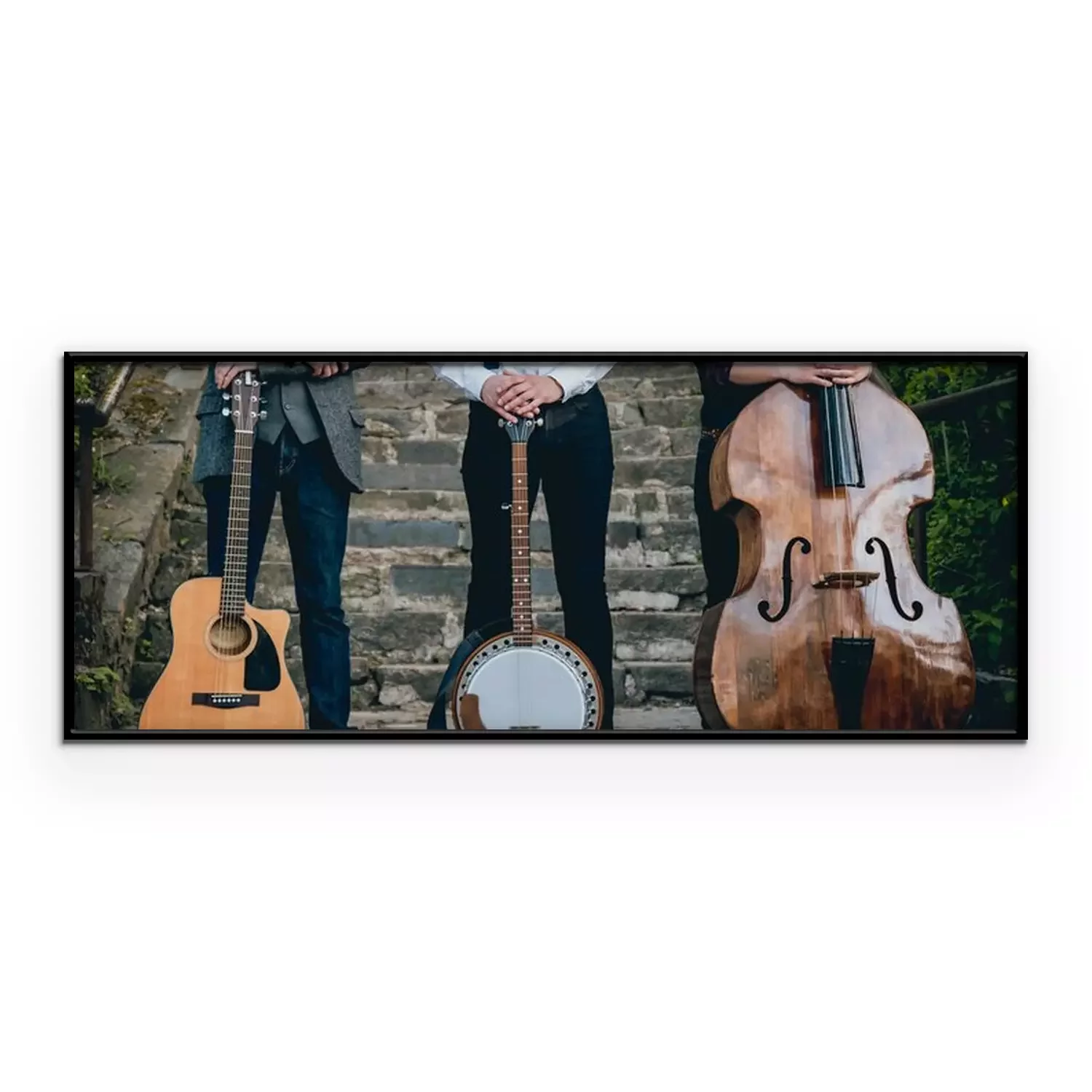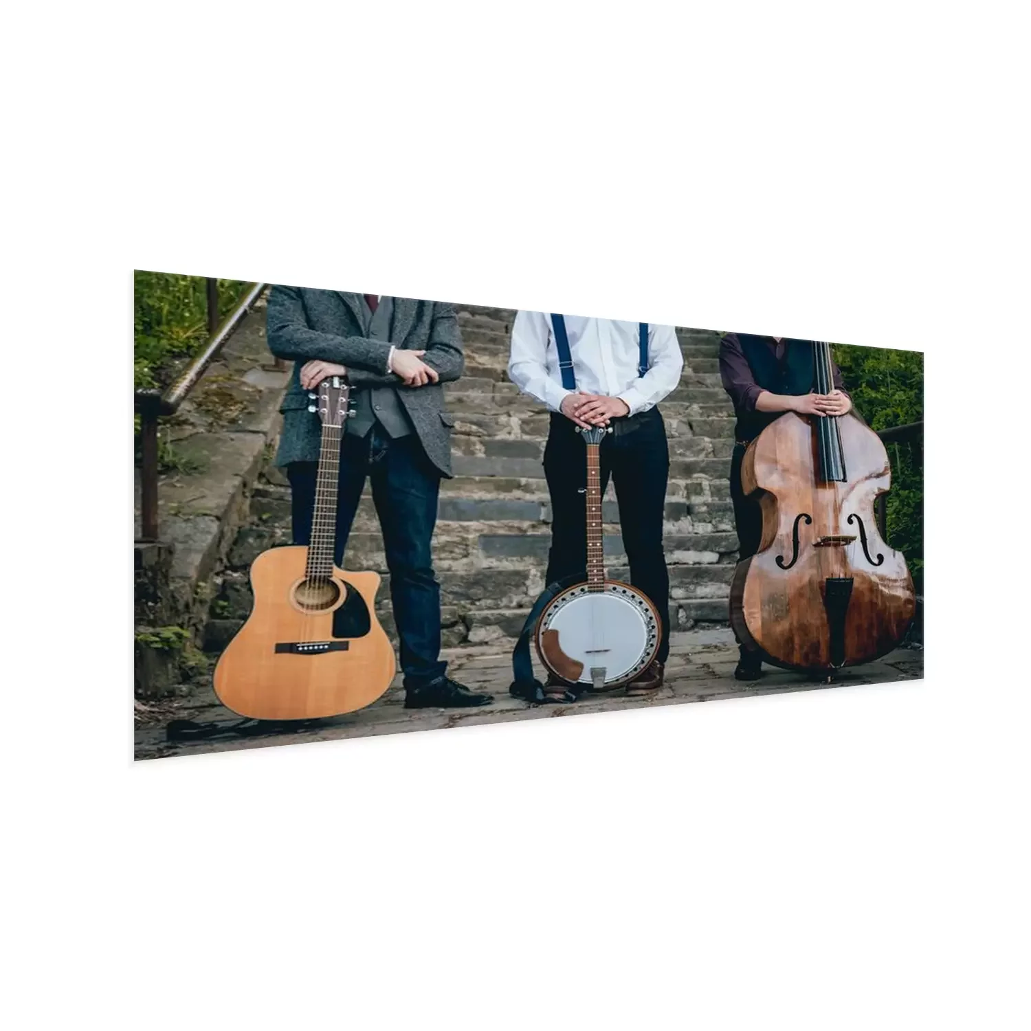 Poster: Trio van muzikanten met een gitaar, banjo en contrabass