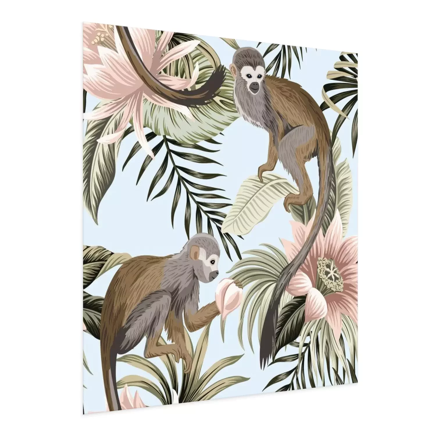 Poster: Tropical vintage monkey animal, lotus flower, peach fruit, palm leaves floral seamless pattern blue background. Exotic jungle wallpaper.