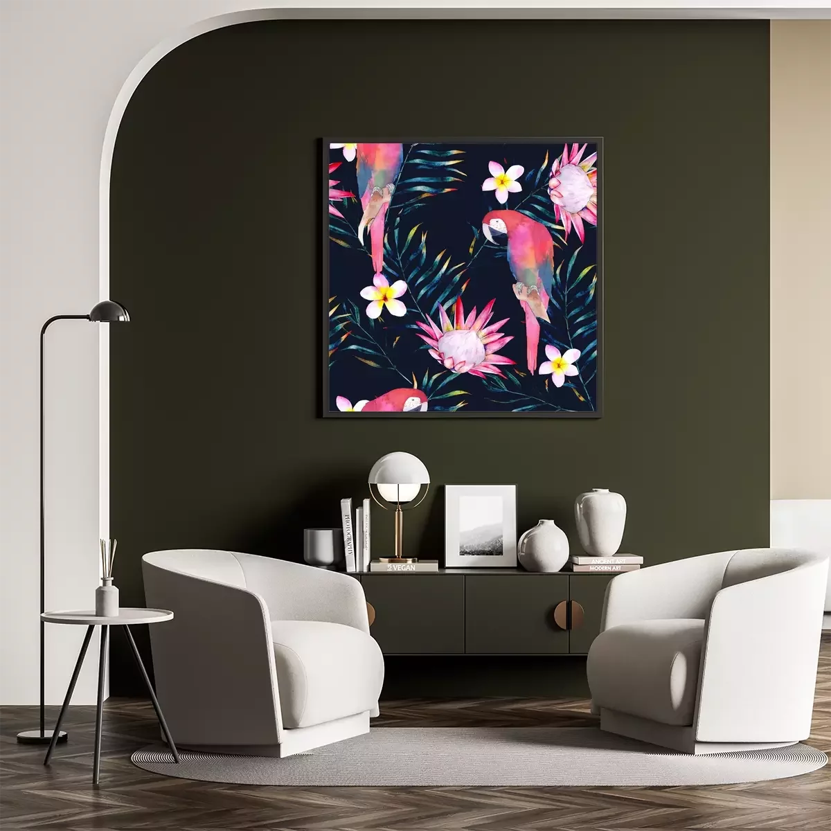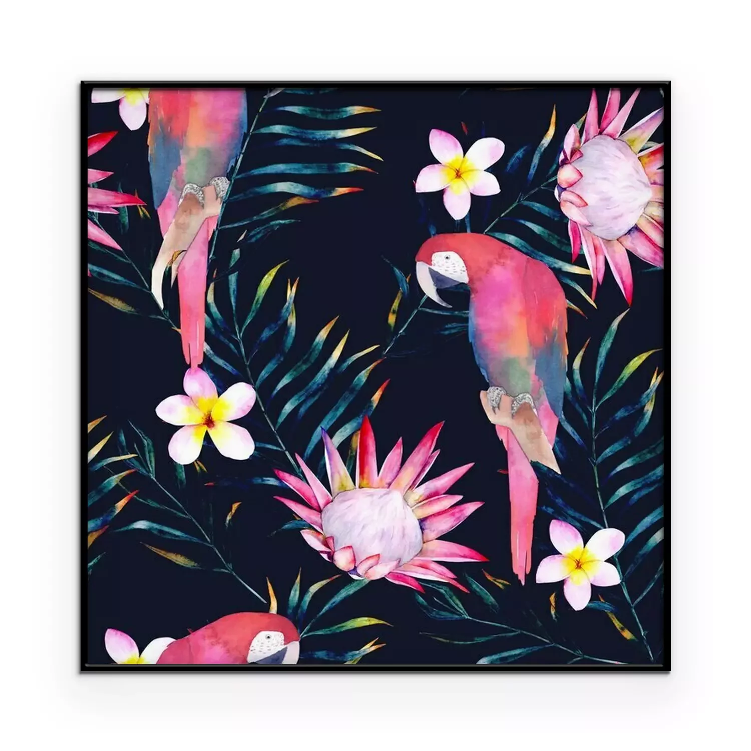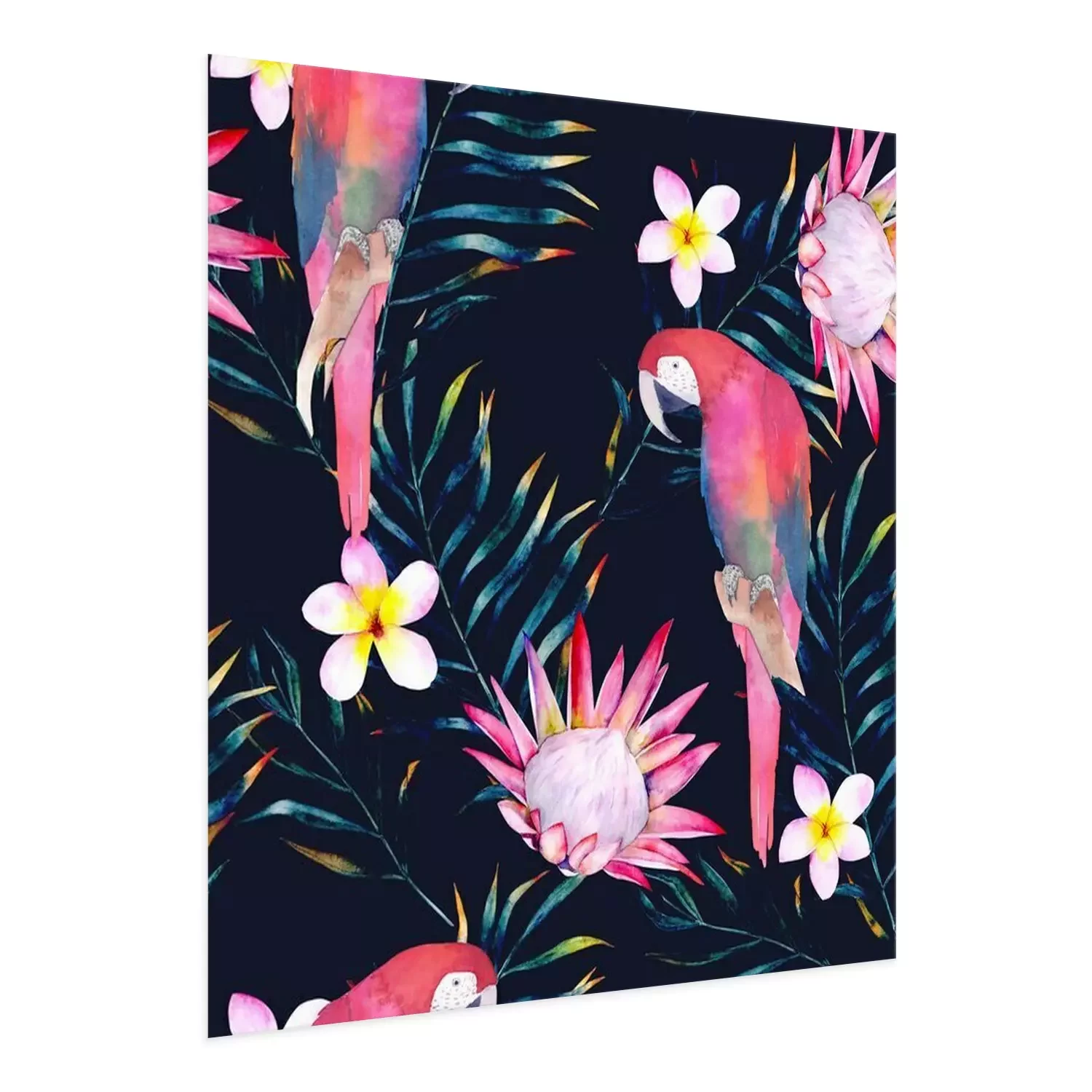 Poster: Tropisch naadloos patroon met papegaaien, protea, plumeria en bladeren. Waterverf zomer print. Exotische hand getekende illustratie