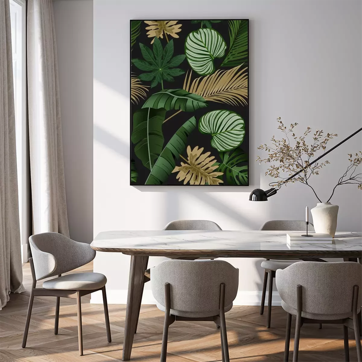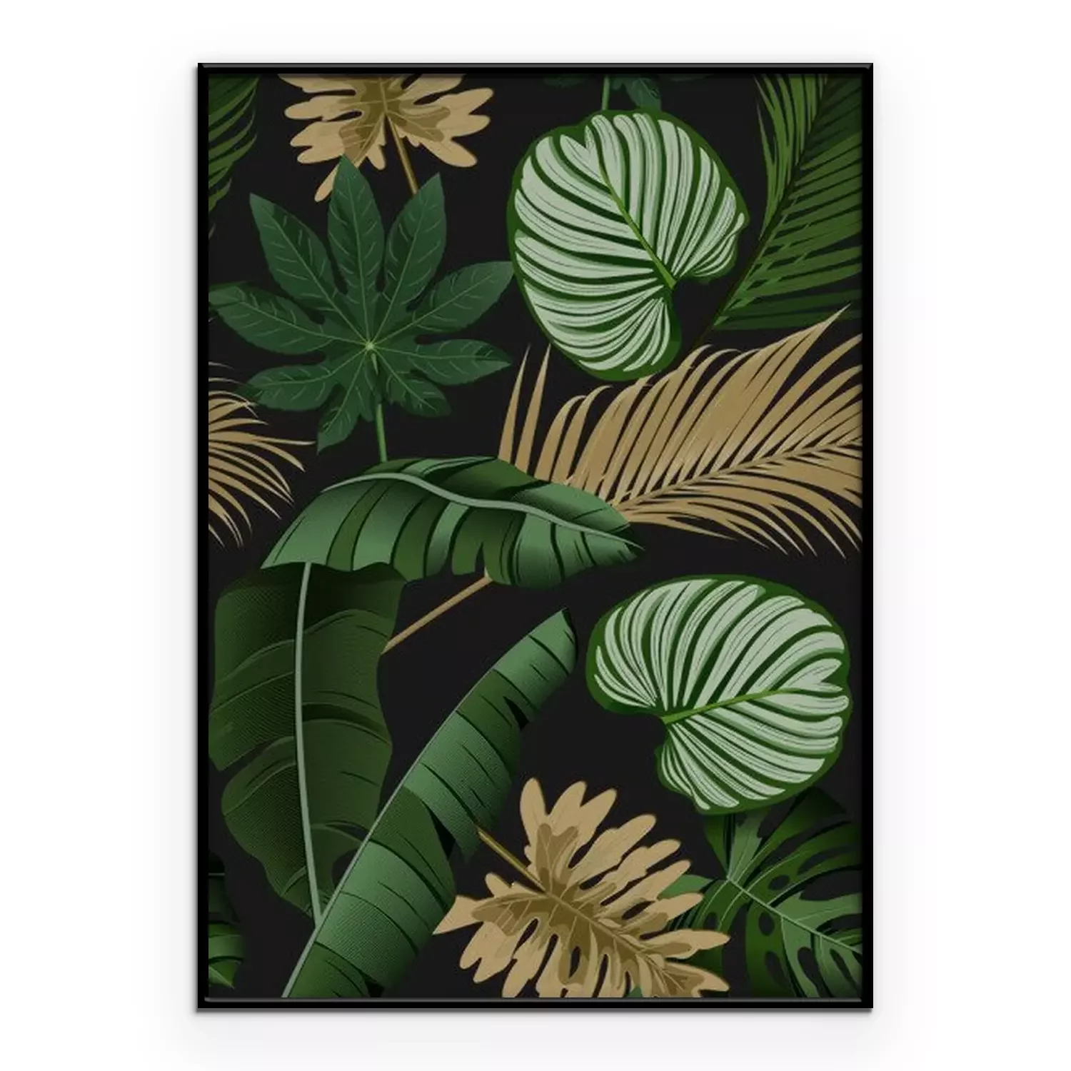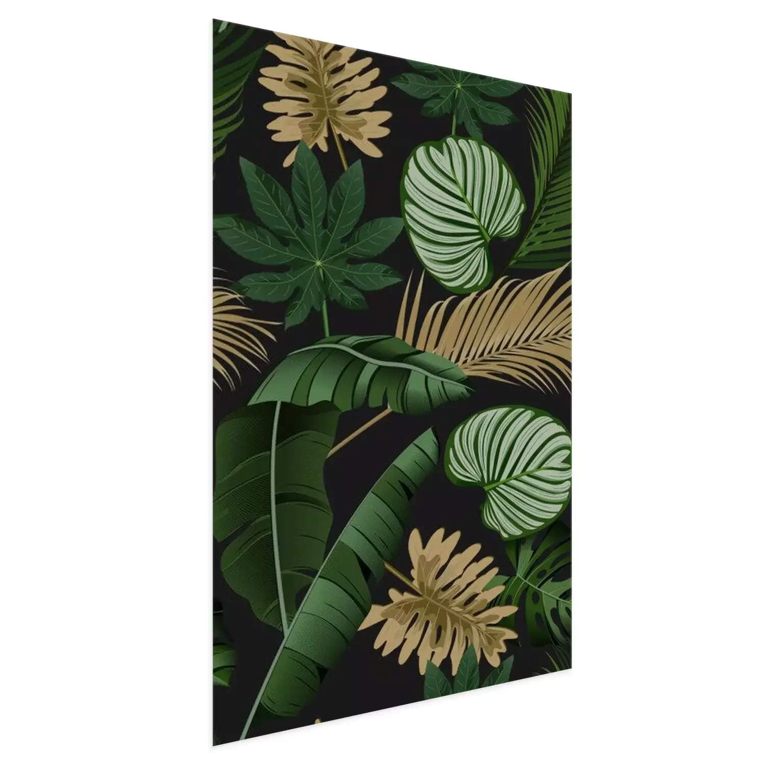 Poster: Tropische gouden en groene bladeren op een donkere achtergrond
