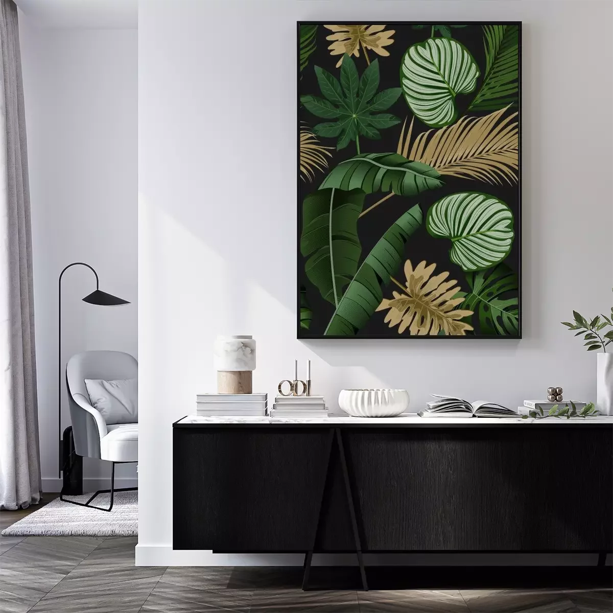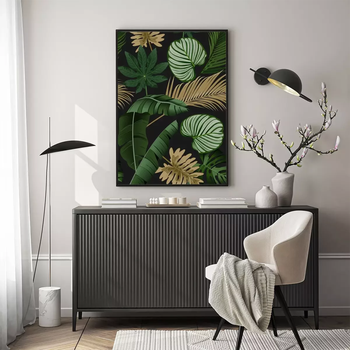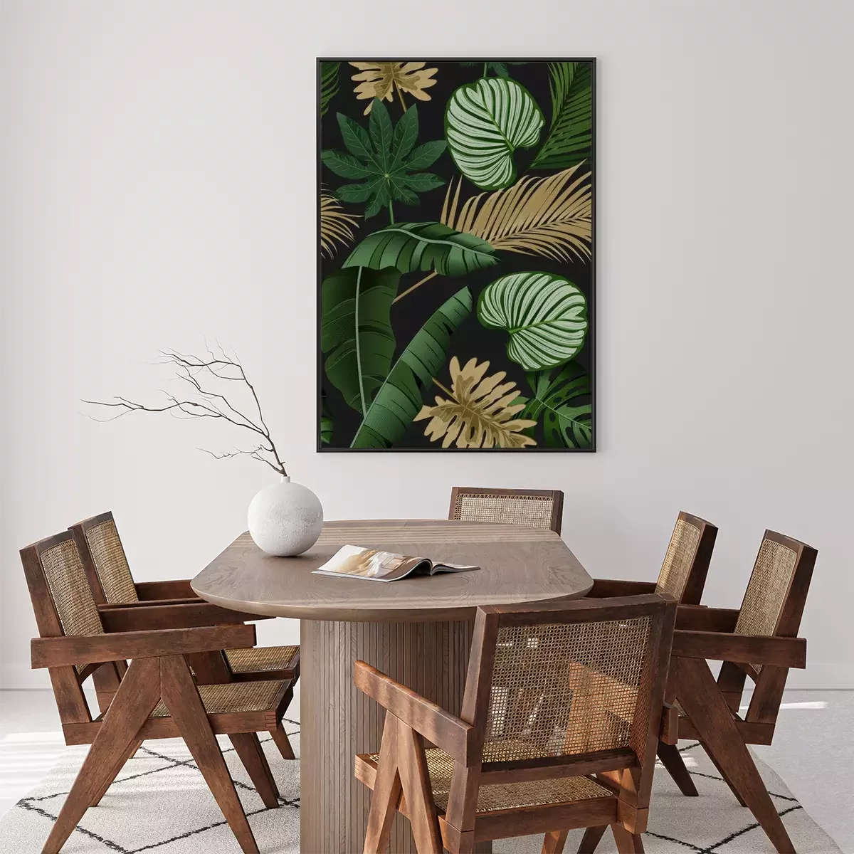Poster: Tropische gouden en groene bladeren op een donkere achtergrond