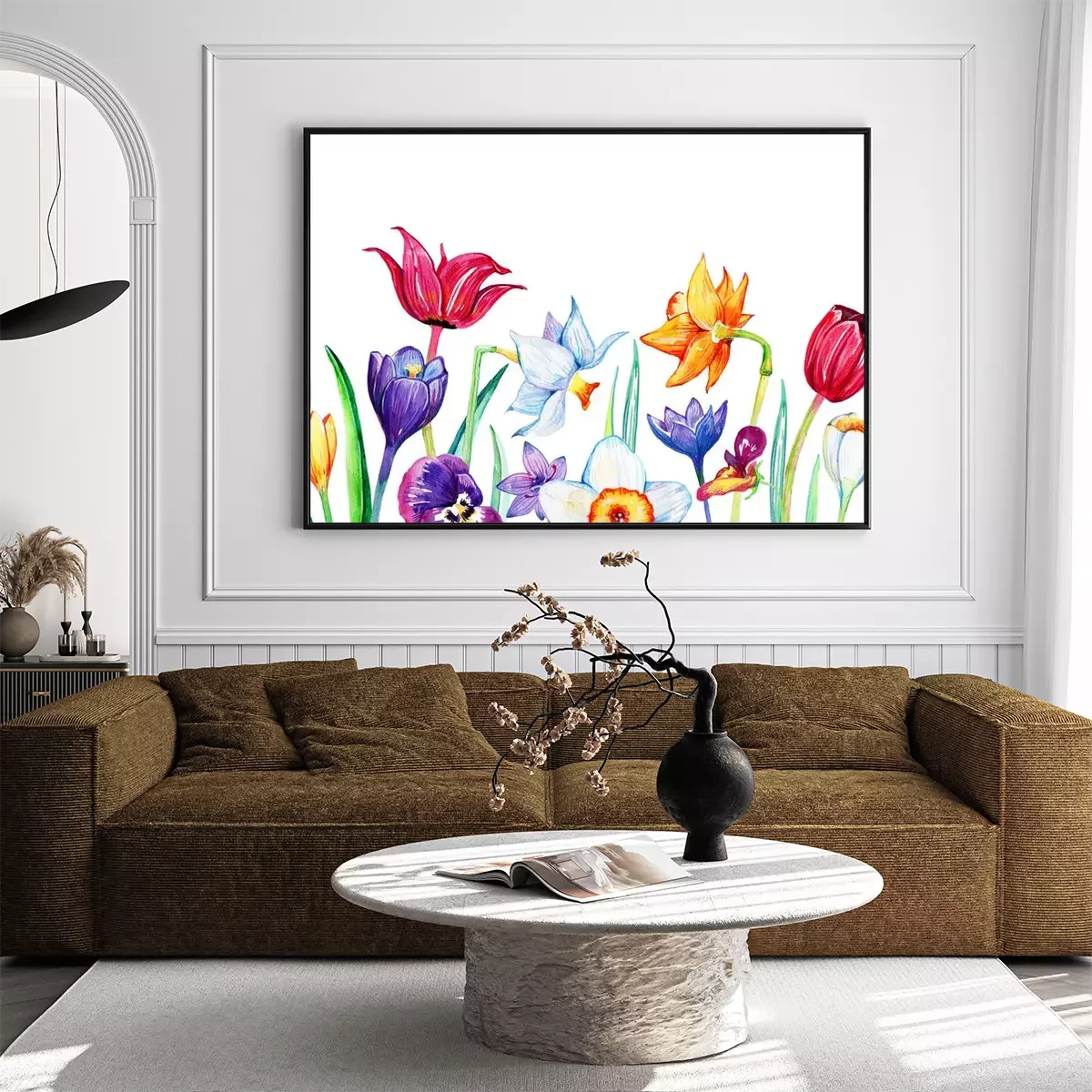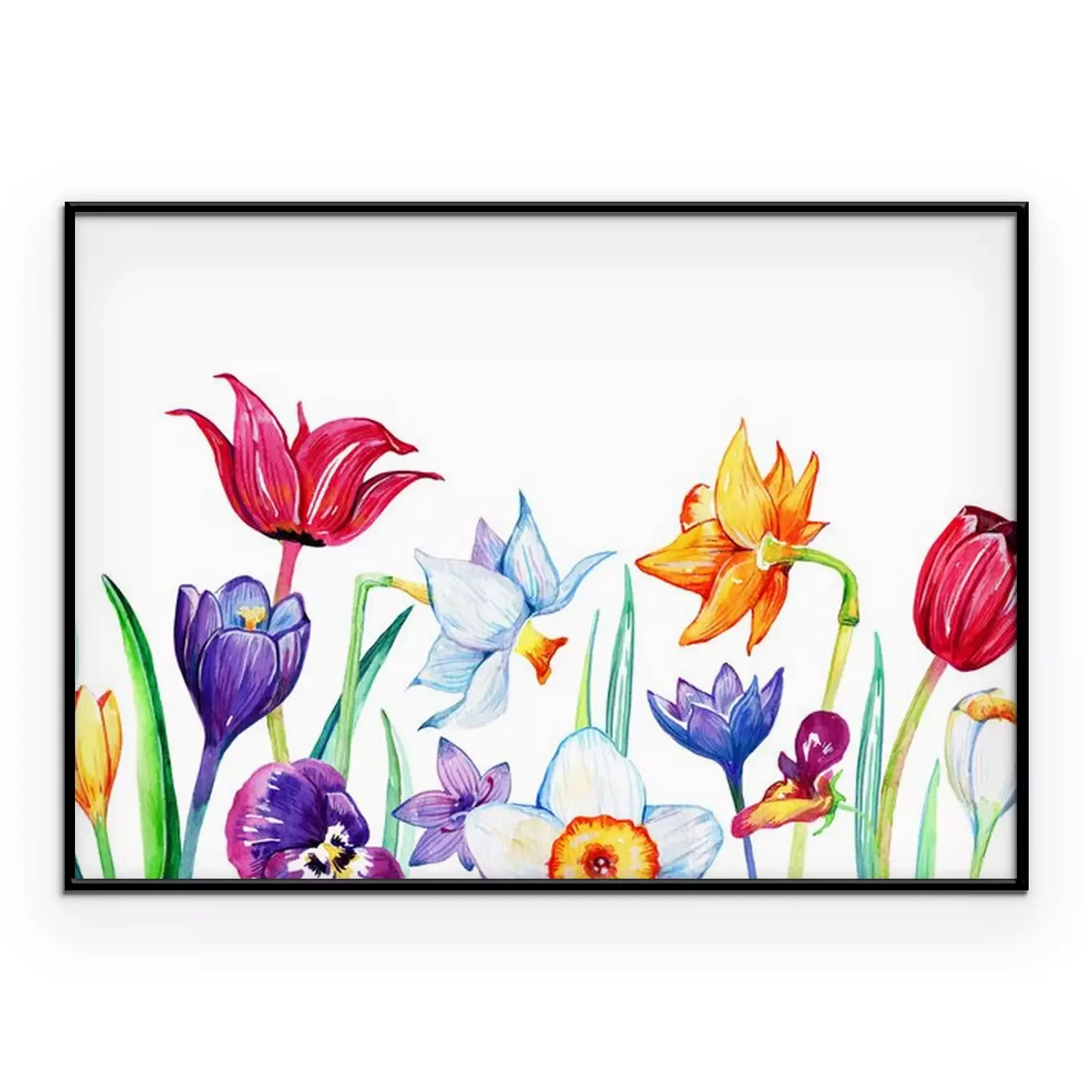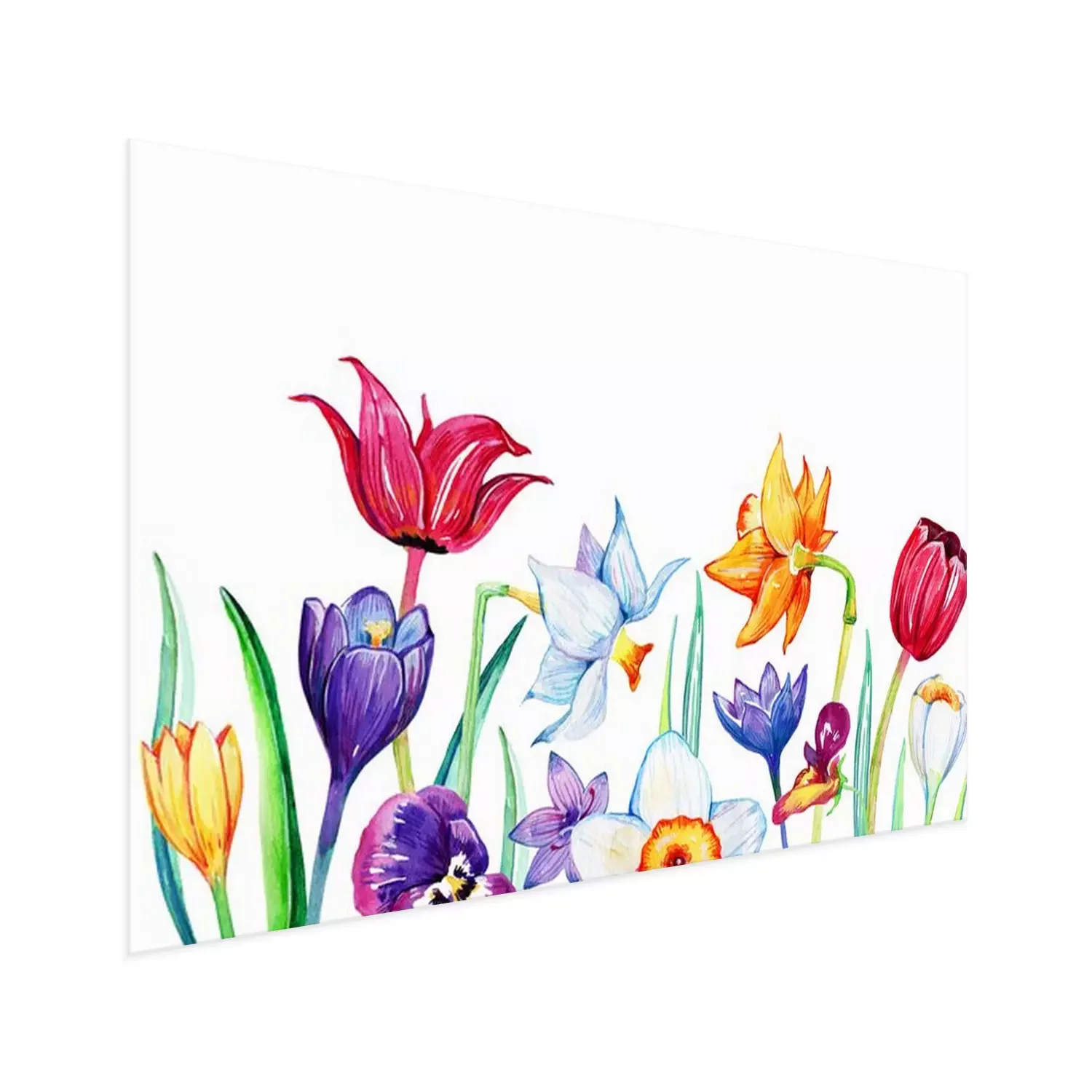 Poster: Tulpen, narcissen en viooltjes geschetste compositie