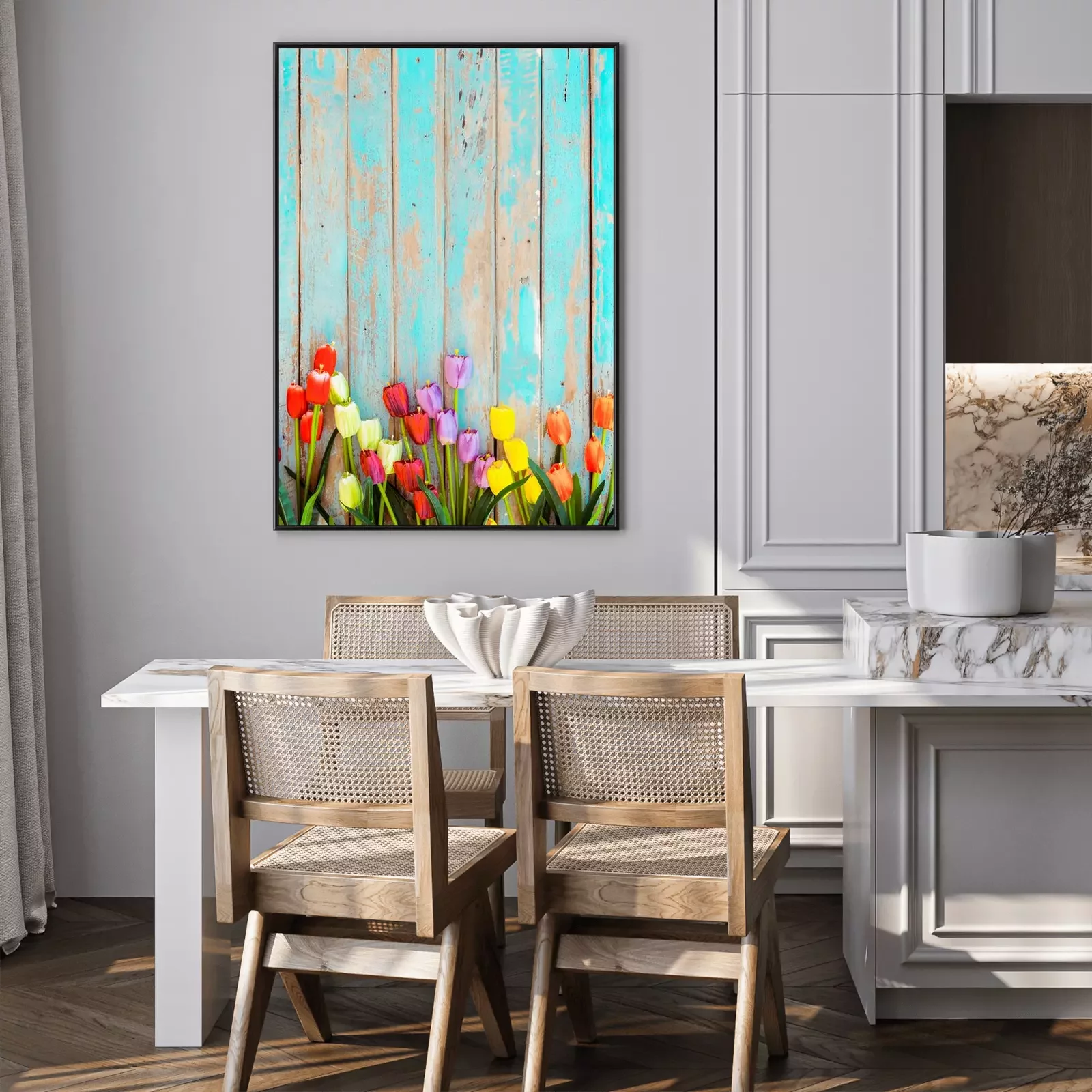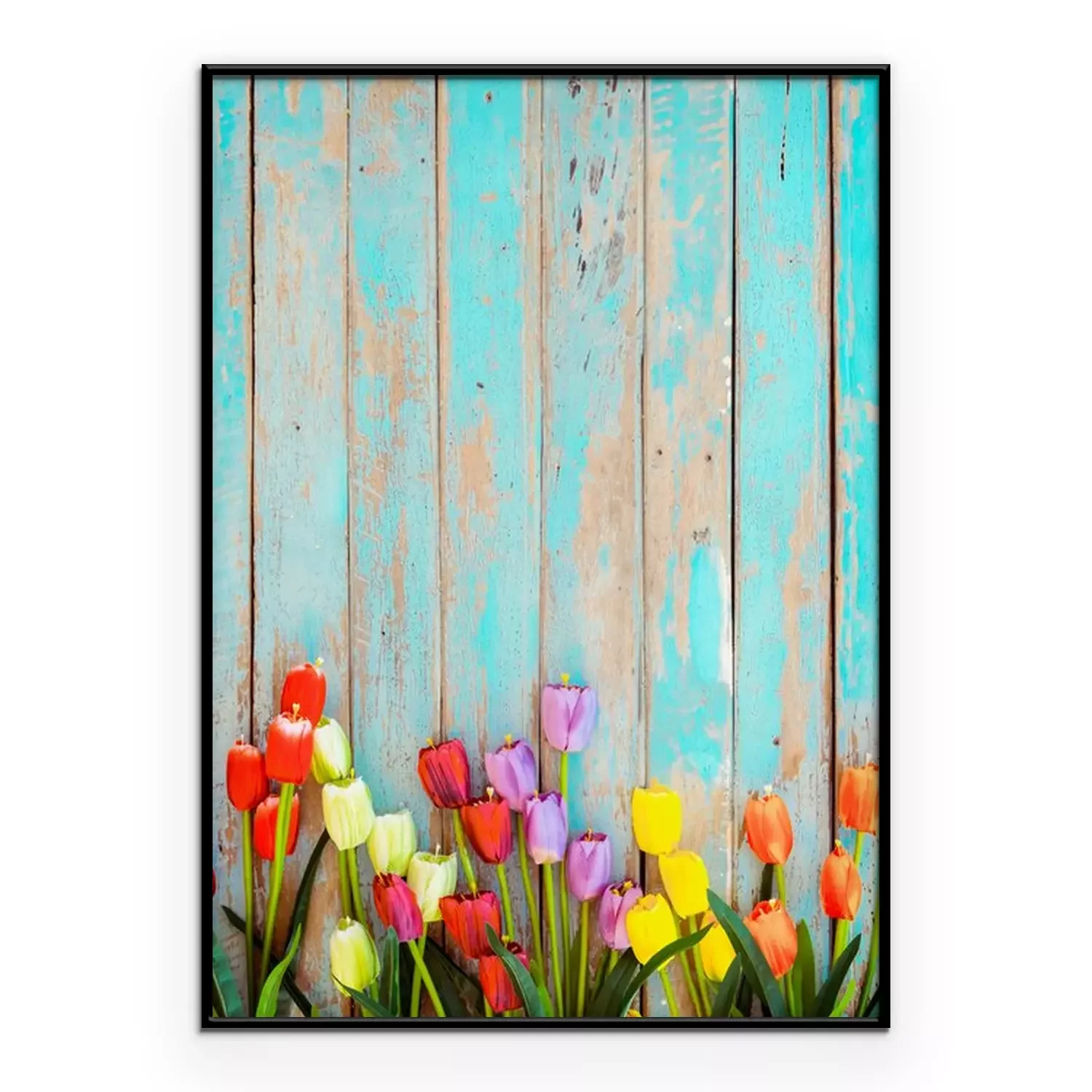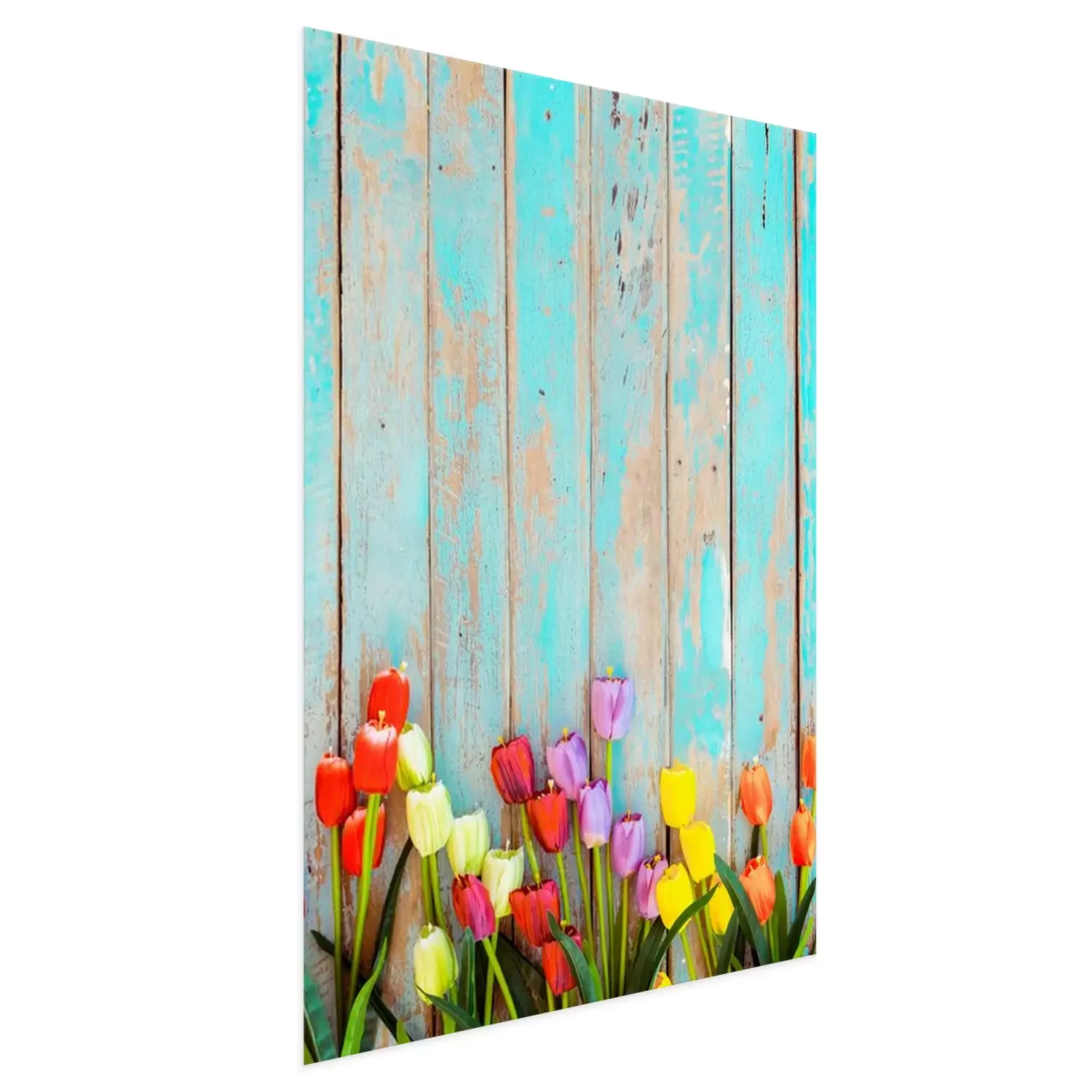 Poster: Tulpen op een achtergrond van beschilderde planken