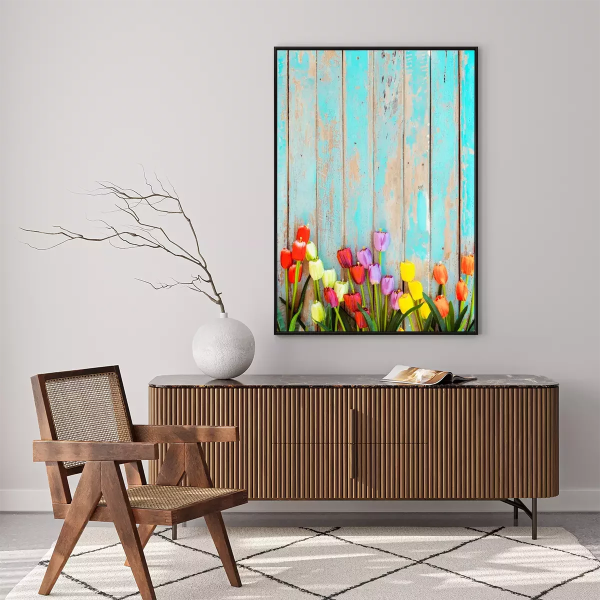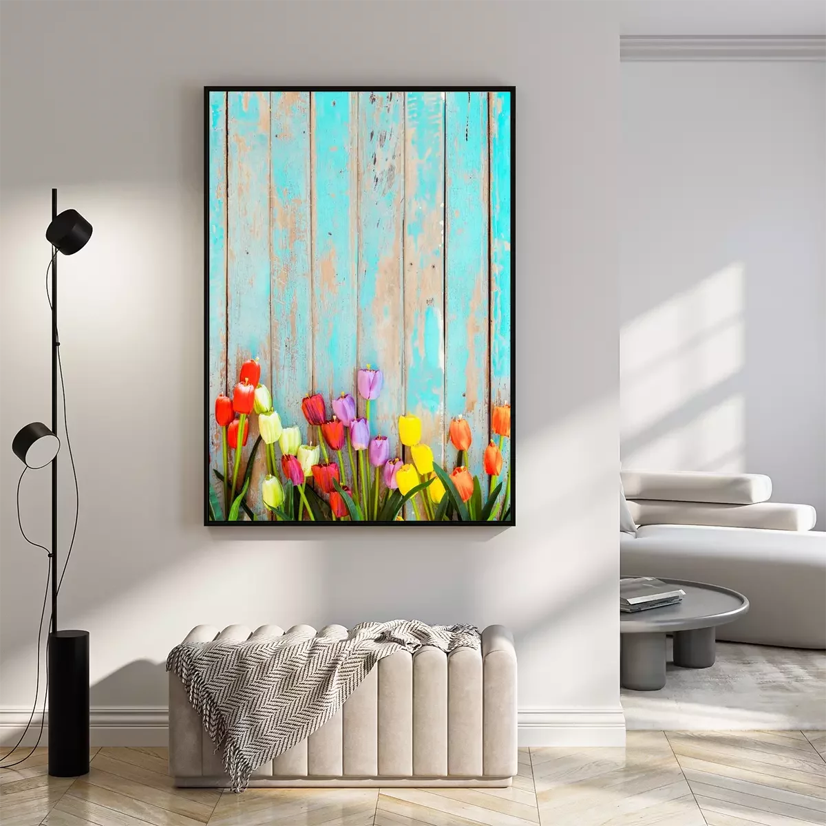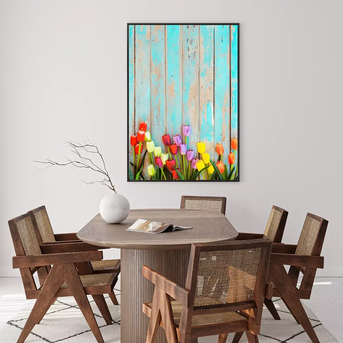 Poster: Tulpen op een achtergrond van beschilderde planken