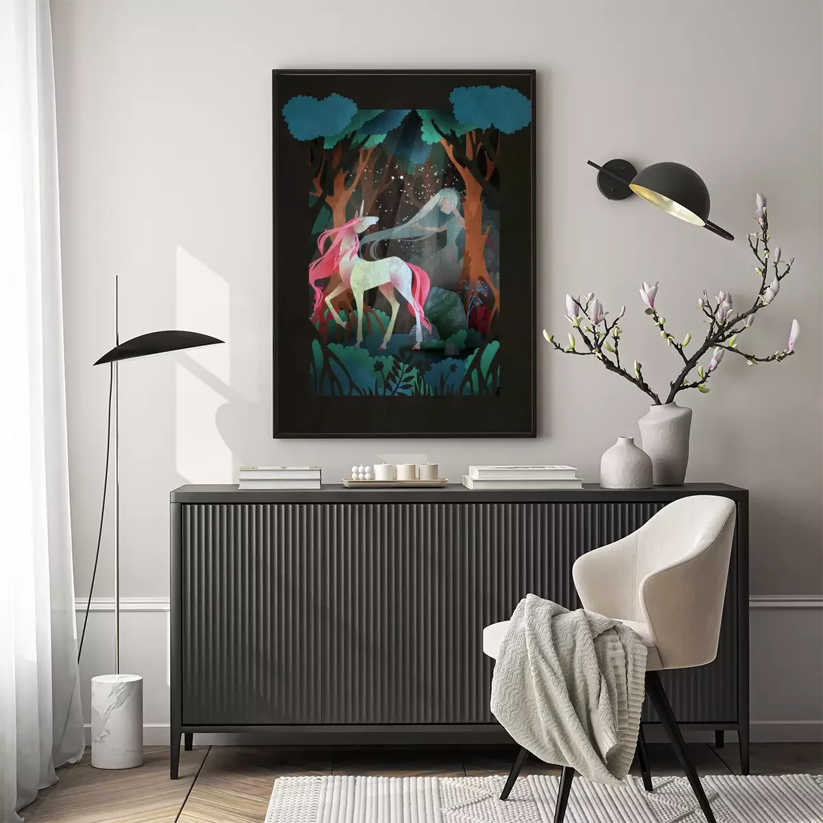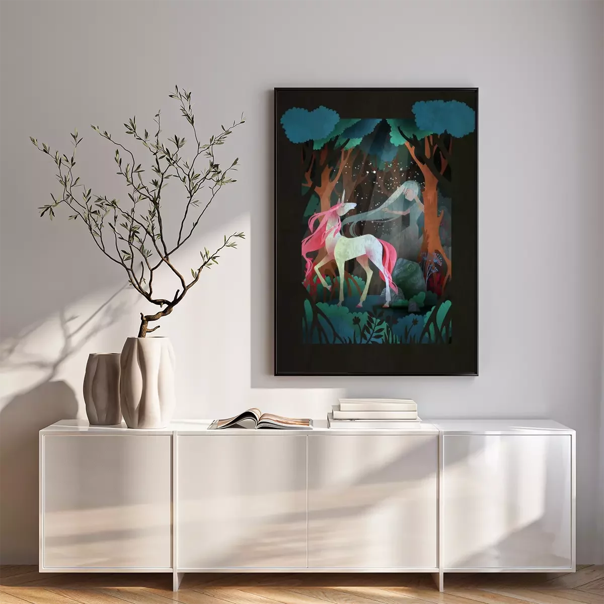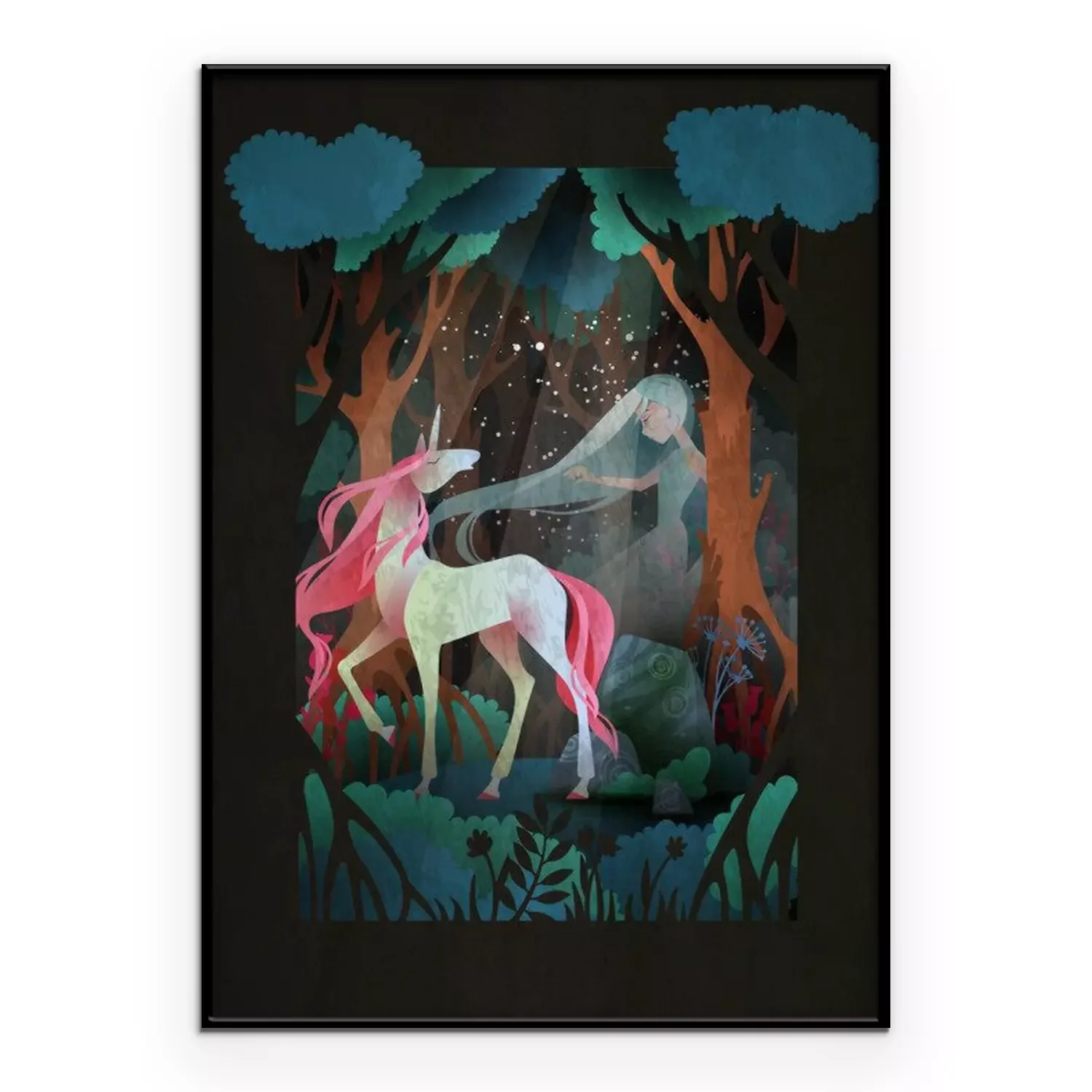 Poster: Tussen de bomen een eenhoorn en een bosnimf