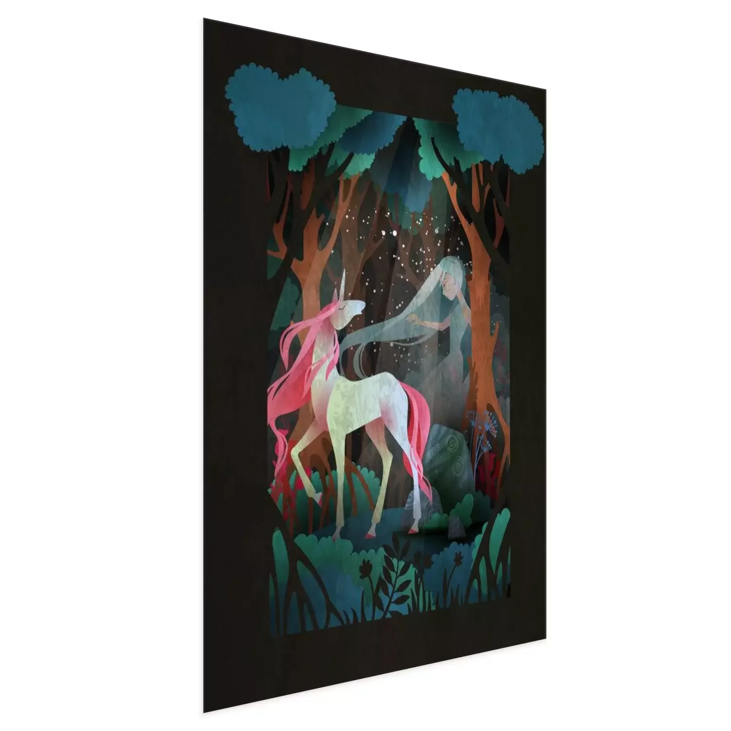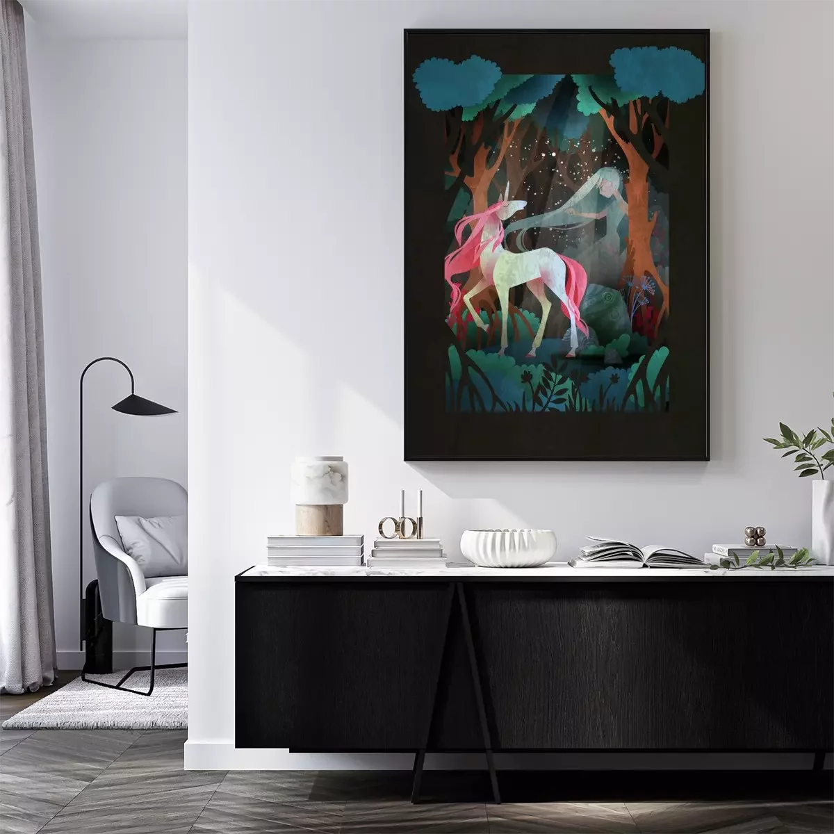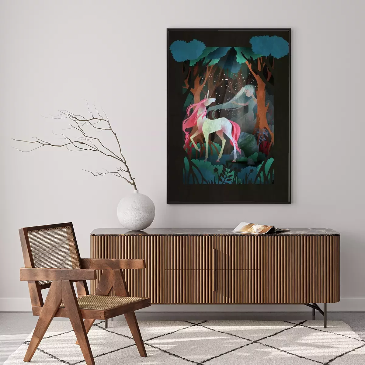 Poster: Tussen de bomen een eenhoorn en een bosnimf