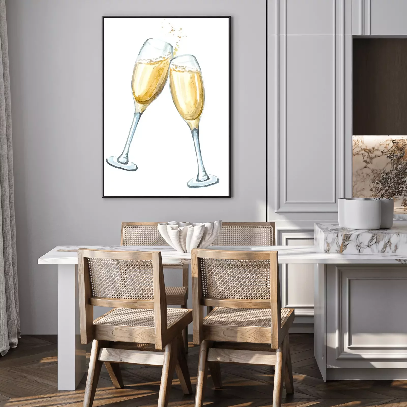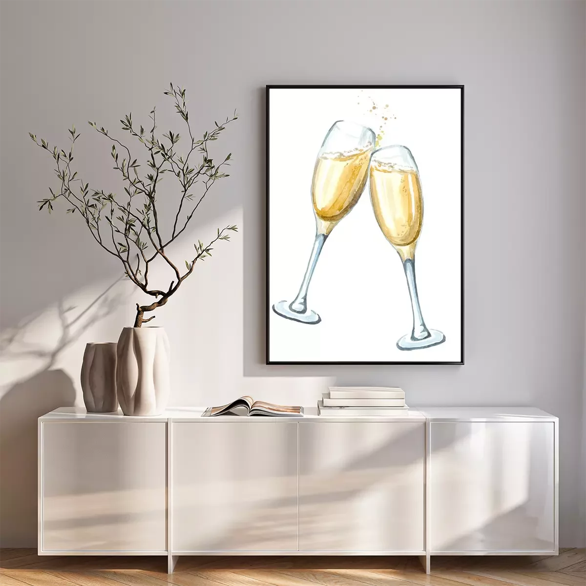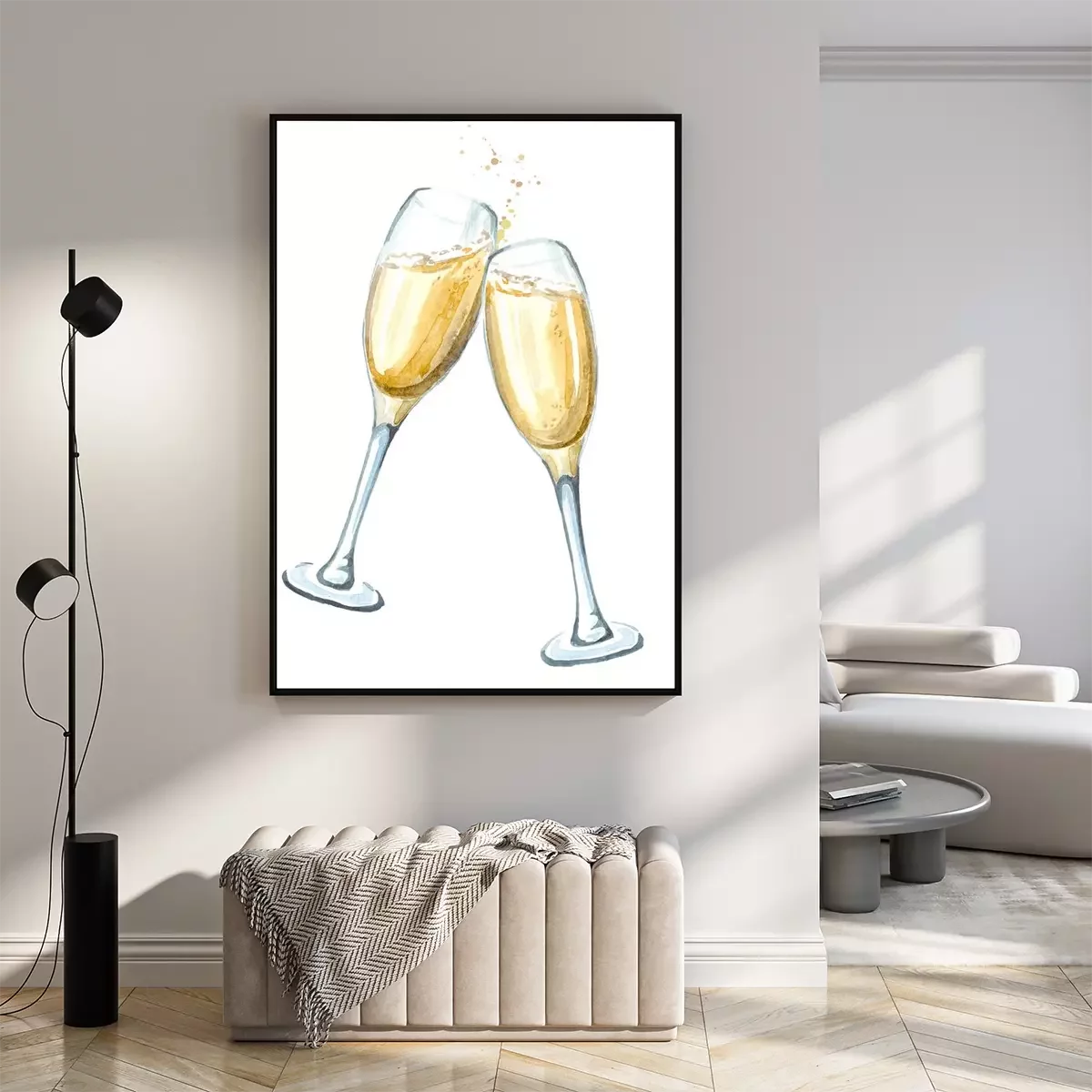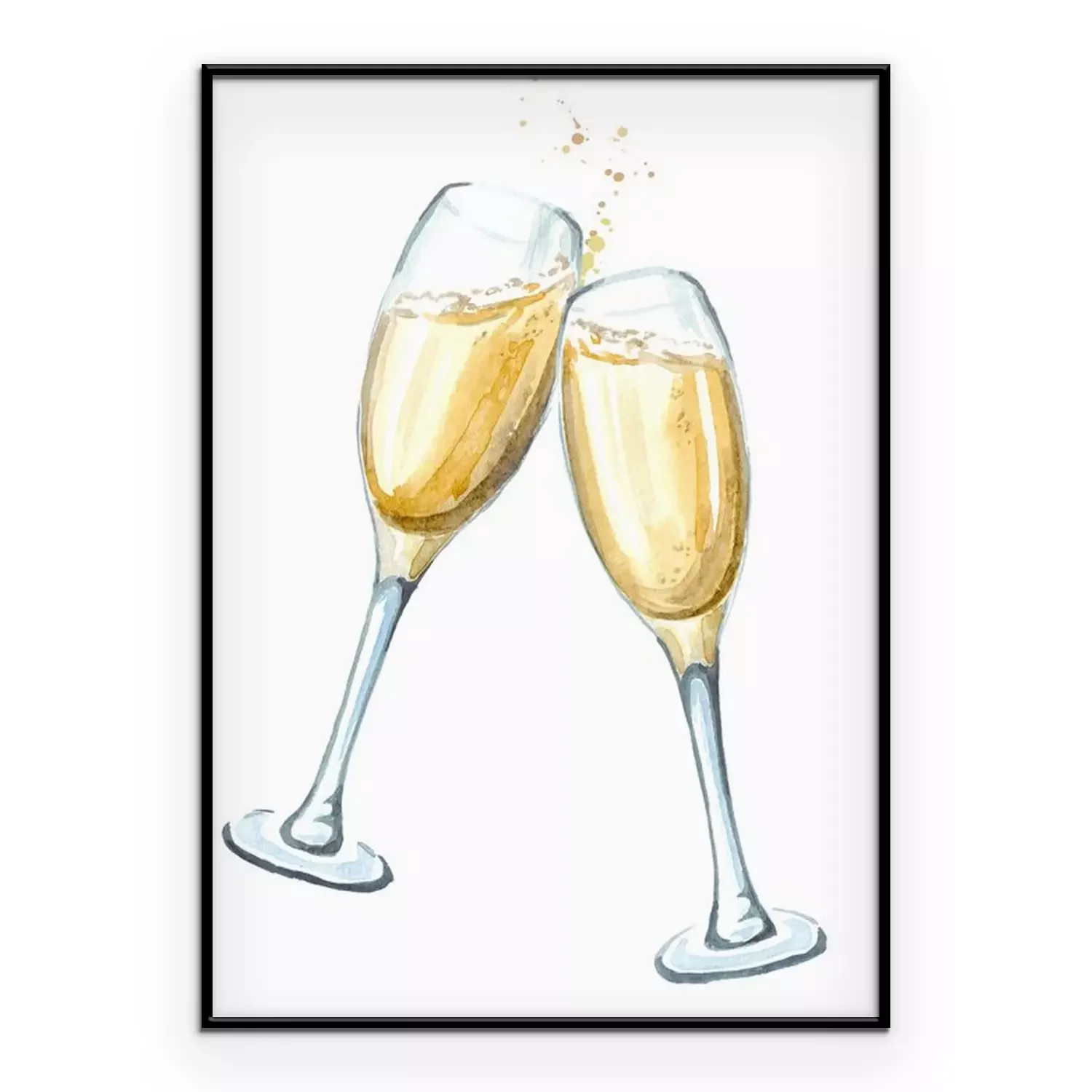 Poster: Twee glazen champagne bij het roosteren. Waterverfhand getrokken die illustratie op witte achtergrond wordt geïsoleerd