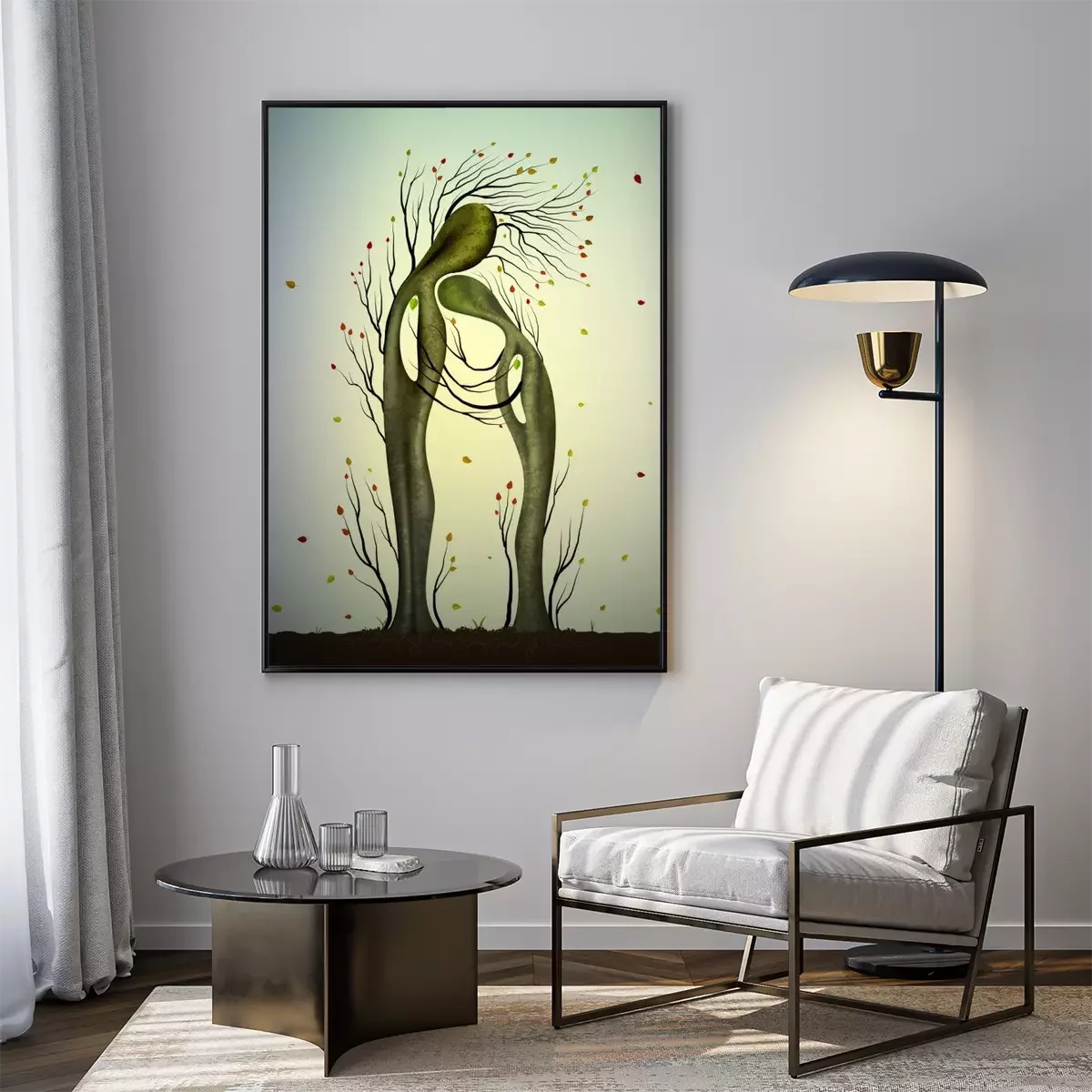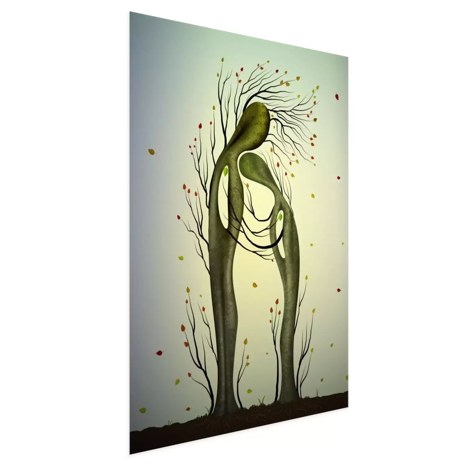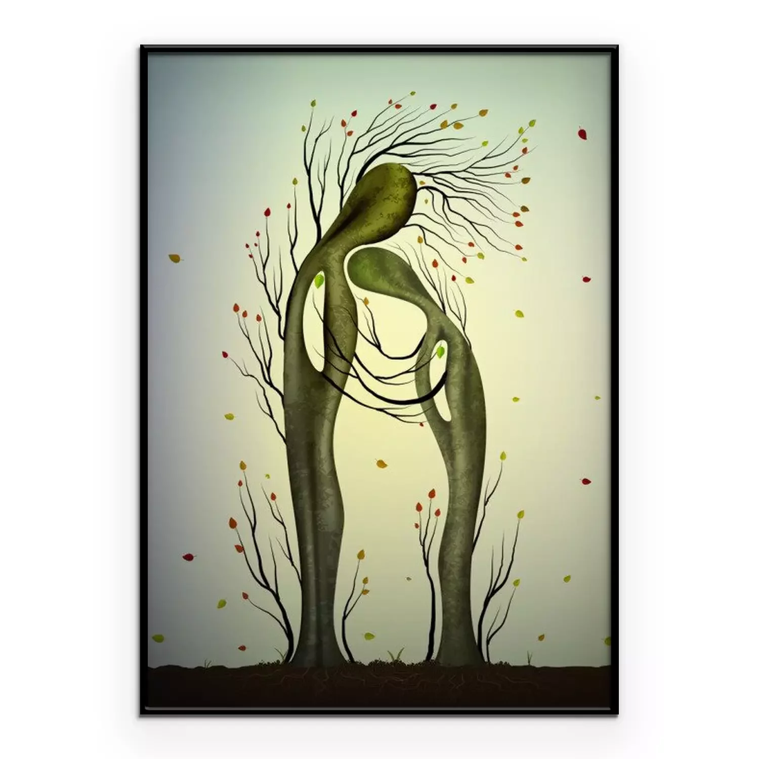 Poster: Twee verliefde bomen lijken op man en vrouw, boomknuffel, familieconcept, ouder worden, herfstboomgevoelens,