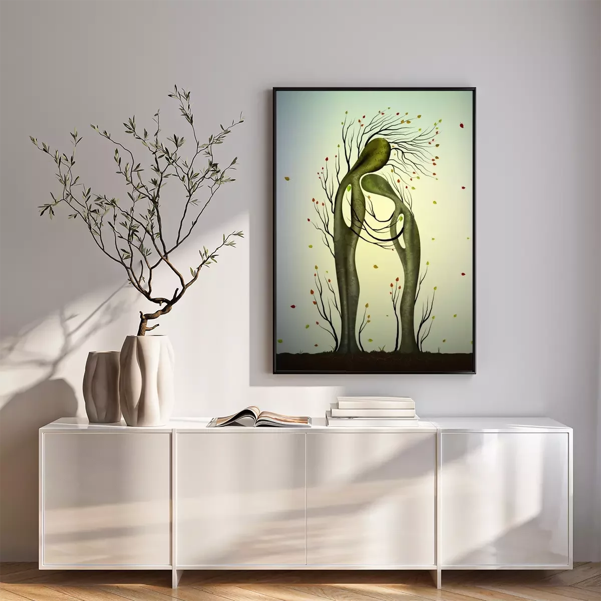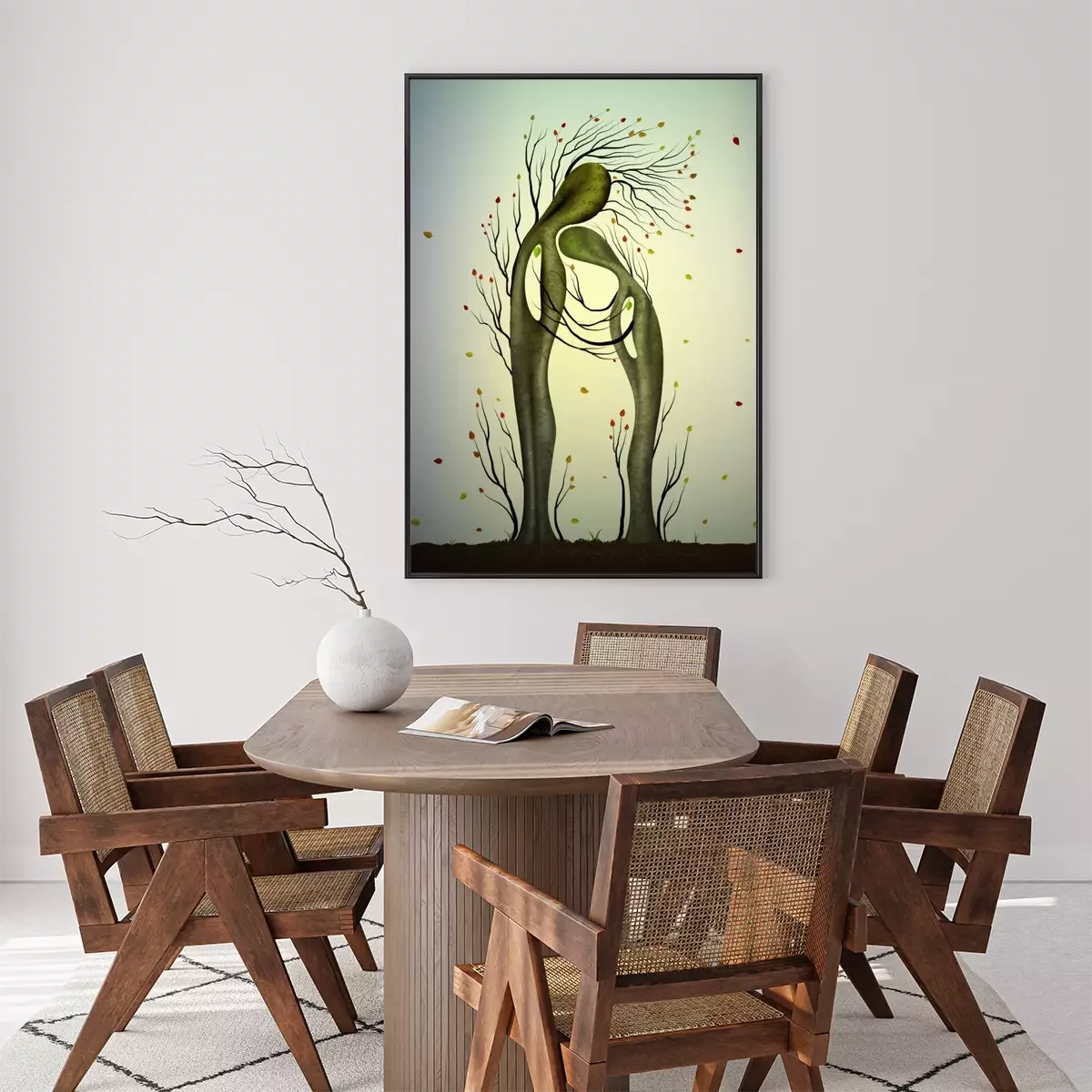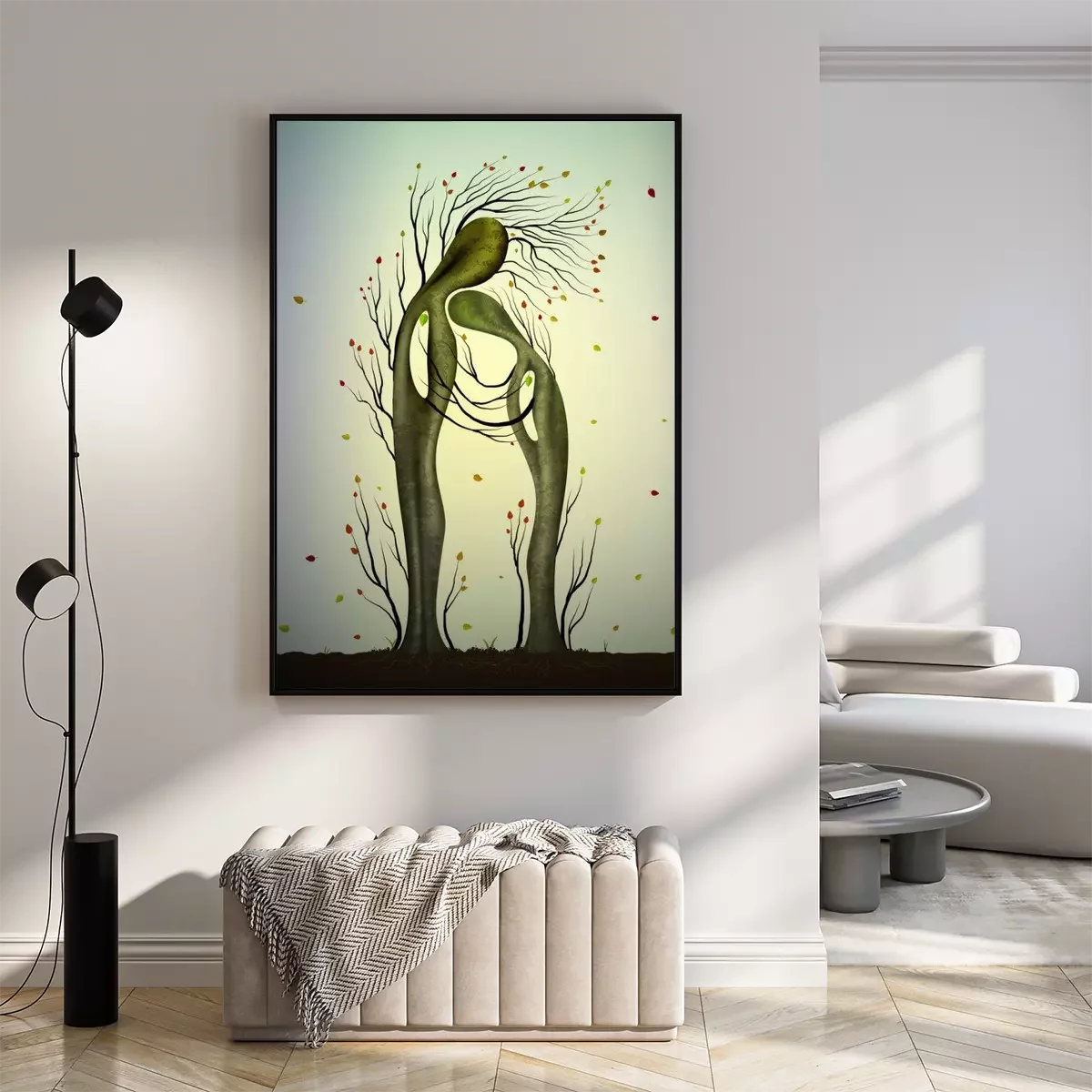 Poster: Twee verliefde bomen lijken op man en vrouw, boomknuffel, familieconcept, ouder worden, herfstboomgevoelens,