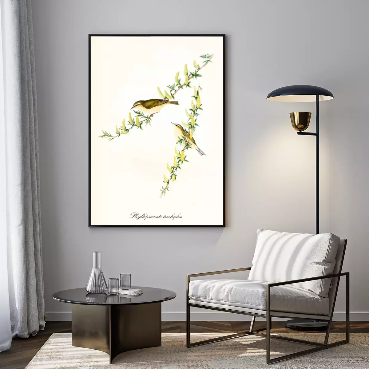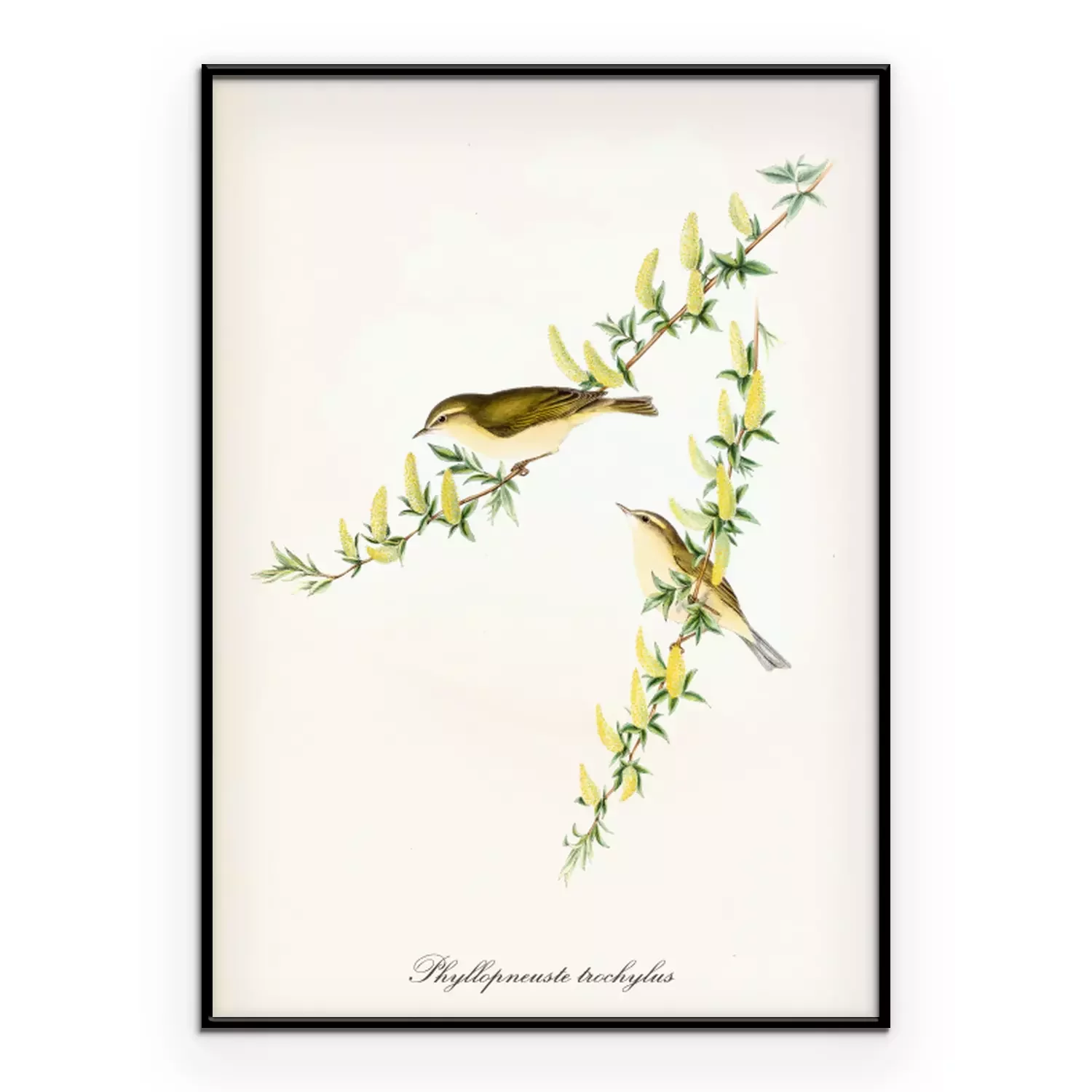 Two little cute brownish birds on a blade of grass. Old detailed and colorful illustration of Sedge Warbler (Acrocephalus schoenobaenus). By John Gould publ. In London 1862 - 1873