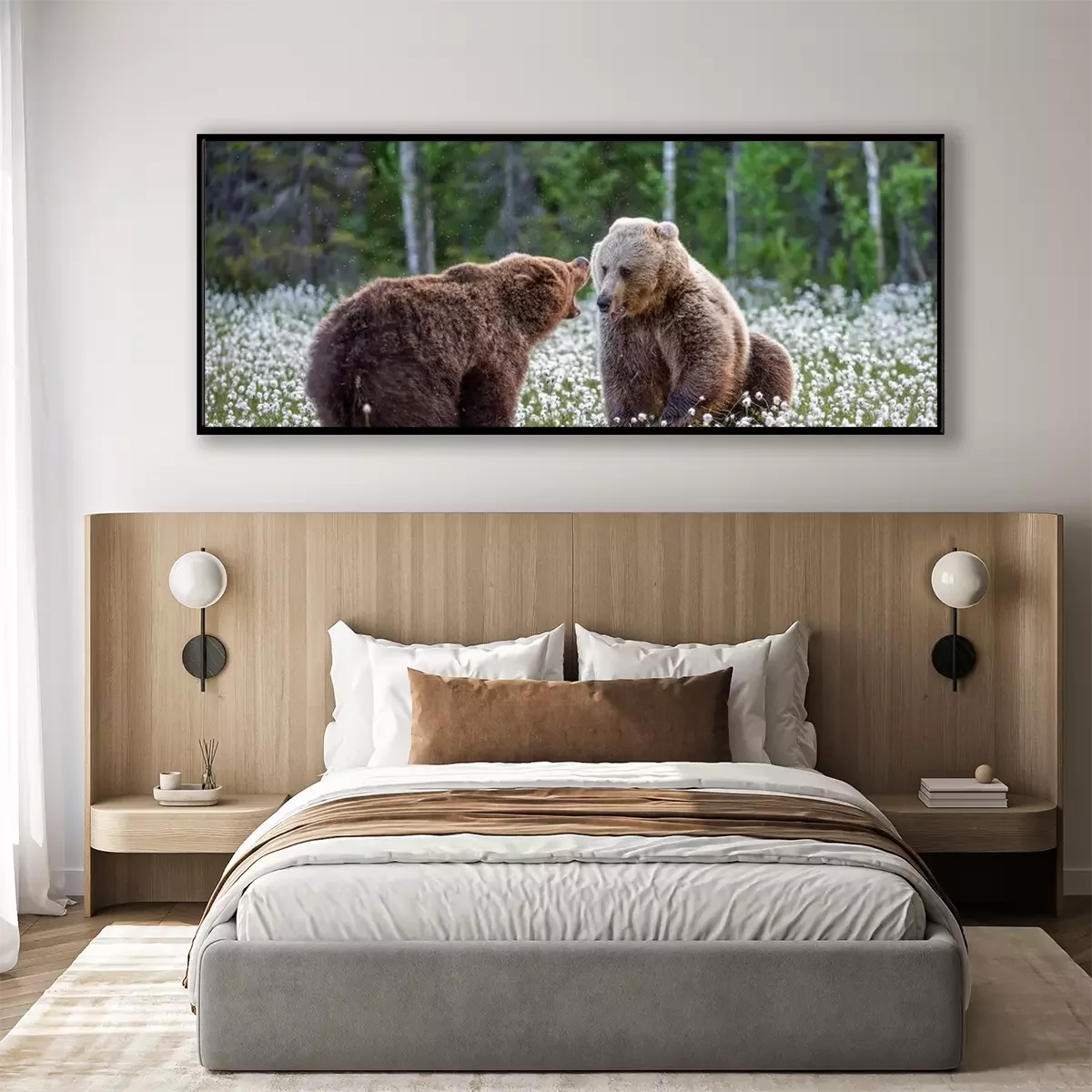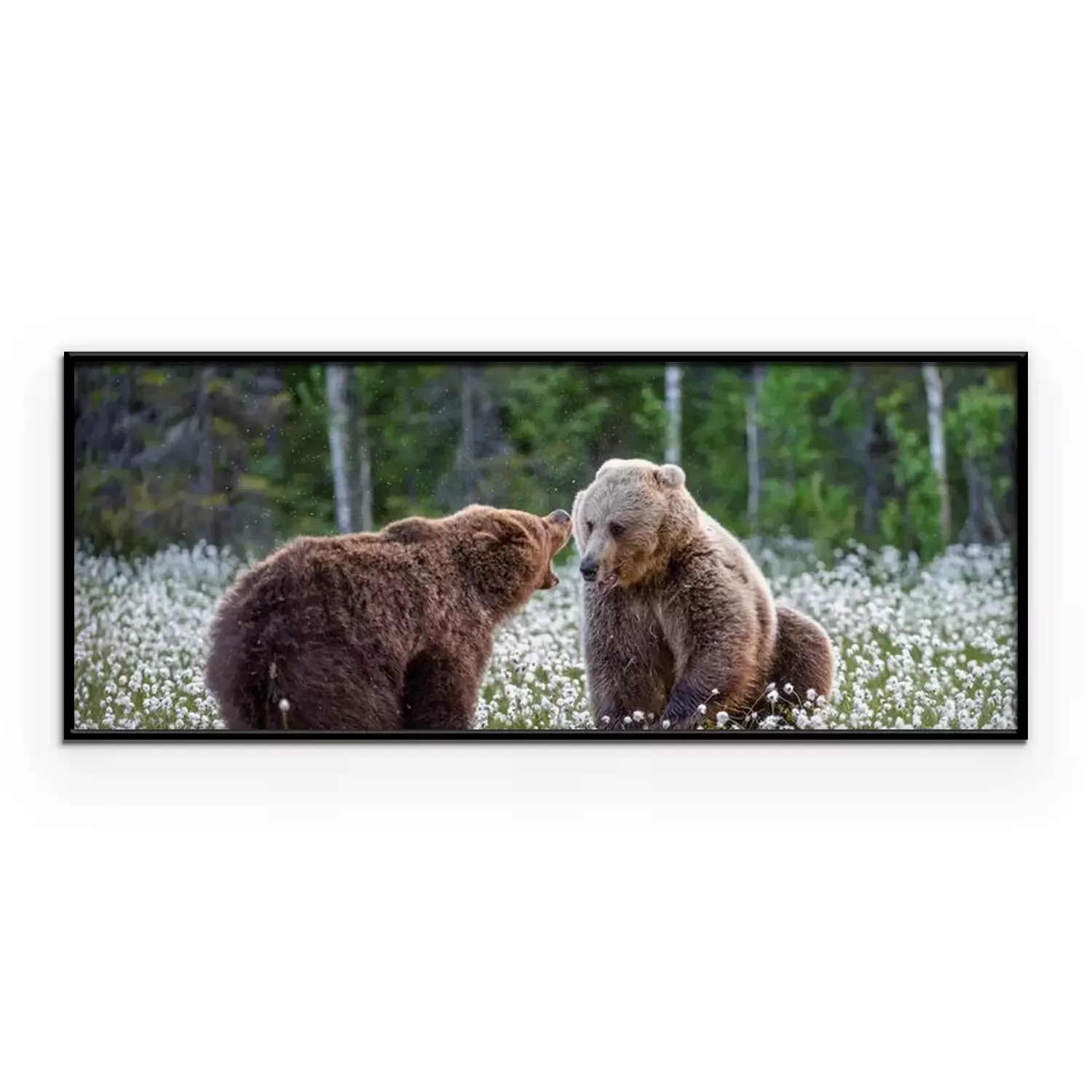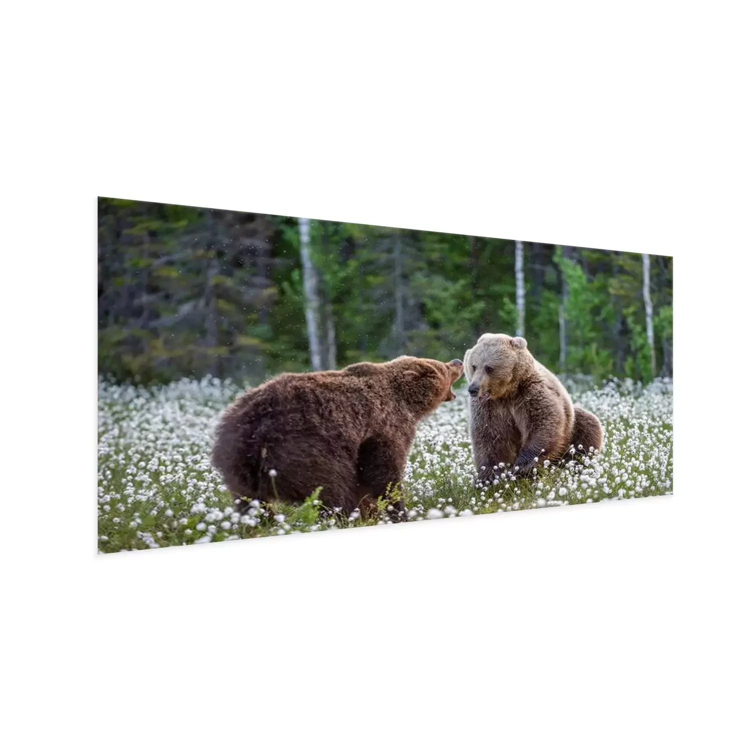 Poster Two bears fighting in summer forest, among white flowers. Scientific name: Ursus Arctos.