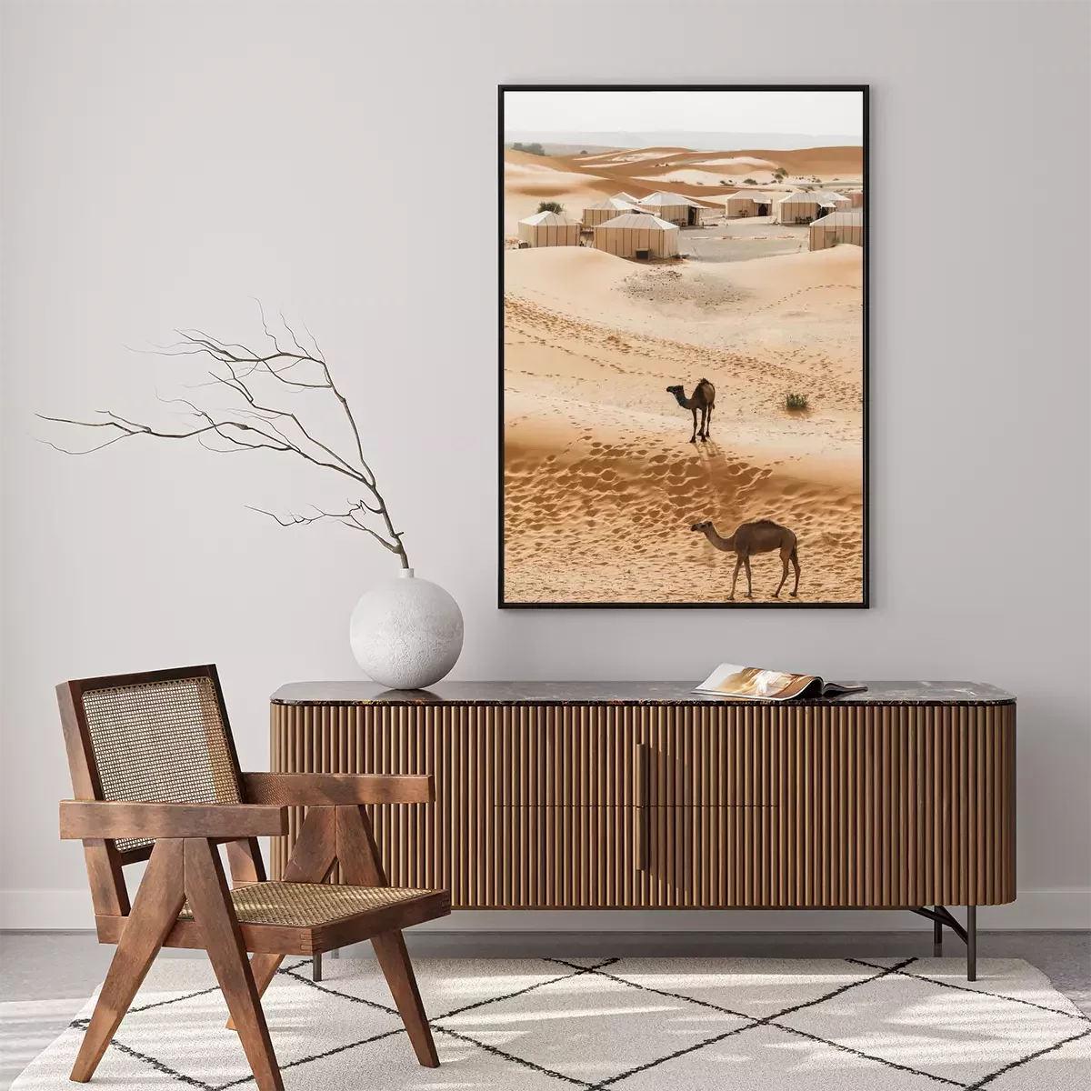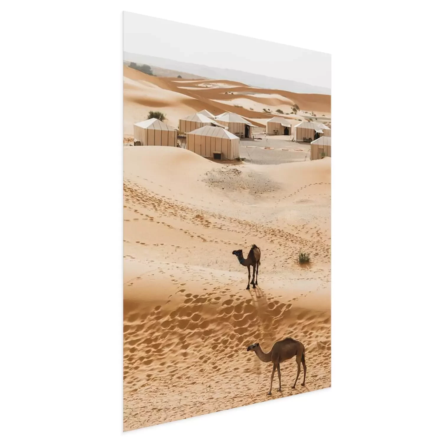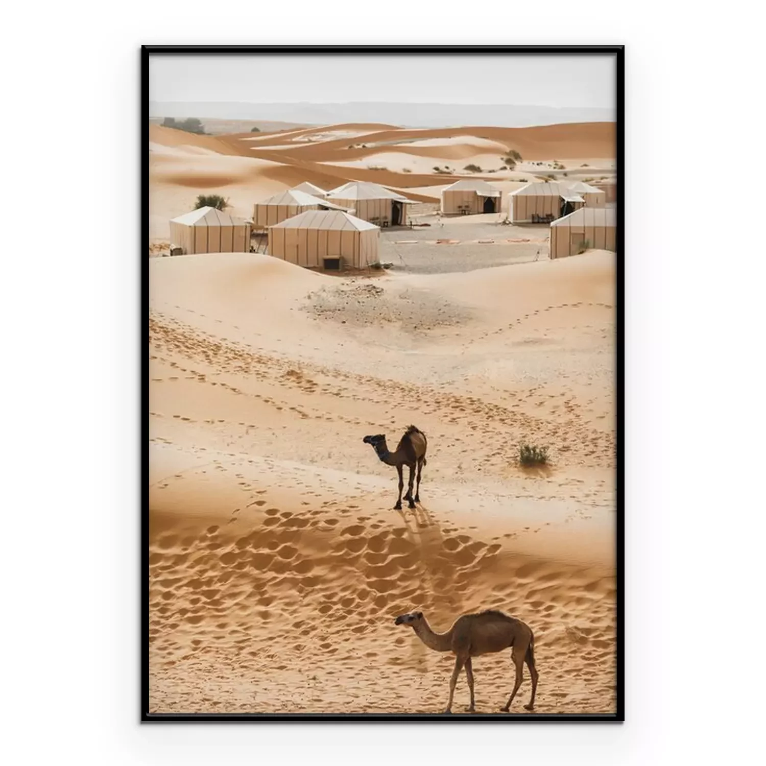 Poster: Two camels near contemporary luxury glamping camp in Morocco Sahara desert. Sand dunes around. Many white modern eco tents.