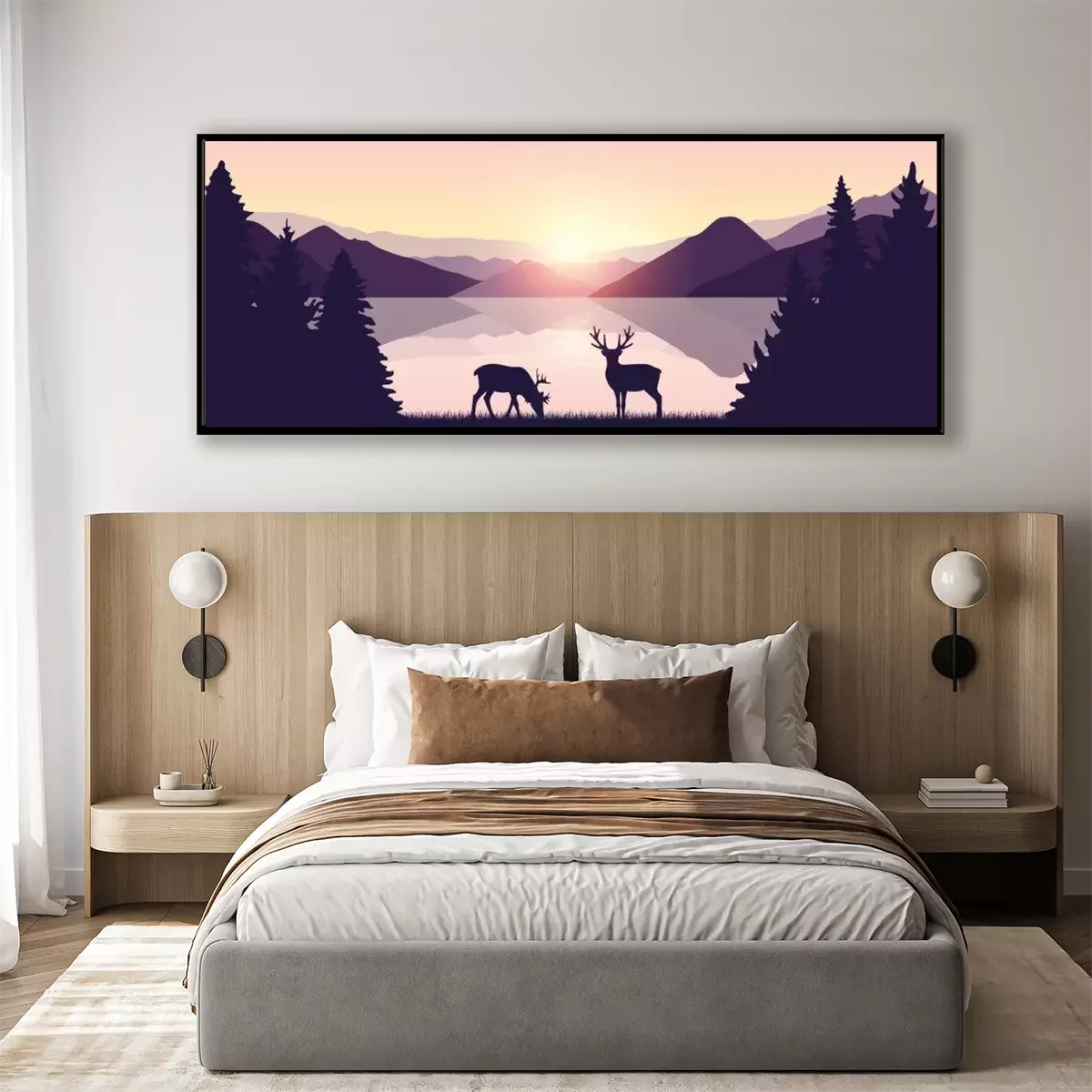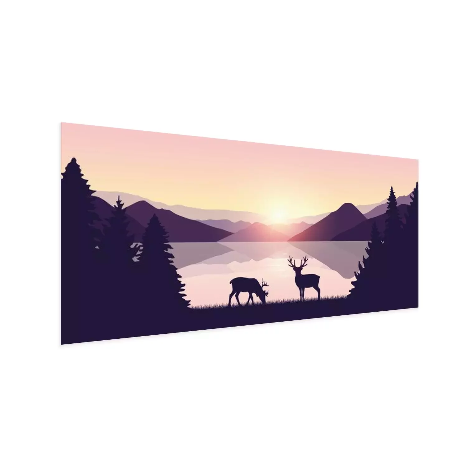Poster: two reindeers by the lake at sunrise wildlife nature landscape vector illustration EPS10