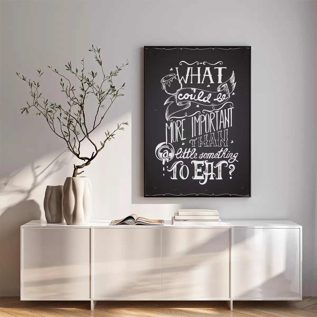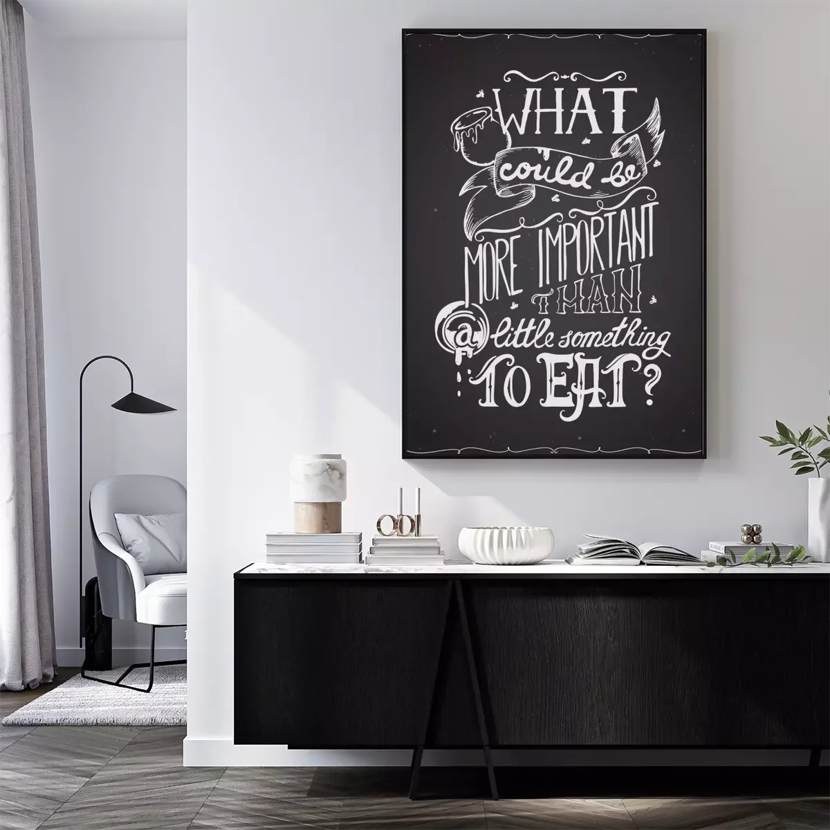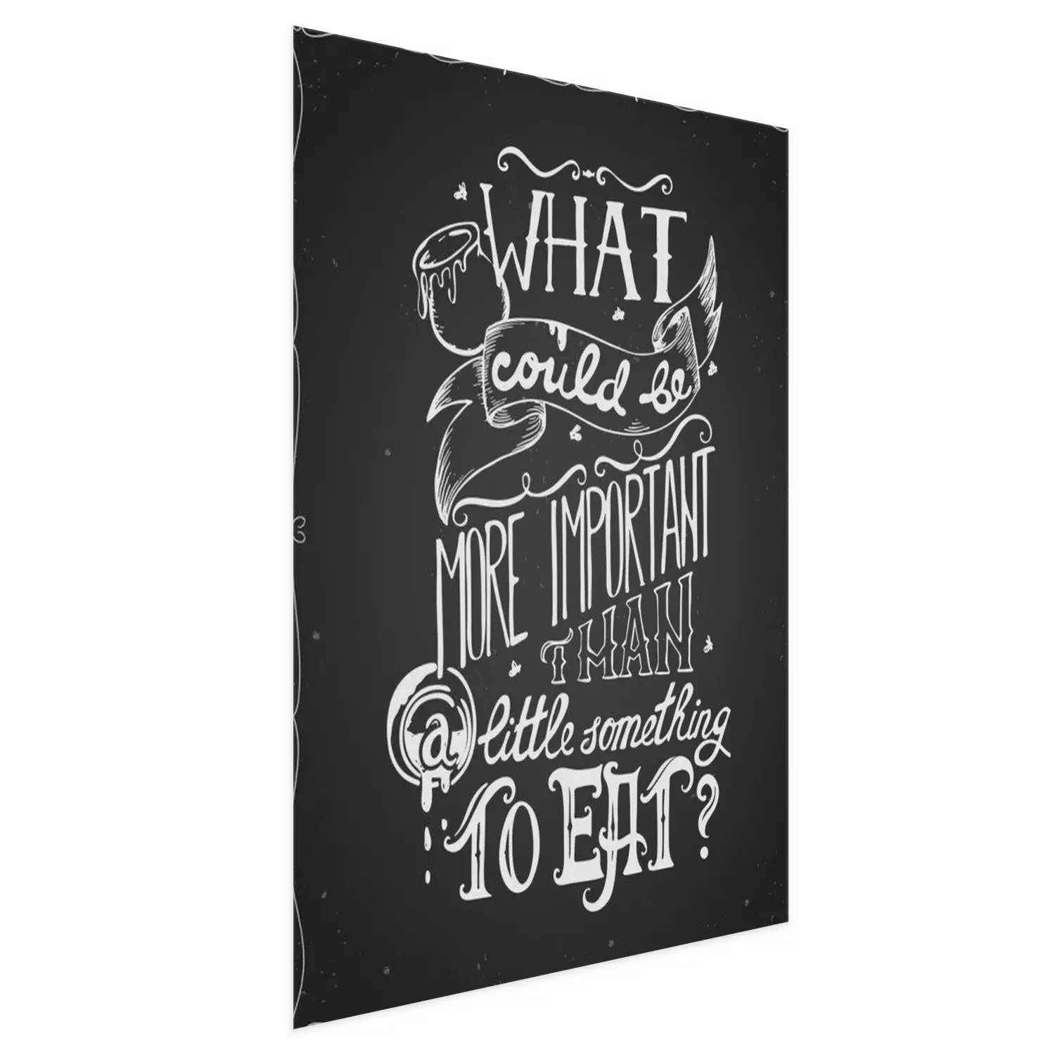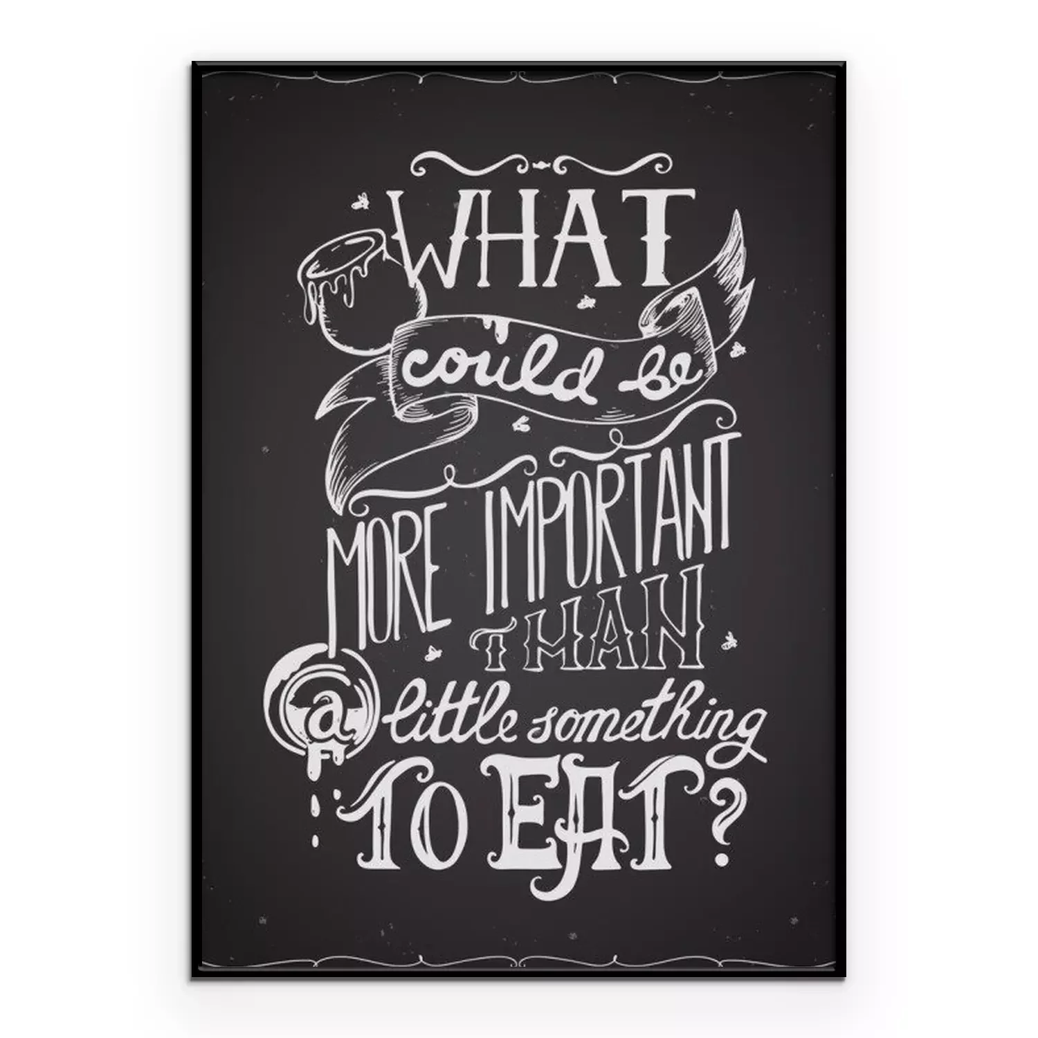 Poster: Typografie poster citaat met hand getrokken belettering en decoratieve elementen. Wat is belangrijker dan een beetje iets om te eten. Conceptontwerp voor t-shirt, print, kaart. Vector illustratie