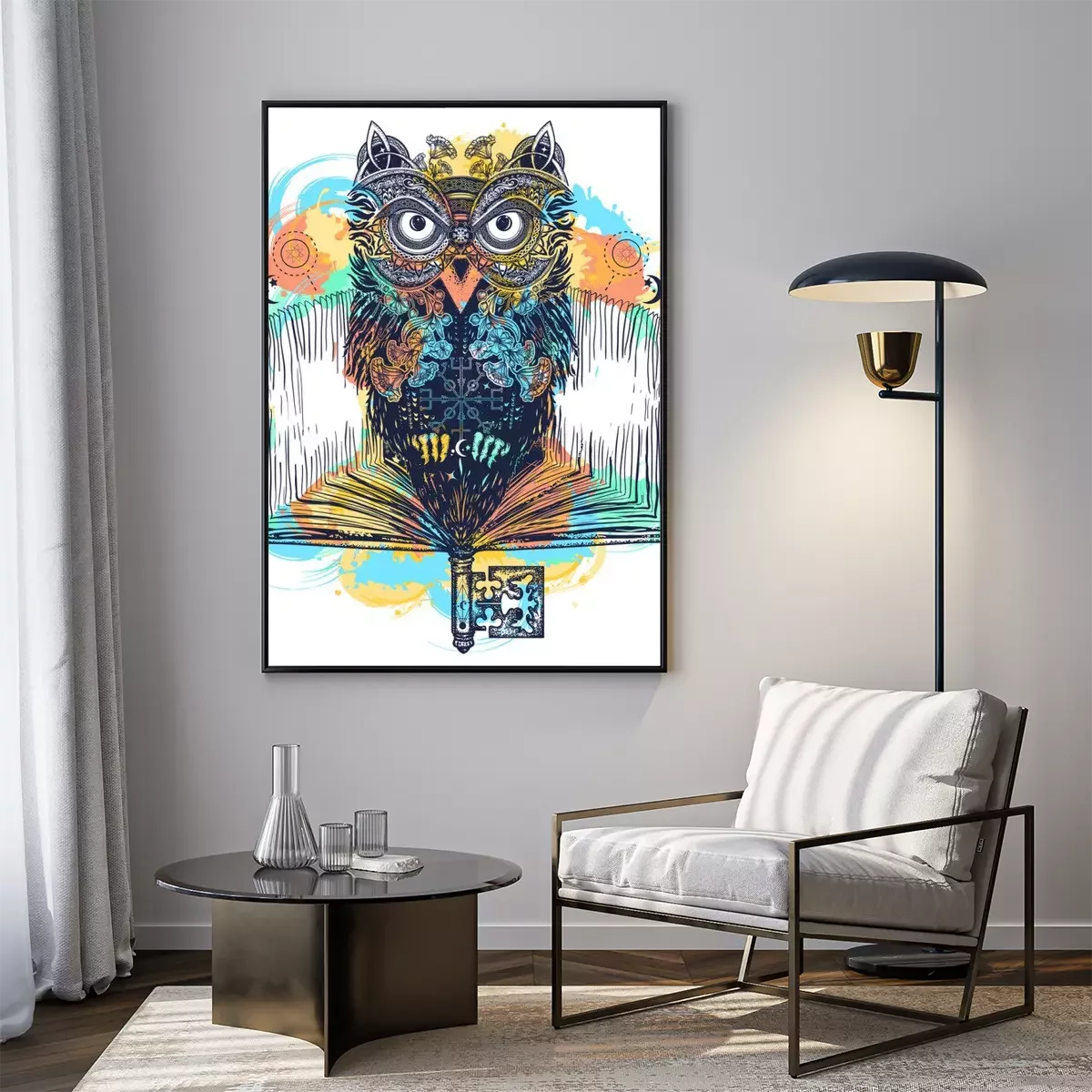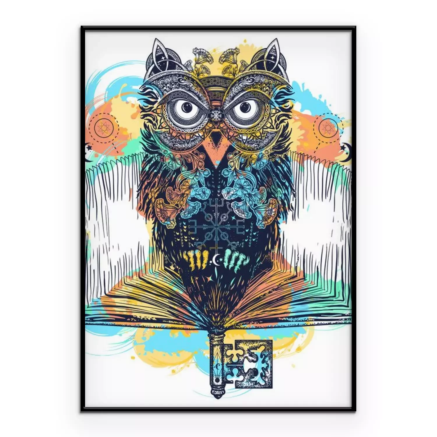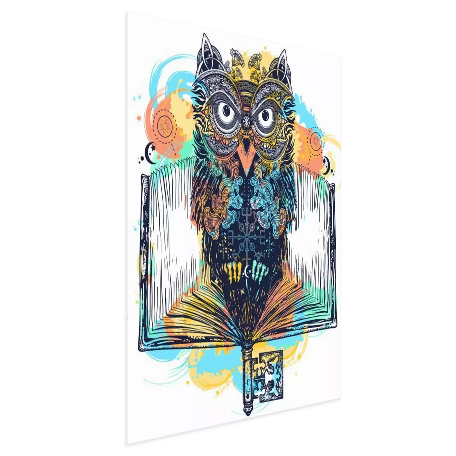 Poster: Uil en open boek tatoeage en t-shirt ontwerp aquarel spatten stijl. Symbool van onderwijs, literatuur, poëzie, wijsheid, lezen. Open boek, vintage sleutel en magische uil