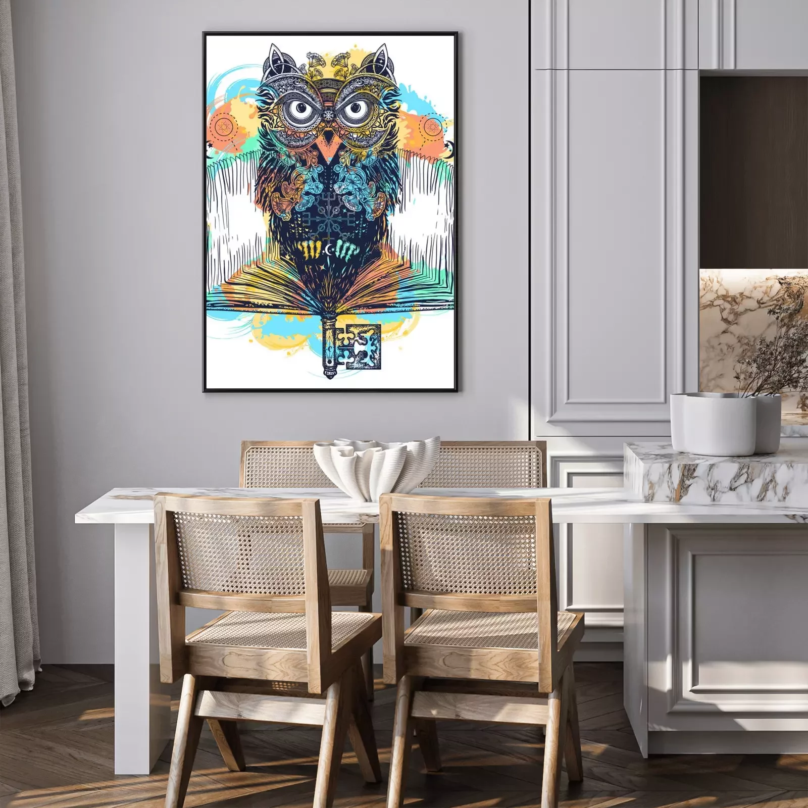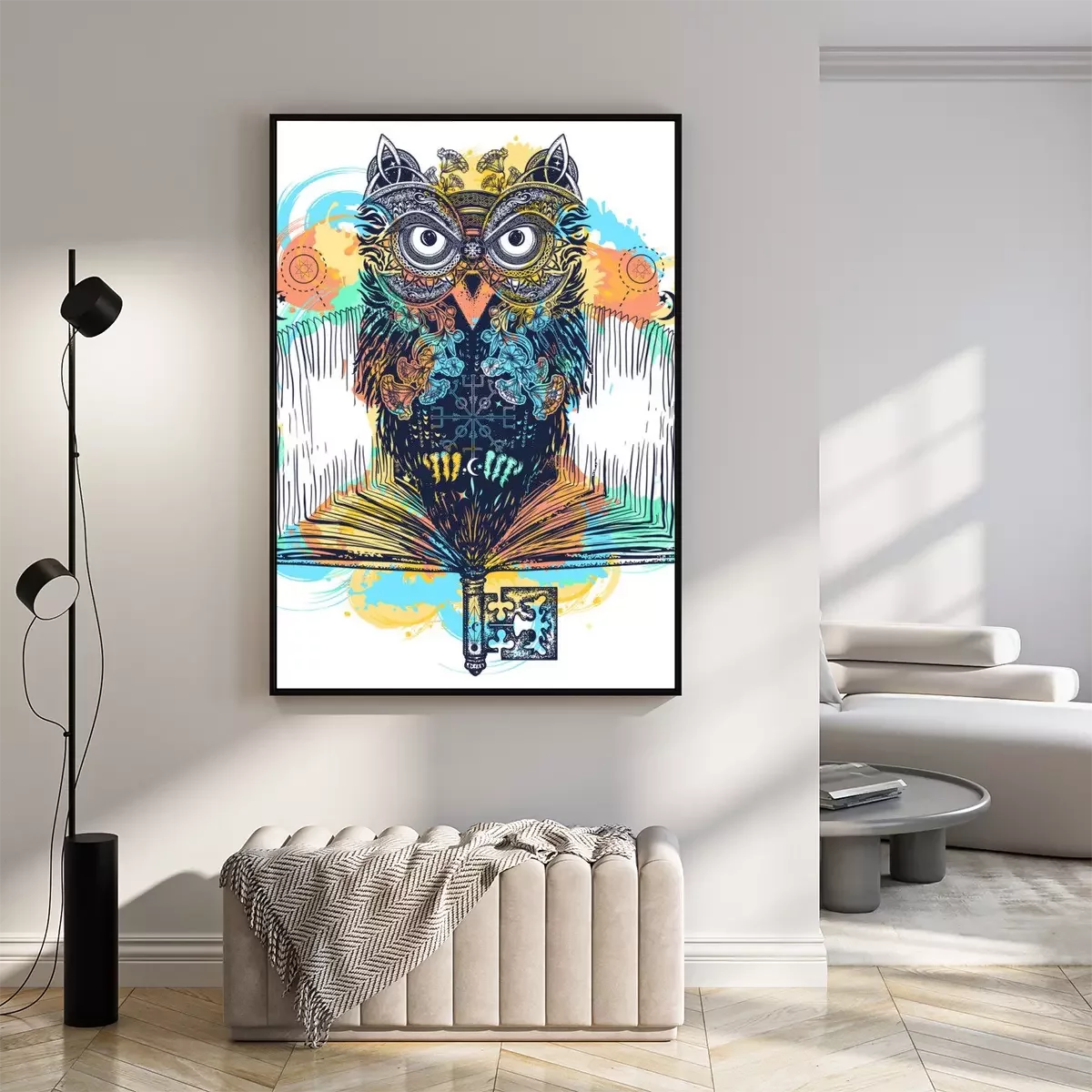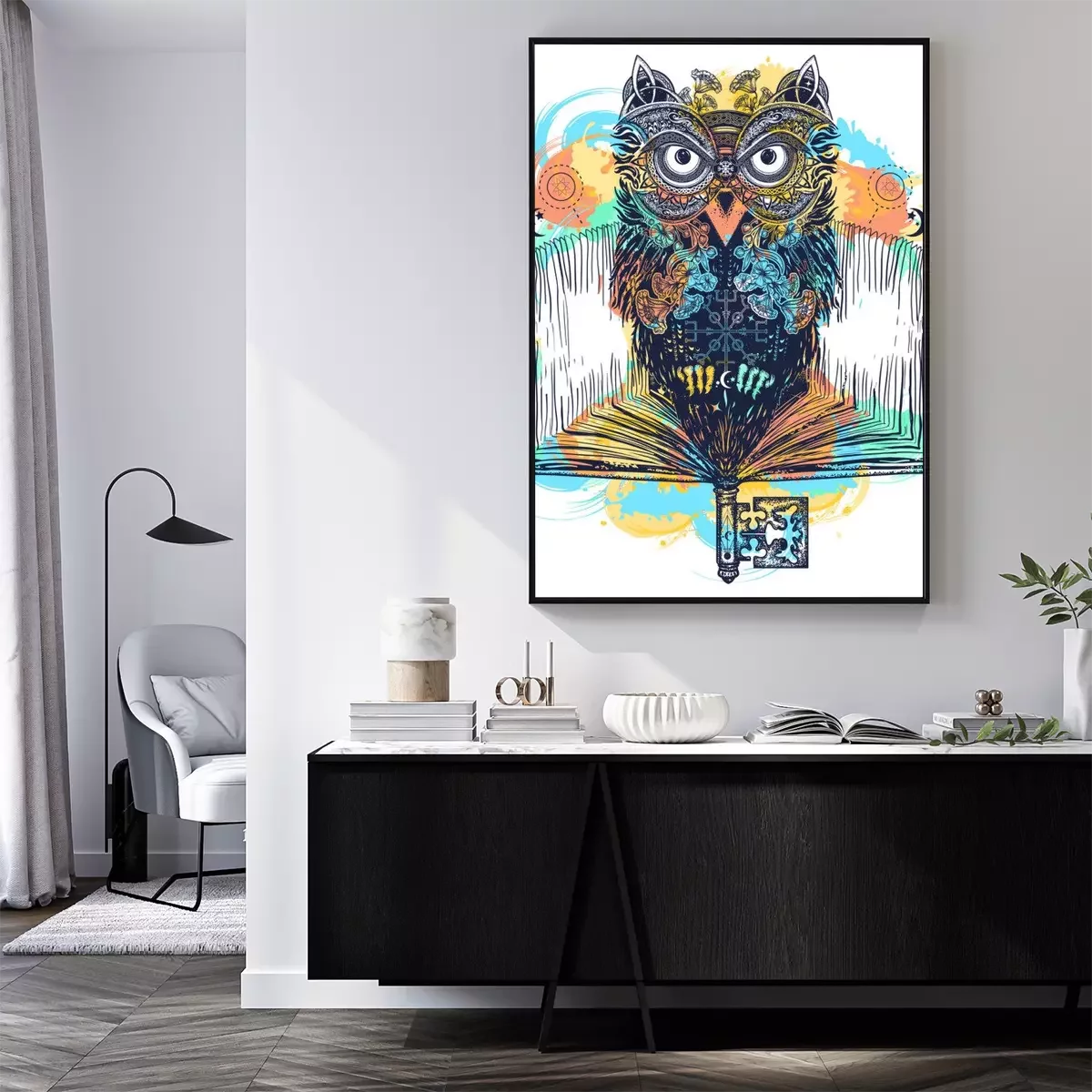 Poster: Uil en open boek tatoeage en t-shirt ontwerp aquarel spatten stijl. Symbool van onderwijs, literatuur, poëzie, wijsheid, lezen. Open boek, vintage sleutel en magische uil