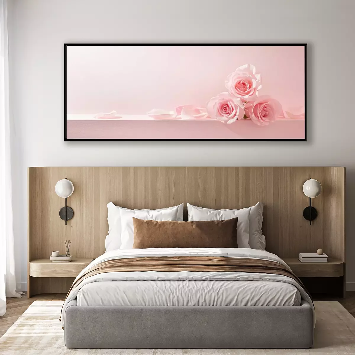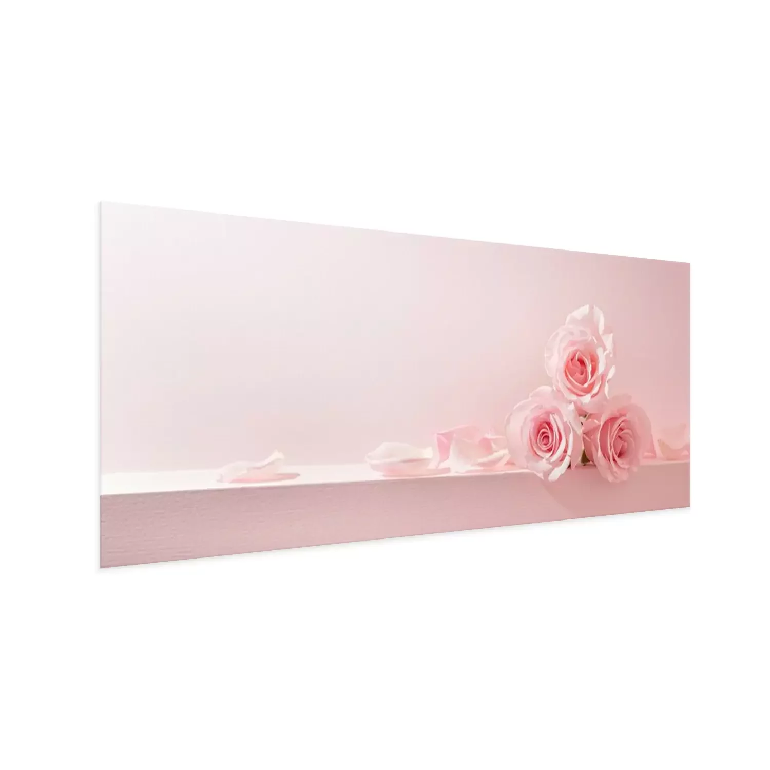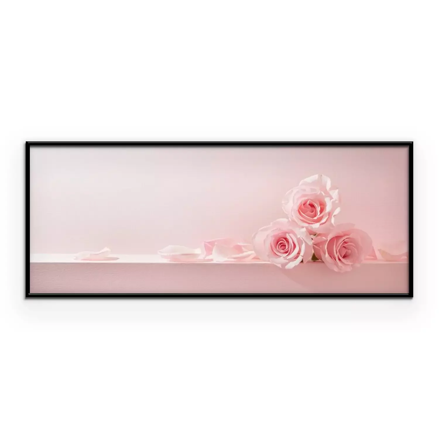 Poster: Uitgevouwen rozen en bloemblaadjes op een roze standaard