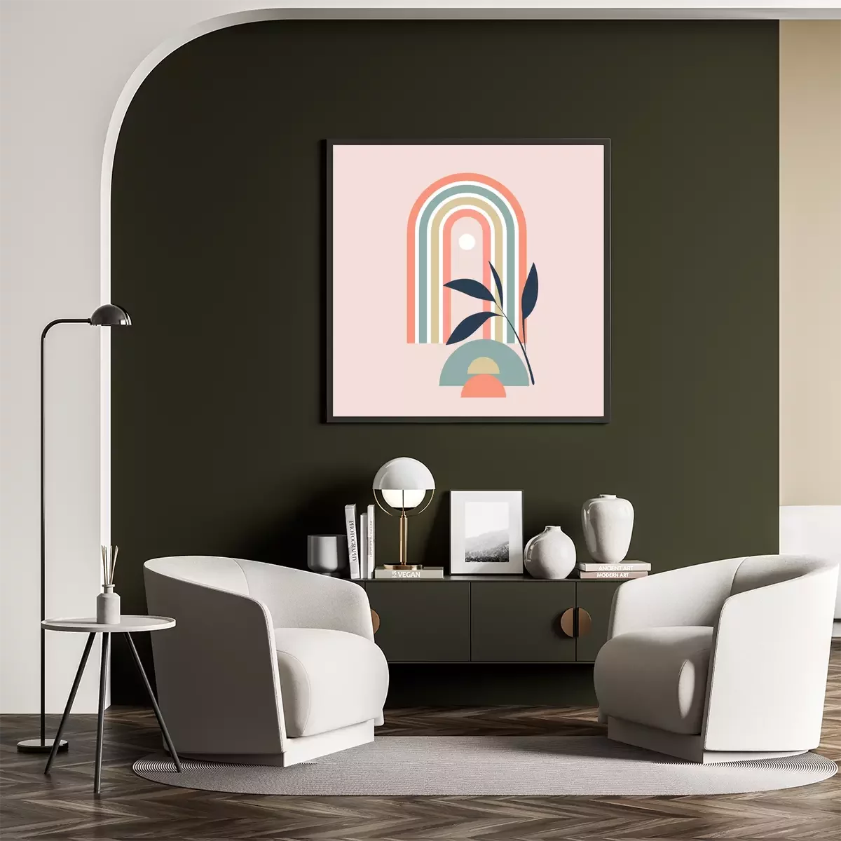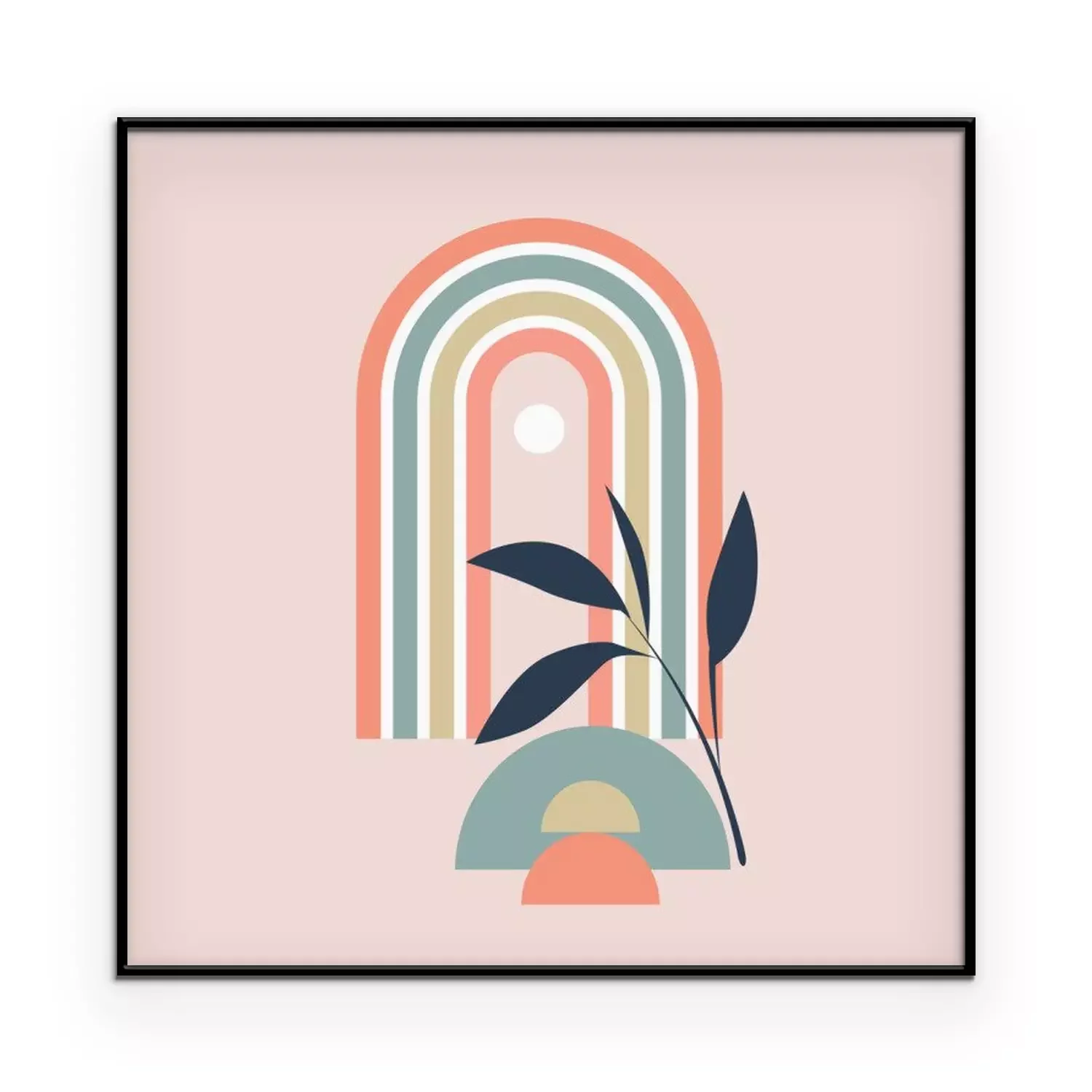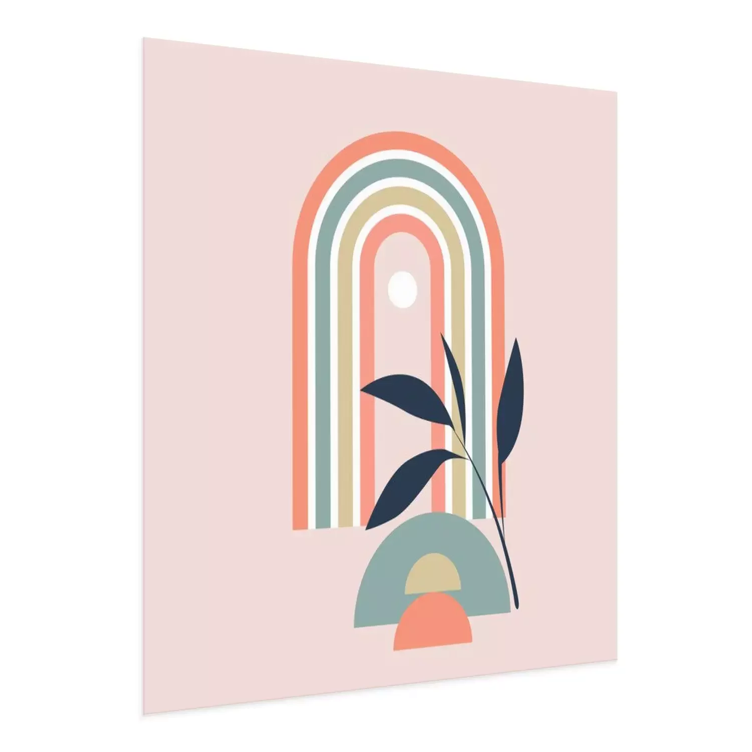 Poster: vector illustration of pastel rainbow with geometric element and plant sprig on pink background, boho style