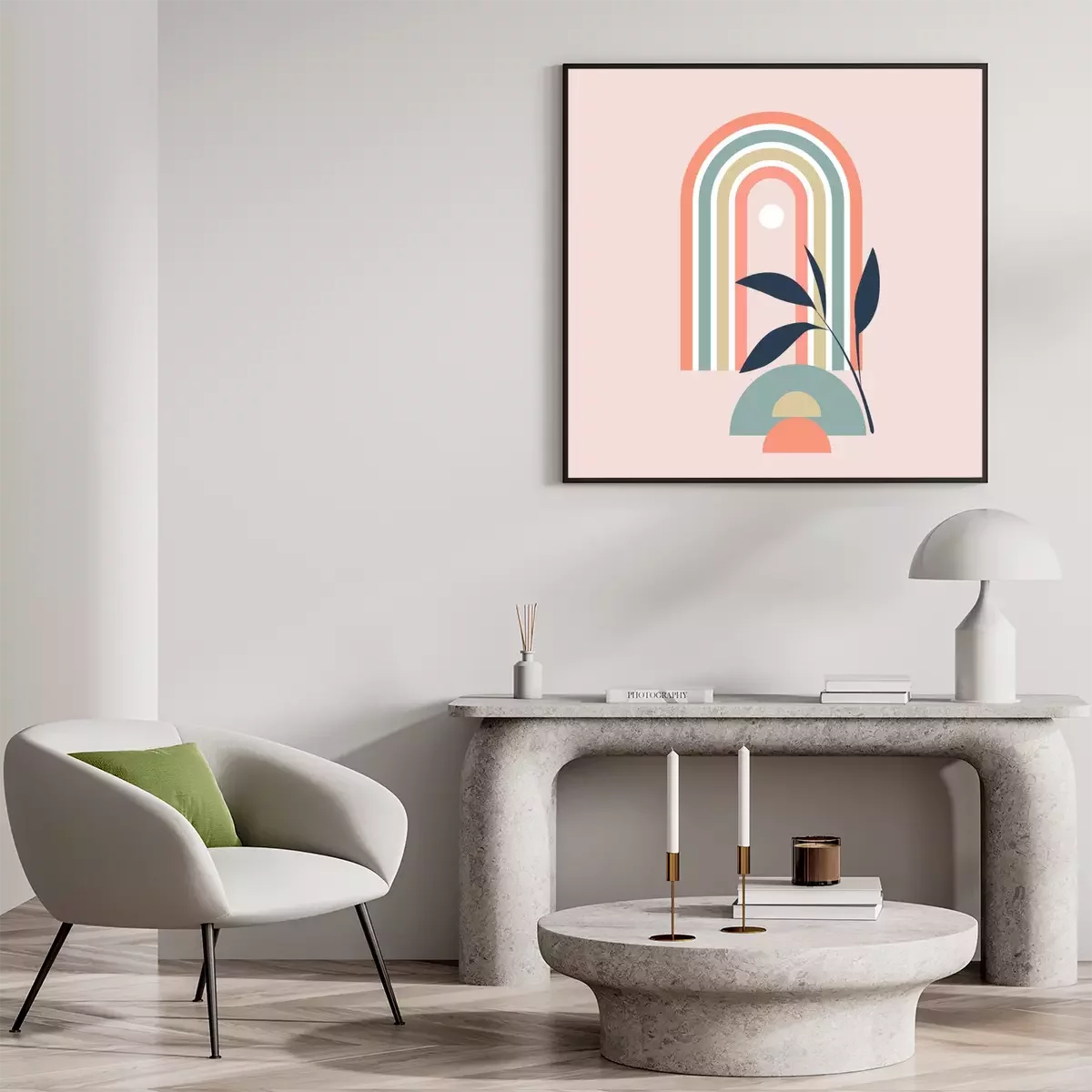 Poster vector illustration of pastel rainbow with geometric element and plant sprig on pink background, boho style