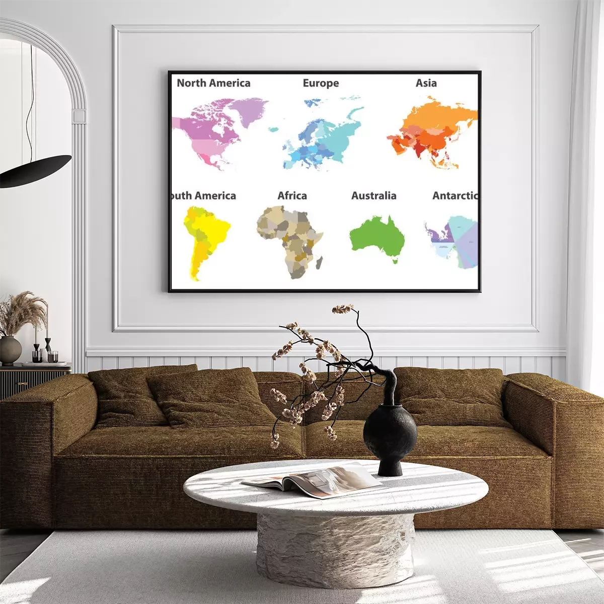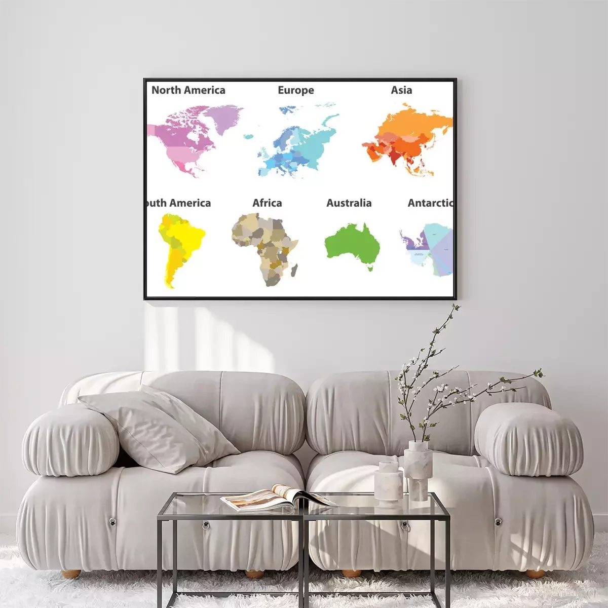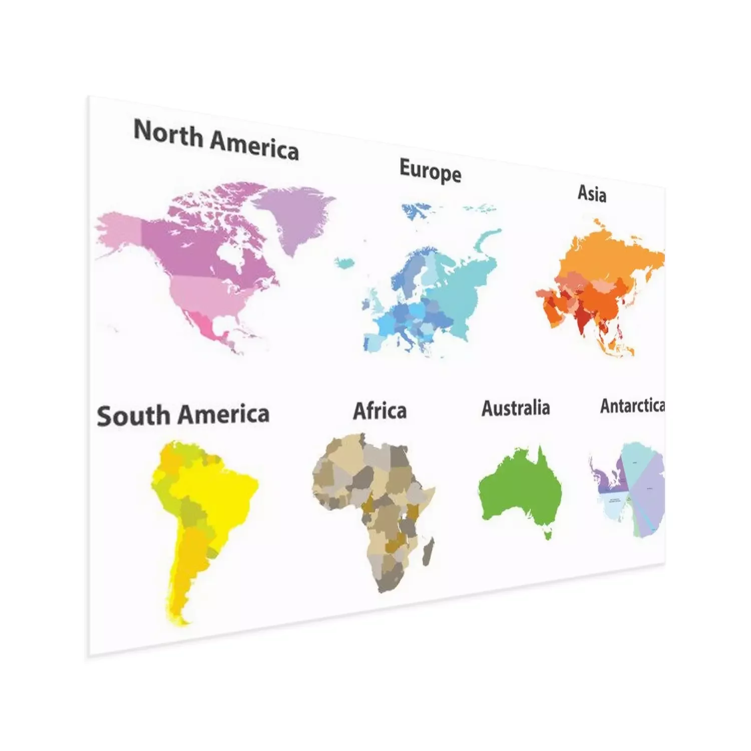 wereldstad lichtkaart met geëtiketteerde continenten in verschillende kleuren en locatie-iconen