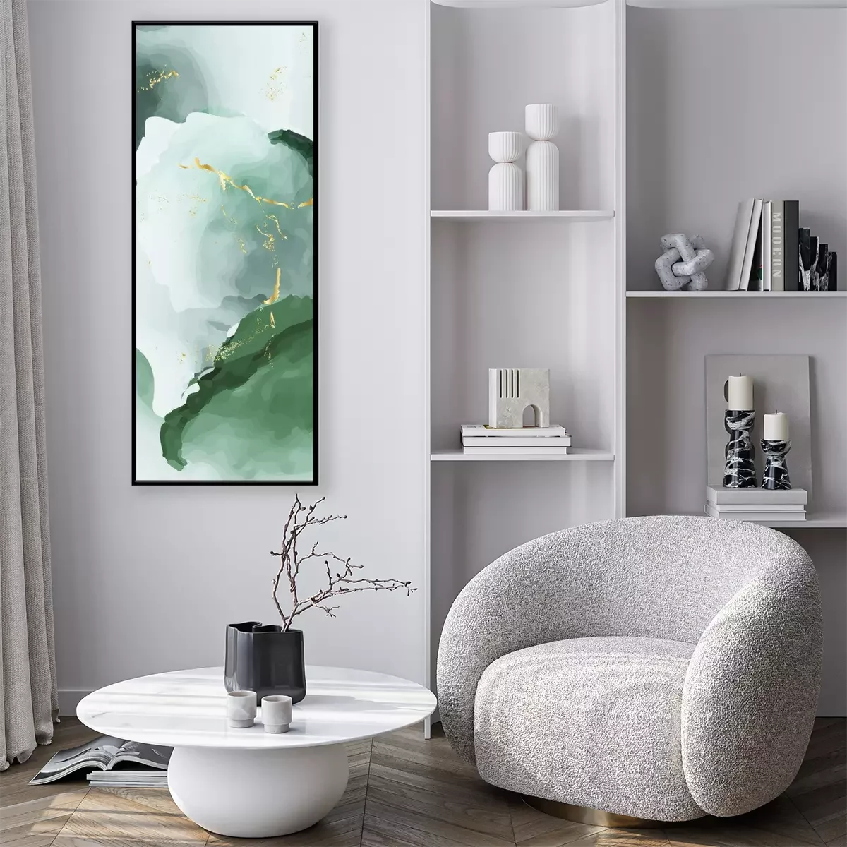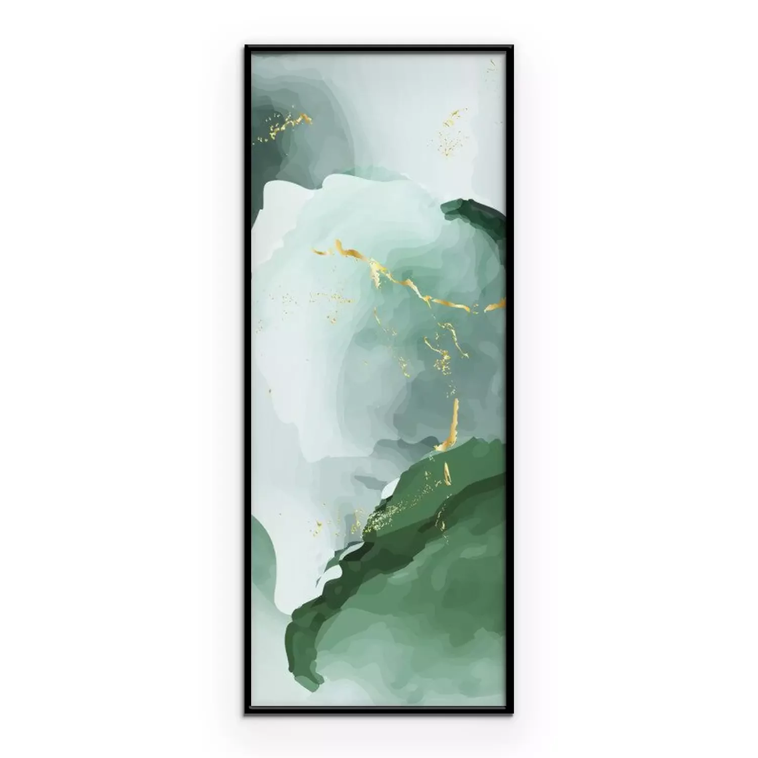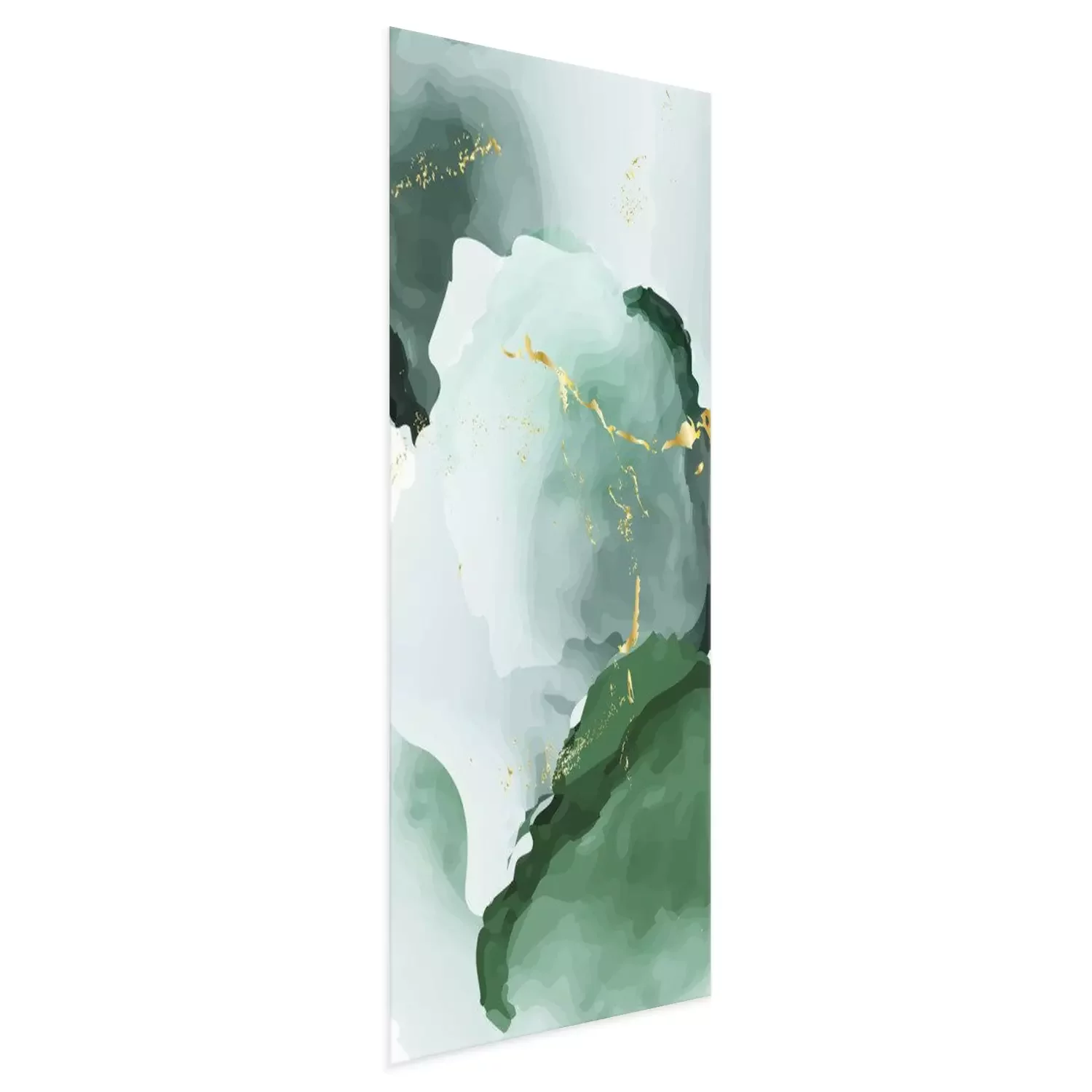 Poster Vector watercolor repetition liquid flow in green colors with gold glitters. Vector contrast alcohol ink grunge abstract background. Benner design template