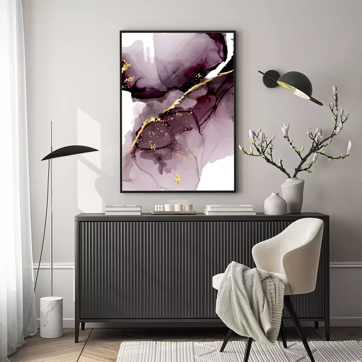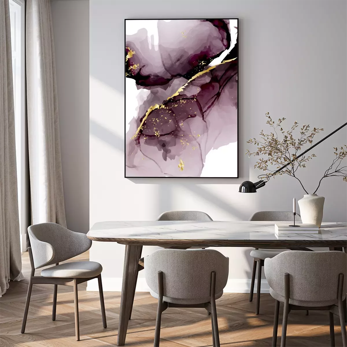 Poster: Vector watercolor repetition liquid flow in tender dark violet grey colors with gold glitters. Vector alcohol ink grunge abstract background. Wedding abstract decoration design.