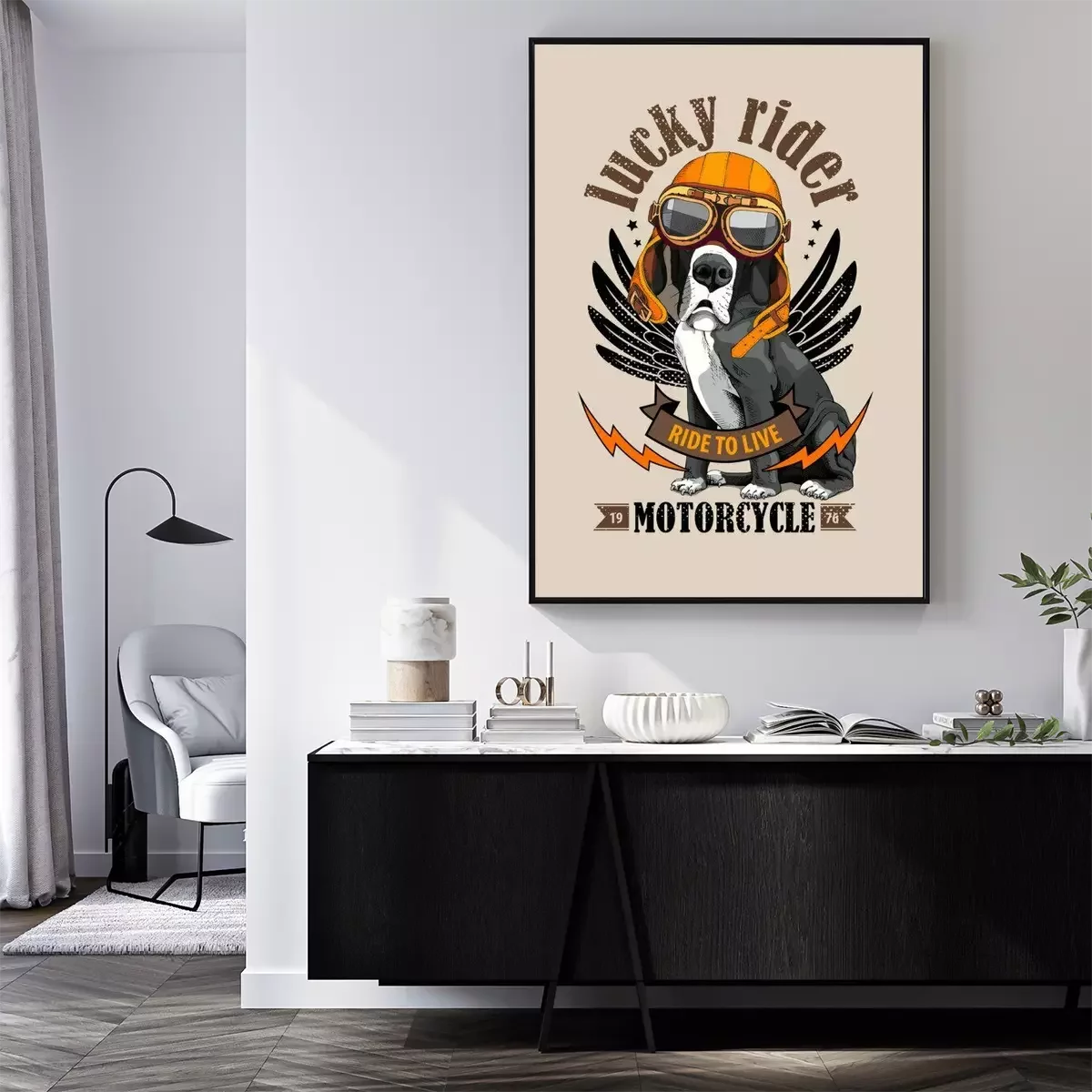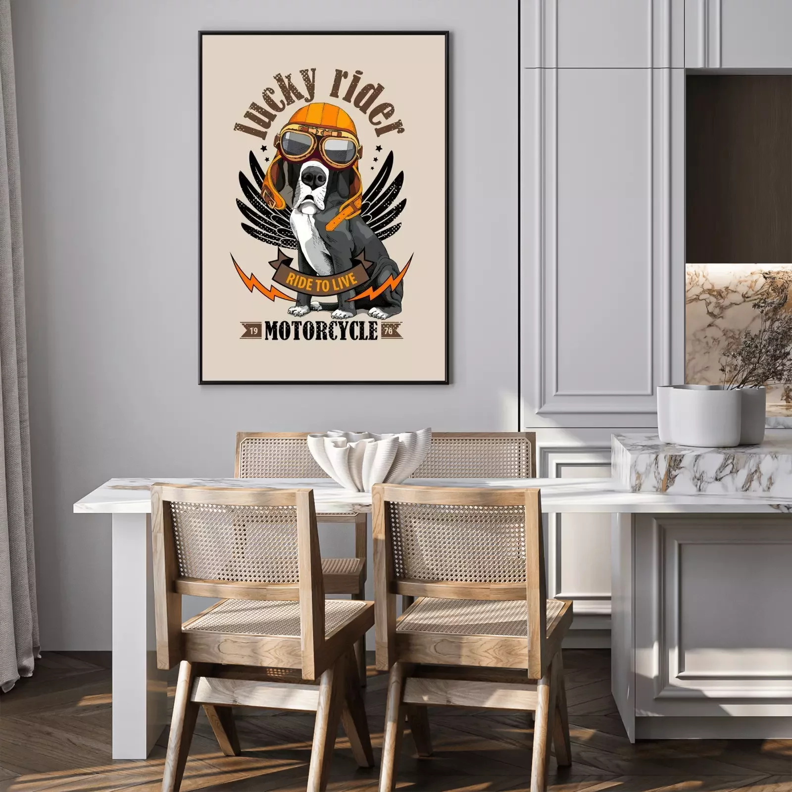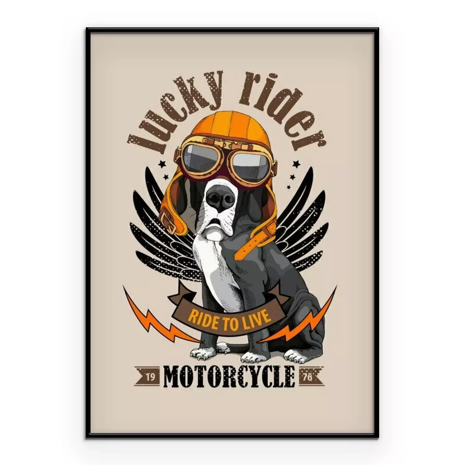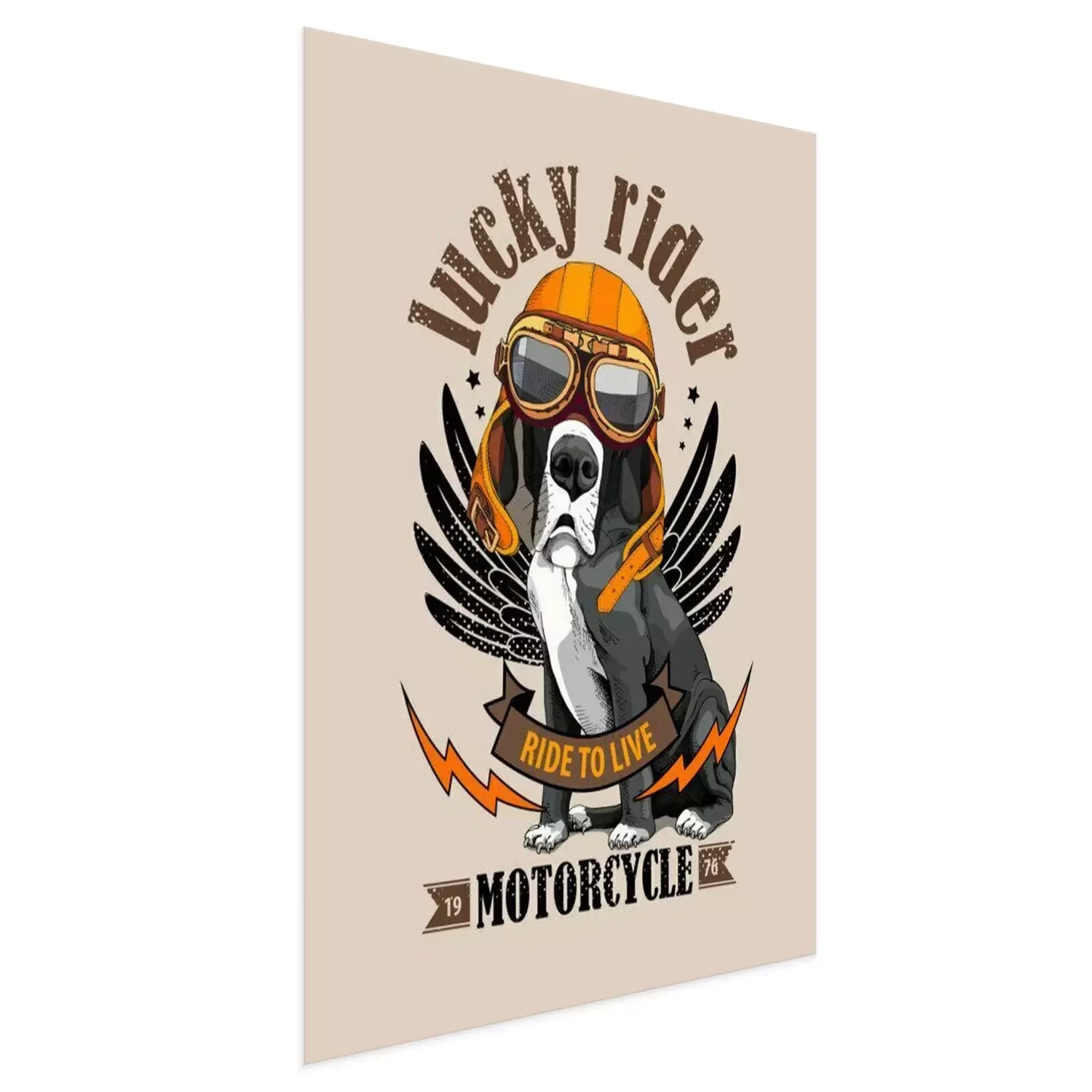 Poster: Vectorillustratie met Great Dane Dog in een fietserglazen en oranje helm op een beige achtergrond. Lucky rider - belettering citaat. Inspiratie poster, embleem ontwerp, hand getrokken stijl t-shirt af