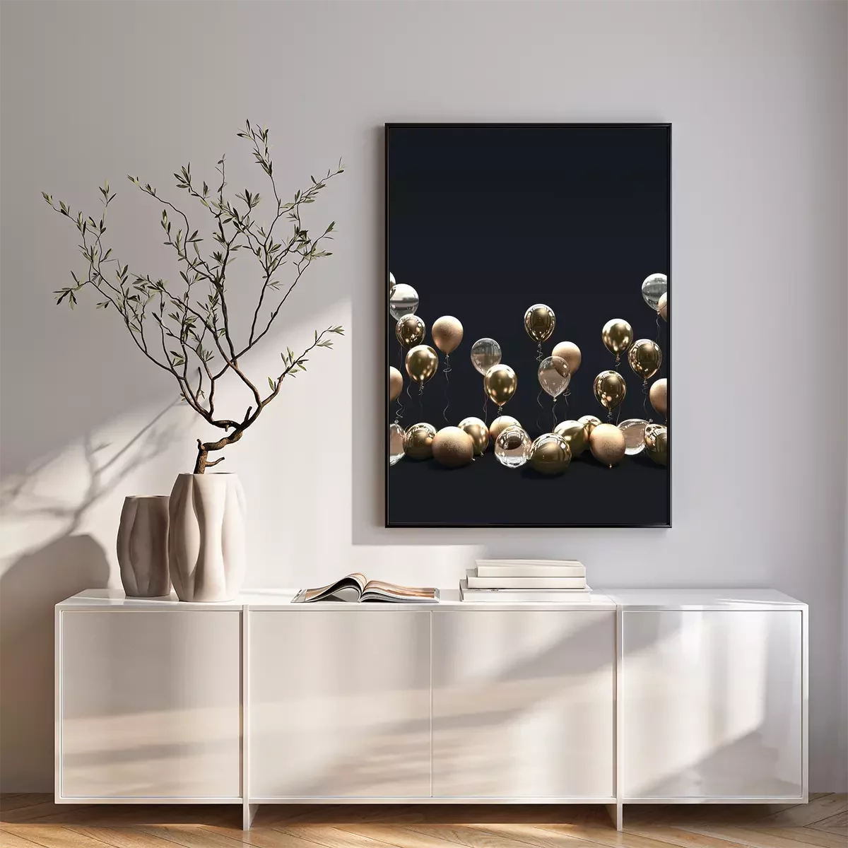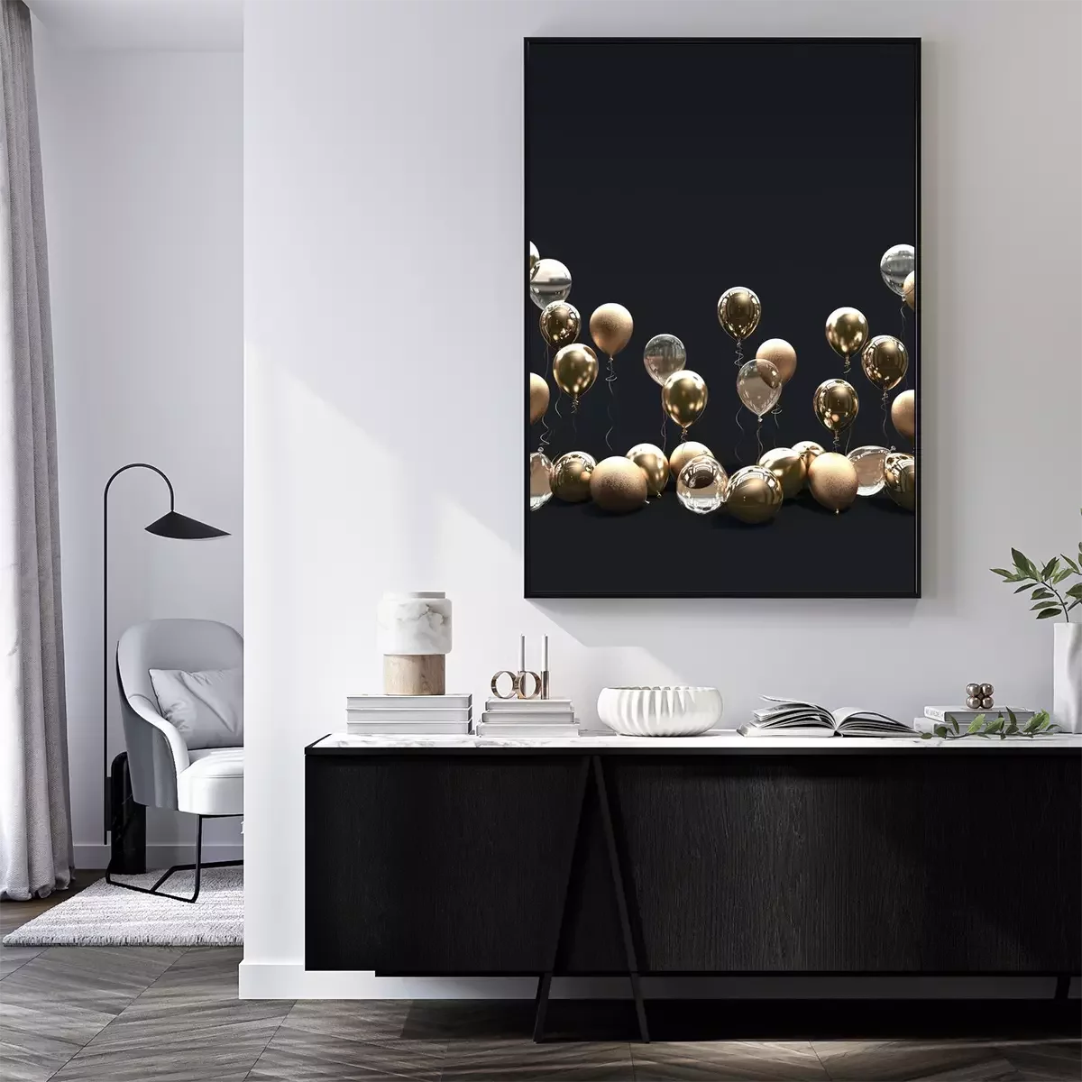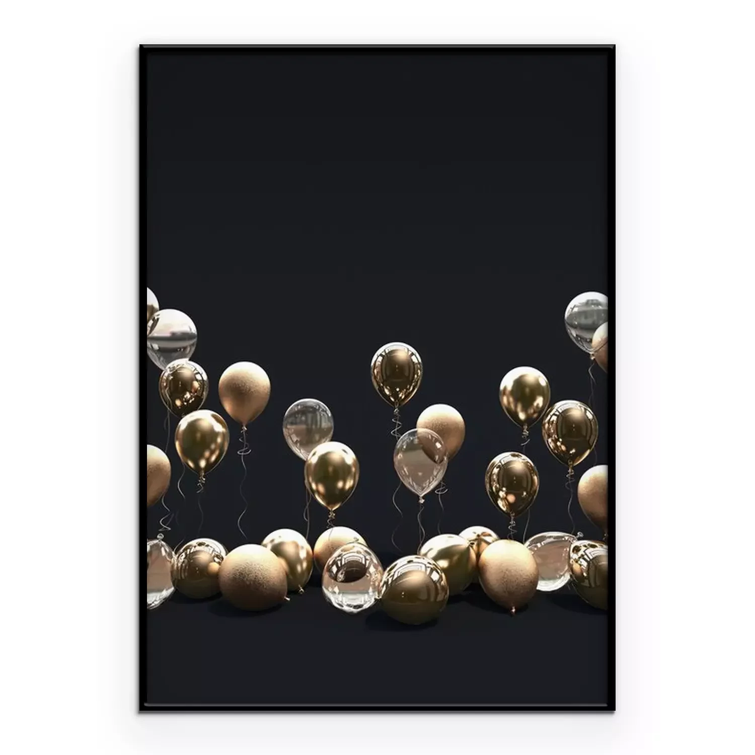 Poster Veel gouden ballonnen op een zwarte achtergrond. Matte, glanzende en transparante ballonnen. 3D render.