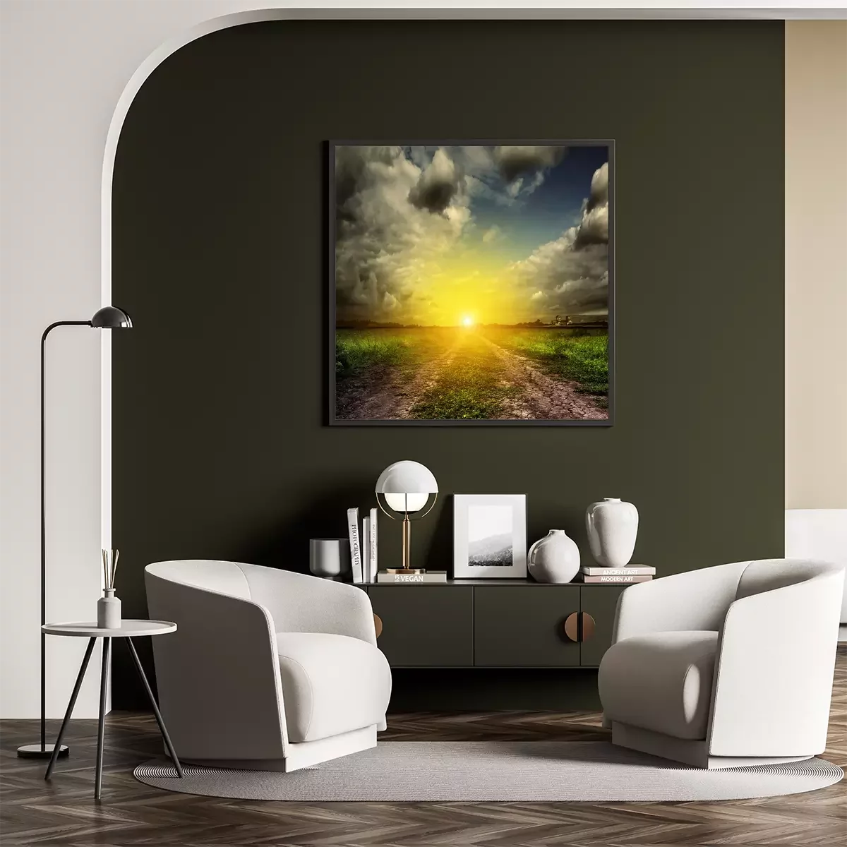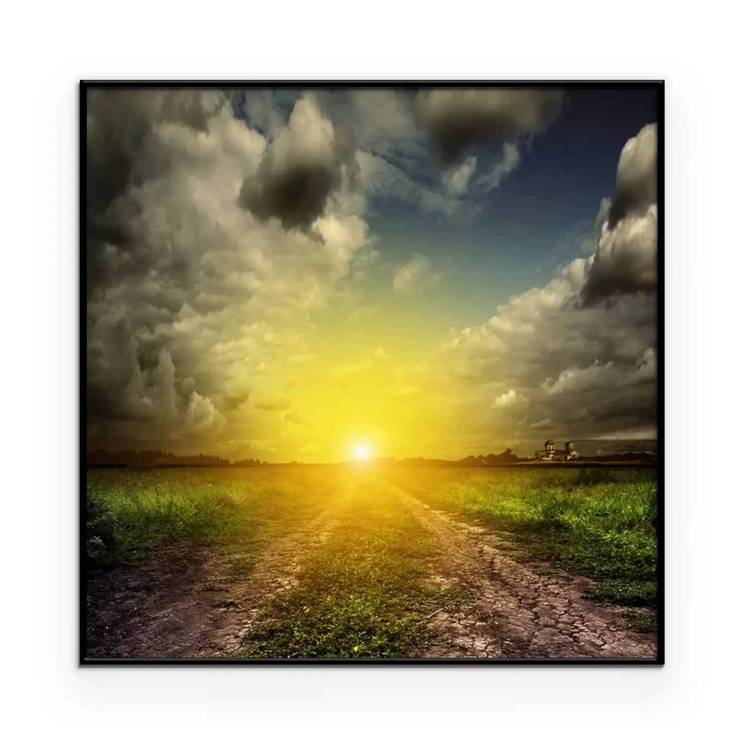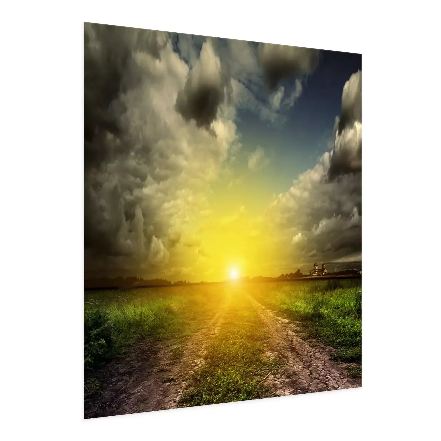Poster: Veldlandschap bij zonsondergang