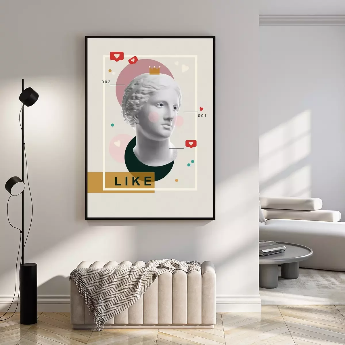 Fashion art collage with plaster antique sculpture of Venus face in a pop art style. Creative vogue concept image in contemporary surrealism style. Beauty, fashion and health theme. Zine culture.